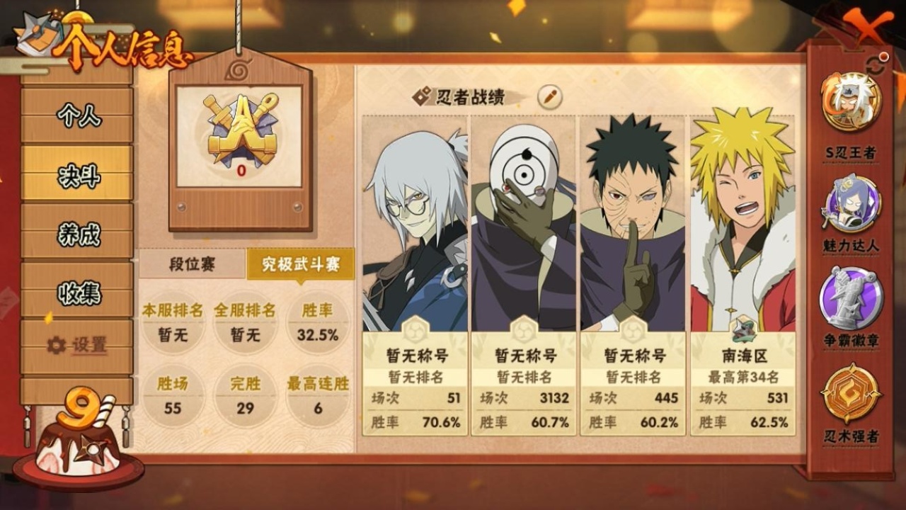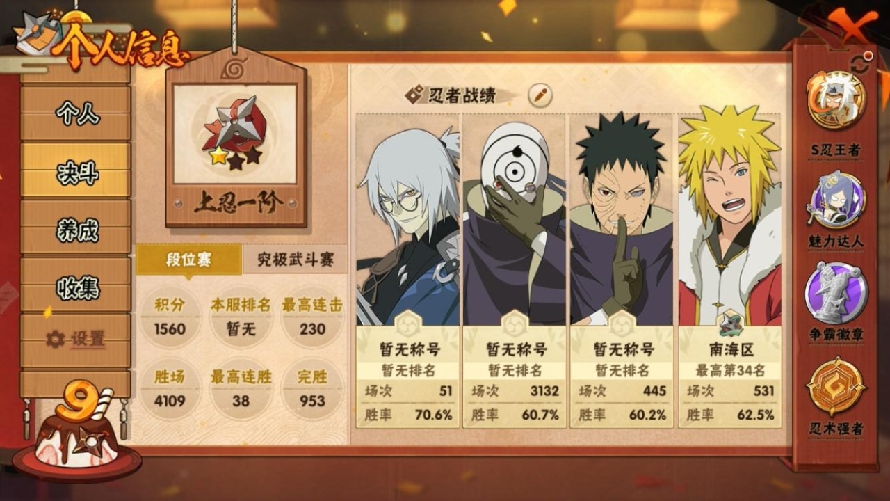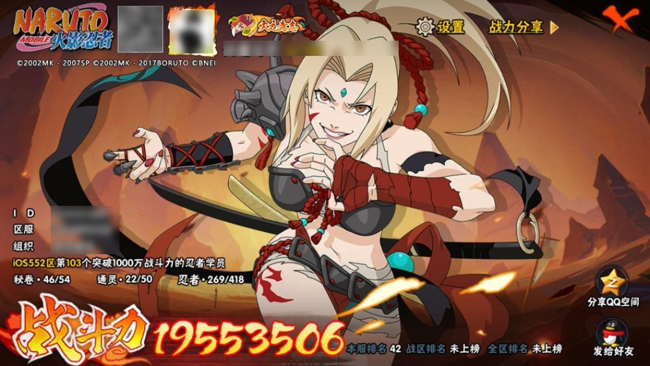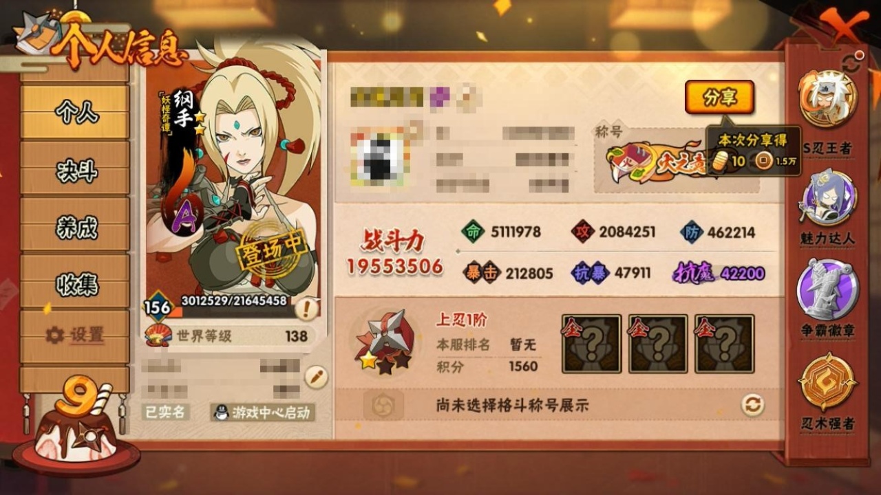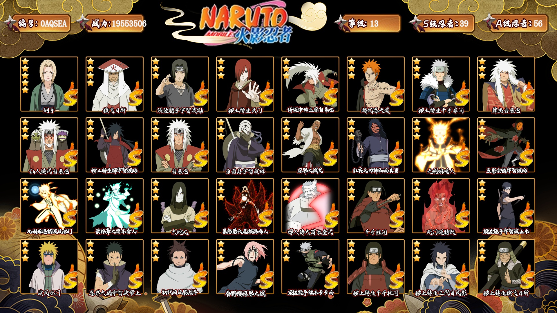 [14686257]0aqsea 号,vip13,战力:19553506,s忍者数量:39,a忍者数量:56,本服排名:42,战区排名:未上榜,通灵兽数量:22,时装数:33,段位:上忍1阶,忍者星数:688