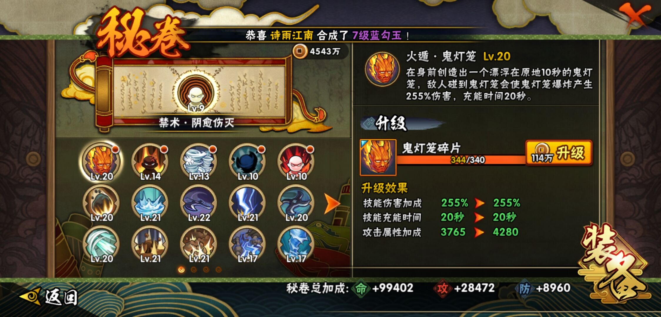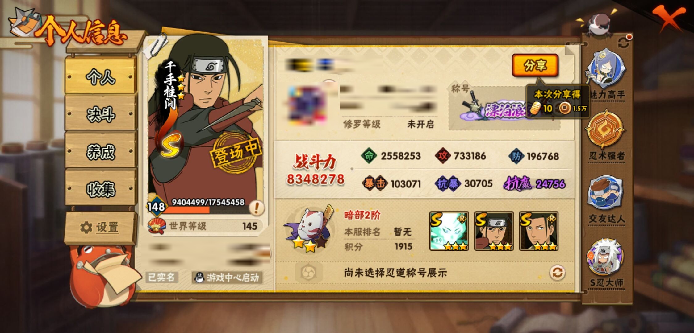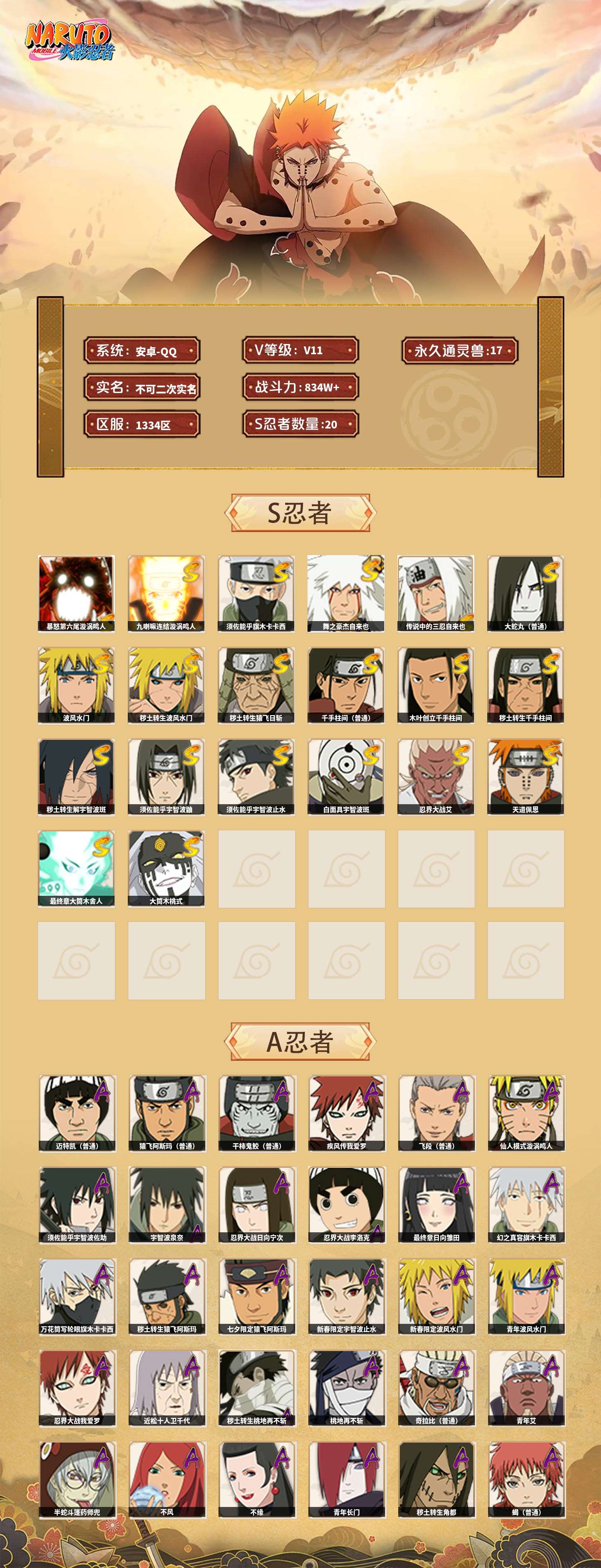 【火影忍者】【lyhy9415】战斗力:834w;段位:暗部2阶;本服排名:750;vip:v11级;s忍:20个;a忍:36个;通灵兽:17个,s忍:暴怒第六尾漩涡鸣人|九喇嘛连结漩涡鸣人|须佐能乎旗木卡卡西|舞之豪杰自来也|传说中的三忍自来也|大蛇丸(普通)|波风水门|秽土转生波风水门|秽土转生猿飞日斩|千手柱间(普通)|木叶创立千手柱间|秽土转生千手柱间|秽土转生解宇智波斑|须佐能乎宇智波鼬|须佐能乎宇智波止水|白面具宇智波斑|忍界大战艾|天道佩恩|最终章大筒木舍人|大筒木桃式__a忍:迈特凯(普通) 5星|猿飞阿斯玛(普通) 5星|干柿鬼鲛(普通) 5星|疾风传我爱罗 3星|飞段(普通) 3星|仙人模式漩涡鸣人|须佐能乎宇智波佐助|宇智波泉奈|忍界大战日向宁次|忍界大战李洛克|最终章日向雏田|幻之真容旗木卡卡西|万花筒写轮眼旗木卡卡西|秽土转生猿飞阿斯玛|七夕限定猿飞阿斯玛|新春限定宇智波止水|新春限定波风水门|青年波风水门|忍界大战我爱罗|近松十人卫千代|秽土转生桃地再不斩|桃地再不斩|奇拉比(普通)|青年艾|半蛇斗篷药师兜|不风|不缘|青年长门|秽土转生角都|蝎(普通)|宇智波鼬(普通)|死司凭血飞段|漂泊浪客宇智波带土|羁绊神农|桃式显现漩涡博人|四代目土影黑土__通灵兽:忍犬(普通)|蓝蛇|蛤蟆吉|忍龟|镰鼬|猿魔|山椒鱼|蜃|蛤蟆仙人|鲛鲨|蛤蟆健|砂之守鹤|乌鸦(普通)|蛤蟆龙|熊猫|蛤蟆广|蛞蝓(普通)