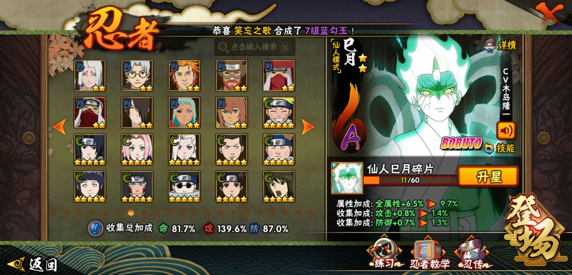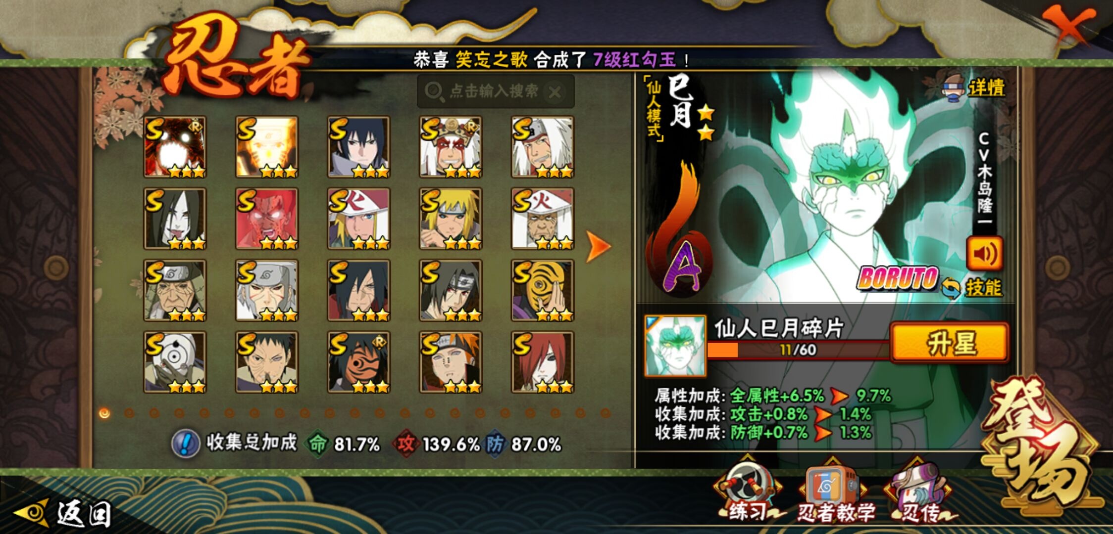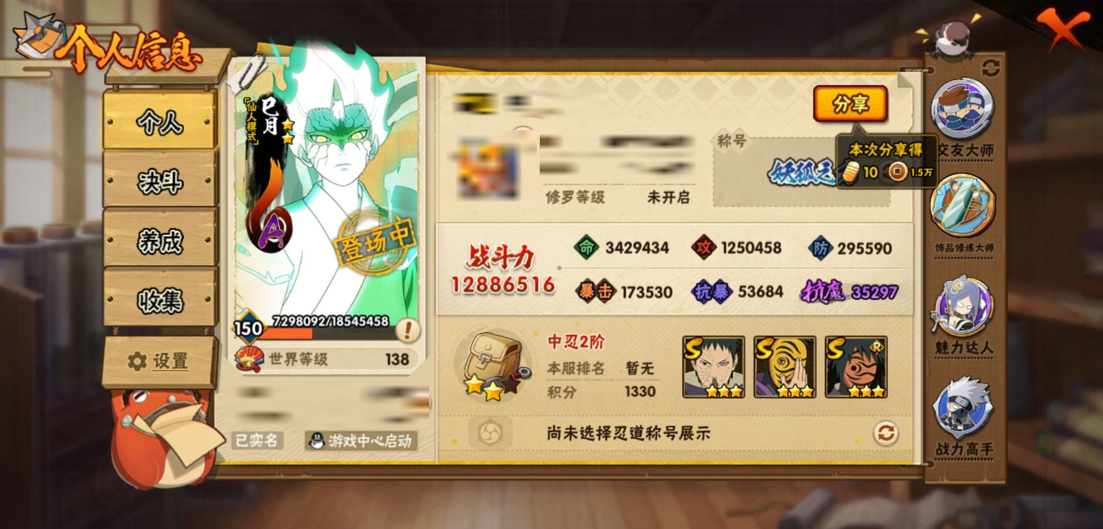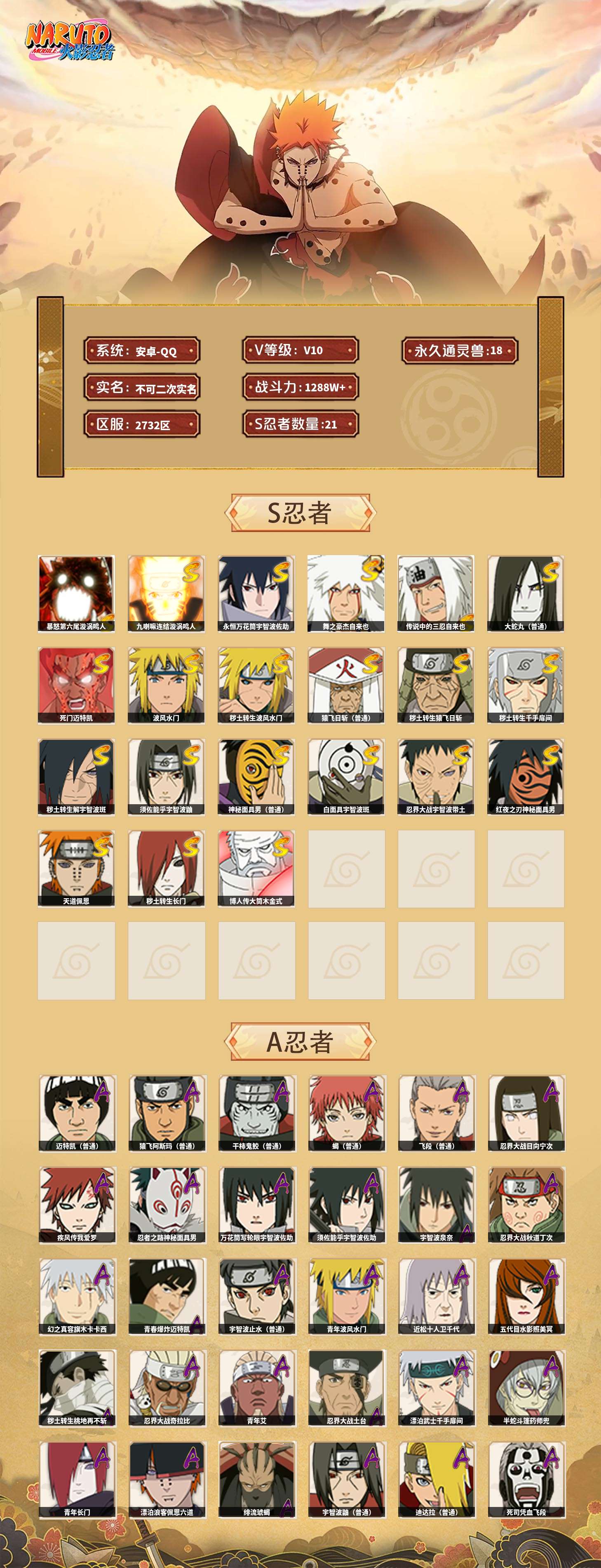 【火影忍者】【lyhy9399】战斗力:1288w;段位:中忍2阶;本服排名:126;vip:v10级;s忍:21个;a忍:36个;通灵兽:18个,s忍:暴怒第六尾漩涡鸣人|九喇嘛连结漩涡鸣人|永恒万花筒宇智波佐助|舞之豪杰自来也|传说中的三忍自来也|大蛇丸(普通)|死门迈特凯|波风水门|秽土转生波风水门|猿飞日斩(普通)|秽土转生猿飞日斩|秽土转生千手扉间|秽土转生解宇智波斑|须佐能乎宇智波鼬|神秘面具男(普通)|白面具宇智波斑|忍界大战宇智波带土|红夜之刃神秘面具男|天道佩恩|秽土转生长门|博人传大筒木金式__a忍:迈特凯(普通) 5星|猿飞阿斯玛(普通) 5星|干柿鬼鲛(普通) 5星|蝎(普通) 4星|飞段(普通) 4星|忍界大战日向宁次 3星|疾风传我爱罗 3星|忍者之路神秘面具男|万花筒写轮眼宇智波佐助|须佐能乎宇智波佐助|宇智波泉奈|忍界大战秋道丁次|幻之真容旗木卡卡西|青春爆炸迈特凯|宇智波止水(普通)|青年波风水门|近松十人卫千代|五代目水影照美冥|秽土转生桃地再不斩|忍界大战奇拉比|青年艾|忍界大战土台|漂泊武士千手扉间|半蛇斗篷药师兜|青年长门|漂泊浪客佩恩六道|绯流琥蝎|宇智波鼬(普通)|迪达拉(普通)|死司凭血飞段|羁绊神农|桃式显现漩涡博人|五代目雷影达鲁伊|六代目水影长十郎|仙人模式巳月|四代目土影黑土__通灵兽:忍犬(普通)|蓝蛇|砂之守鹤|蛤蟆吉|忍龟|镰鼬|猿魔|山椒鱼|蜃|蛤蟆仙人|鲛鲨|蛤蟆健|蛞蝓(普通)|乌鸦(普通)|蛤蟆龙|蛤蟆广|梦貘|鹰