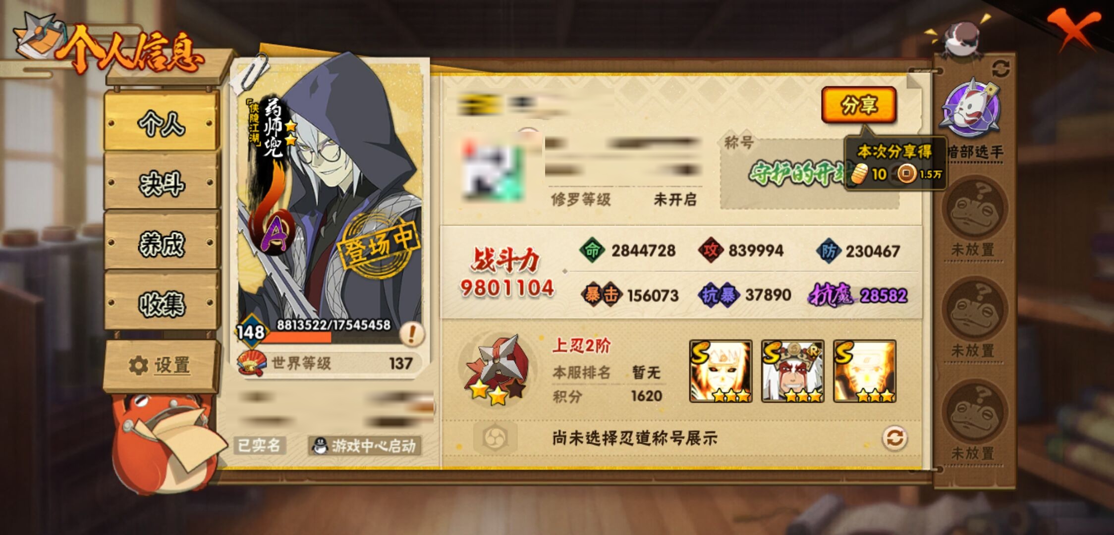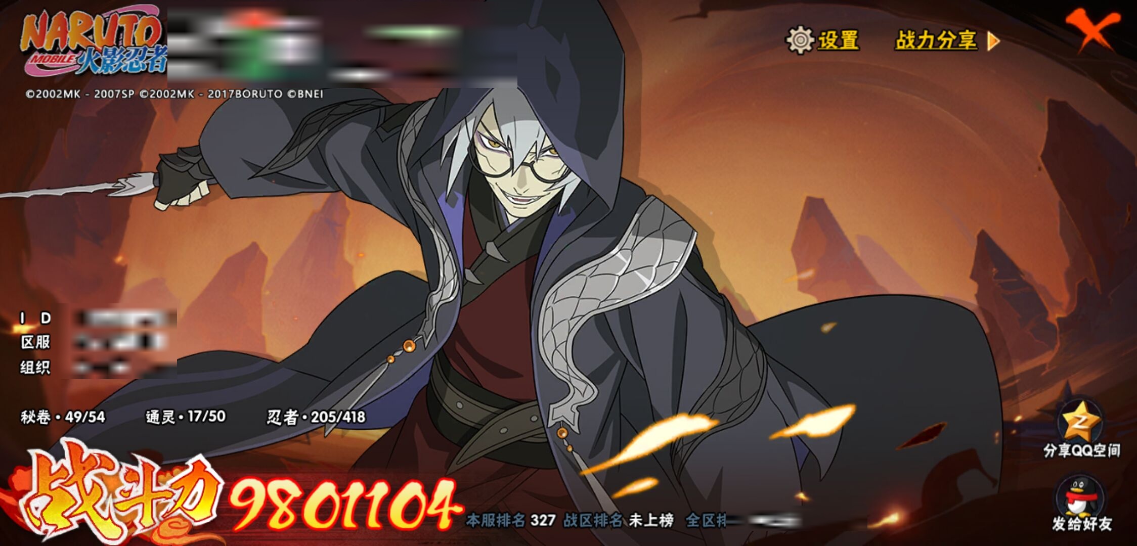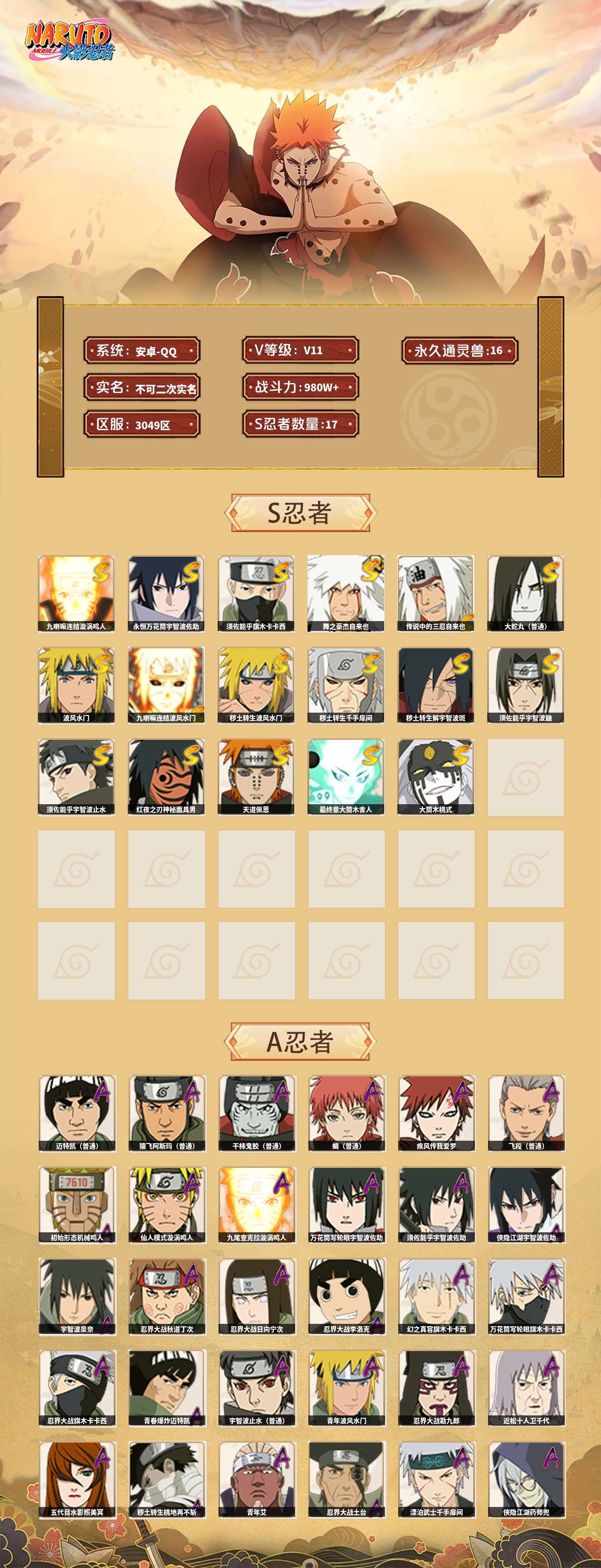 【火影忍者】【lyhy9400】战斗力:980w;段位:上忍2阶;vip:v11级;s忍:17个;a忍:47个;通灵兽:16个,s忍:九喇嘛连结漩涡鸣人|永恒万花筒宇智波佐助|须佐能乎旗木卡卡西|舞之豪杰自来也|传说中的三忍自来也|大蛇丸(普通)|波风水门|九喇嘛连结波风水门|秽土转生波风水门|秽土转生千手扉间|秽土转生解宇智波斑|须佐能乎宇智波鼬|须佐能乎宇智波止水|红夜之刃神秘面具男|天道佩恩|最终章大筒木舍人|大筒木桃式__a忍:迈特凯(普通) 5星|猿飞阿斯玛(普通) 5星|干柿鬼鲛(普通) 5星|蝎(普通) 4星|疾风传我爱罗 3星|飞段(普通) 3星|初始形态机械鸣人|仙人模式漩涡鸣人|九尾查克拉漩涡鸣人|万花筒写轮眼宇智波佐助|须佐能乎宇智波佐助|侠隐江湖宇智波佐助|宇智波泉奈|忍界大战秋道丁次|忍界大战日向宁次|忍界大战李洛克|幻之真容旗木卡卡西|万花筒写轮眼旗木卡卡西|忍界大战旗木卡卡西|青春爆炸迈特凯|宇智波止水(普通)|青年波风水门|忍界大战勘九郎|近松十人卫千代|五代目水影照美冥|秽土转生桃地再不斩|青年艾|忍界大战土台|漂泊武士千手扉间|侠隐江湖药师兜|不缘|不动|青年长门|秽土转生角都|晓大蛇丸|绯流琥蝎|宇智波鼬(普通)|新春限定宇智波鼬|迪达拉(普通)|秽土转生迪达拉|死司凭血飞段|侠隐江湖大野木|羁绊神农|桃式显现漩涡博人|五代目雷影达鲁伊|六代目水影长十郎|仙人模式巳月__通灵兽:忍犬(普通)|蓝蛇|蛤蟆吉|砂之守鹤|忍龟|镰鼬|猿魔|山椒鱼|蛞蝓(普通)|蜃|蛤蟆仙人|鲛鲨|蛤蟆健|乌鸦(普通)|蛤蟆龙|蛤蟆广