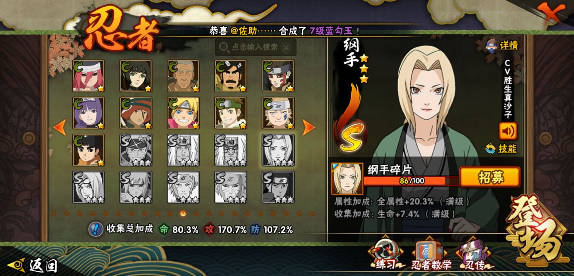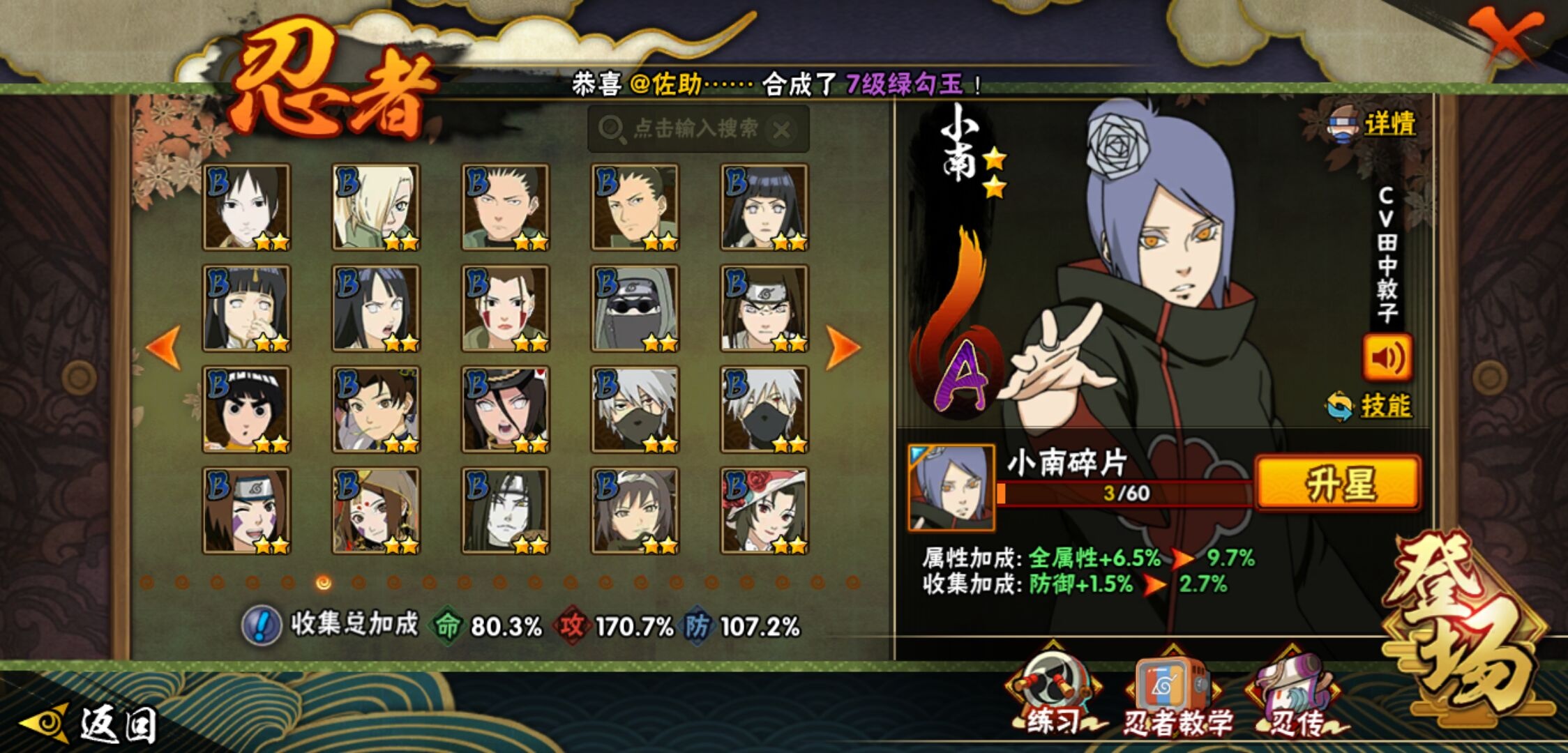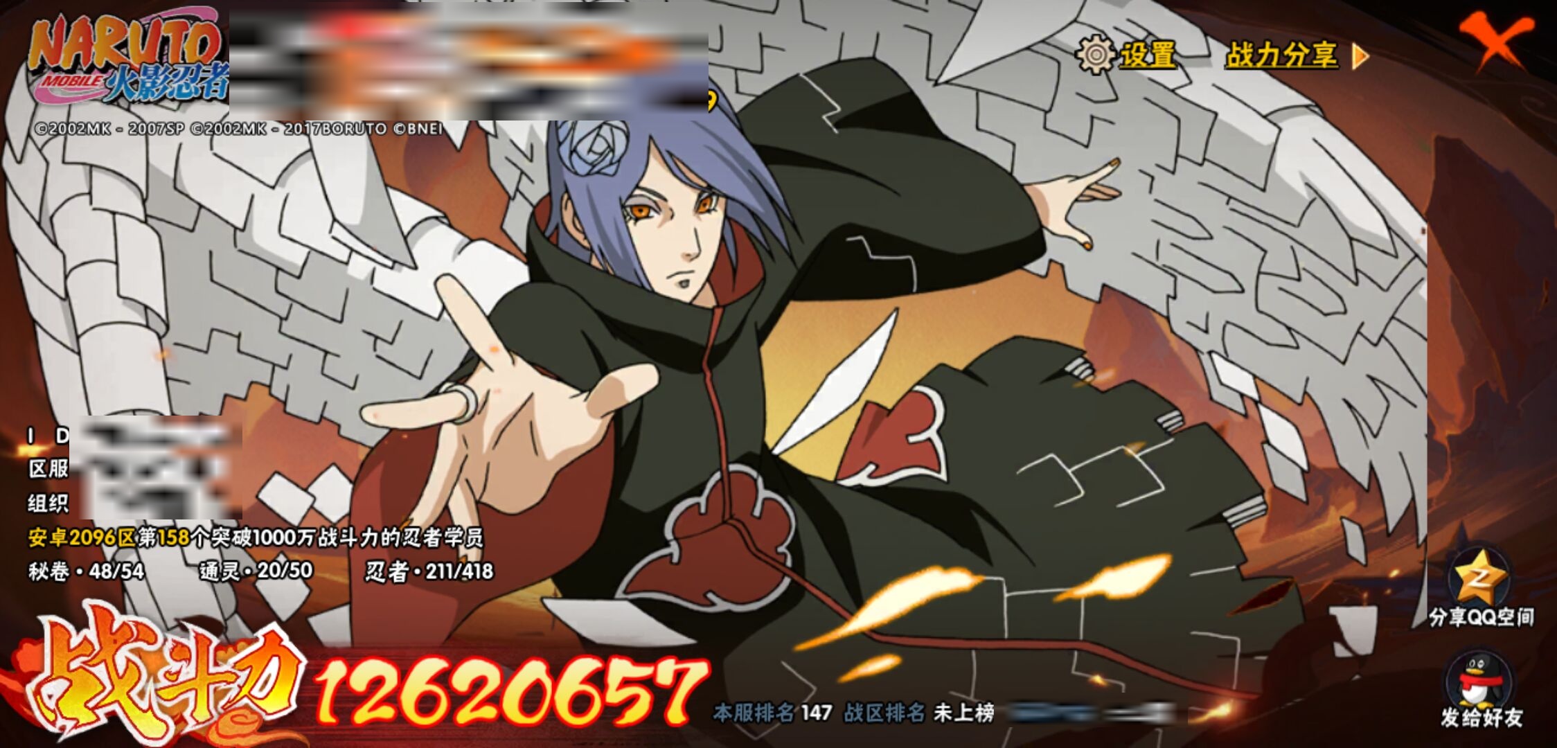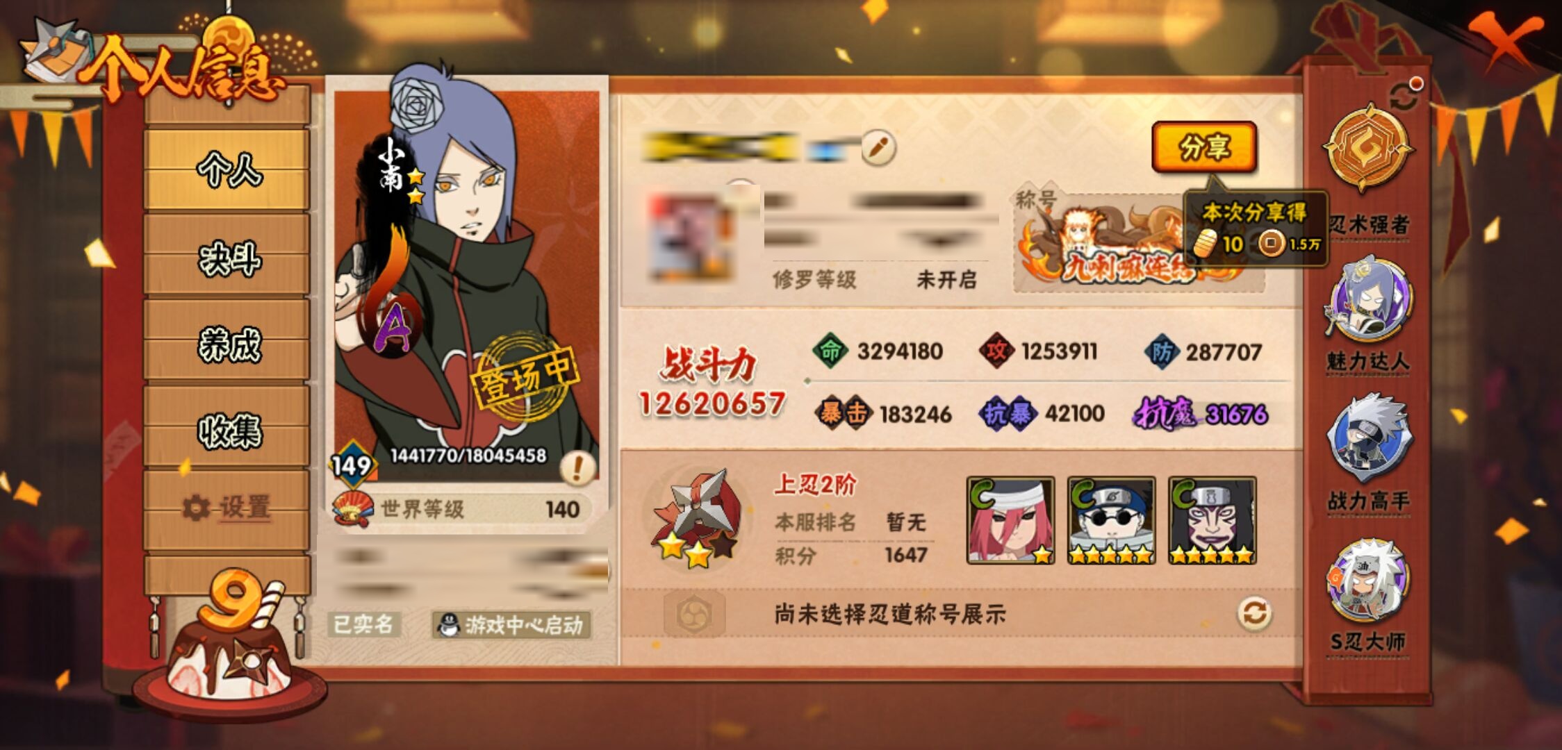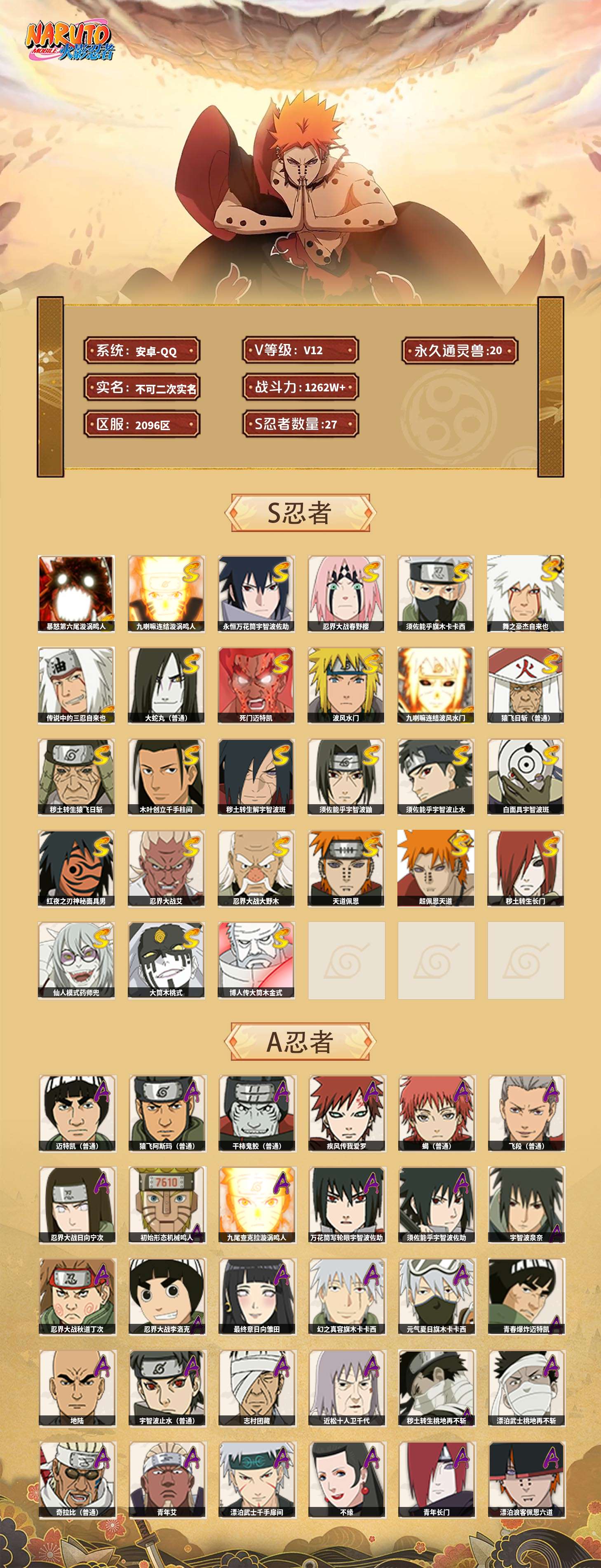 【火影忍者】【lyhy9416】战斗力:1262w;段位:上忍2阶;本服排名:147;vip:v12级;s忍:27个;a忍:46个;通灵兽:20个,s忍:暴怒第六尾漩涡鸣人|九喇嘛连结漩涡鸣人|永恒万花筒宇智波佐助|忍界大战春野樱|须佐能乎旗木卡卡西|舞之豪杰自来也|传说中的三忍自来也|大蛇丸(普通)|死门迈特凯|波风水门|九喇嘛连结波风水门|猿飞日斩(普通)|秽土转生猿飞日斩|木叶创立千手柱间|秽土转生解宇智波斑|须佐能乎宇智波鼬|须佐能乎宇智波止水|白面具宇智波斑|红夜之刃神秘面具男|忍界大战艾|忍界大战大野木|天道佩恩|超佩恩天道|秽土转生长门|仙人模式药师兜|大筒木桃式|博人传大筒木金式__a忍:迈特凯(普通) 5星|猿飞阿斯玛(普通) 5星|干柿鬼鲛(普通) 5星|疾风传我爱罗 4星|蝎(普通) 4星|飞段(普通) 4星|忍界大战日向宁次 3星|初始形态机械鸣人|九尾查克拉漩涡鸣人|万花筒写轮眼宇智波佐助|须佐能乎宇智波佐助|宇智波泉奈|忍界大战秋道丁次|忍界大战李洛克|最终章日向雏田|幻之真容旗木卡卡西|元气夏日旗木卡卡西|青春爆炸迈特凯|地陆|宇智波止水(普通)|志村团藏|近松十人卫千代|秽土转生桃地再不斩|漂泊武士桃地再不斩|奇拉比(普通)|青年艾|漂泊武士千手扉间|不缘|青年长门|漂泊浪客佩恩六道|小南(普通)|漂泊浪客小南|地怨虞角都|绯流琥蝎|宇智波鼬(普通)|迪达拉(普通)|秽土转生迪达拉|死司凭血飞段|漂泊浪客宇智波带土|加藤断|羁绊神农|五代目雷影达鲁伊|桃式显现漩涡博人|六代目水影长十郎|仙人模式巳月|四代目土影黑土__通灵兽:忍犬(普通)|蓝蛇|蛤蟆吉|忍龟|镰鼬|猿魔|山椒鱼|蜃|蛤蟆仙人|砂之守鹤|鲛鲨|蛤蟆健|乌鸦(普通)|蛞蝓(普通)|怒鬼爪|蛤蟆龙|蛤蟆广|梦貘|辛牙|鹰