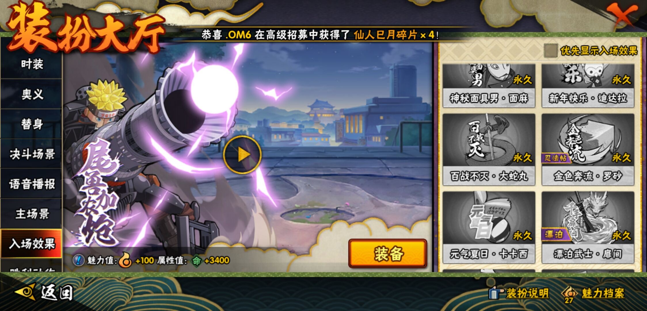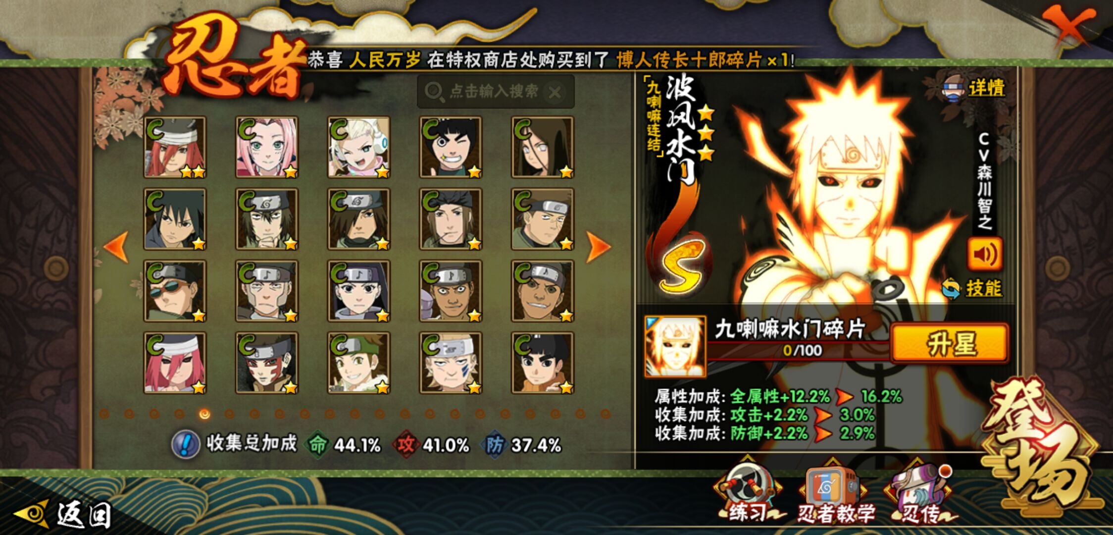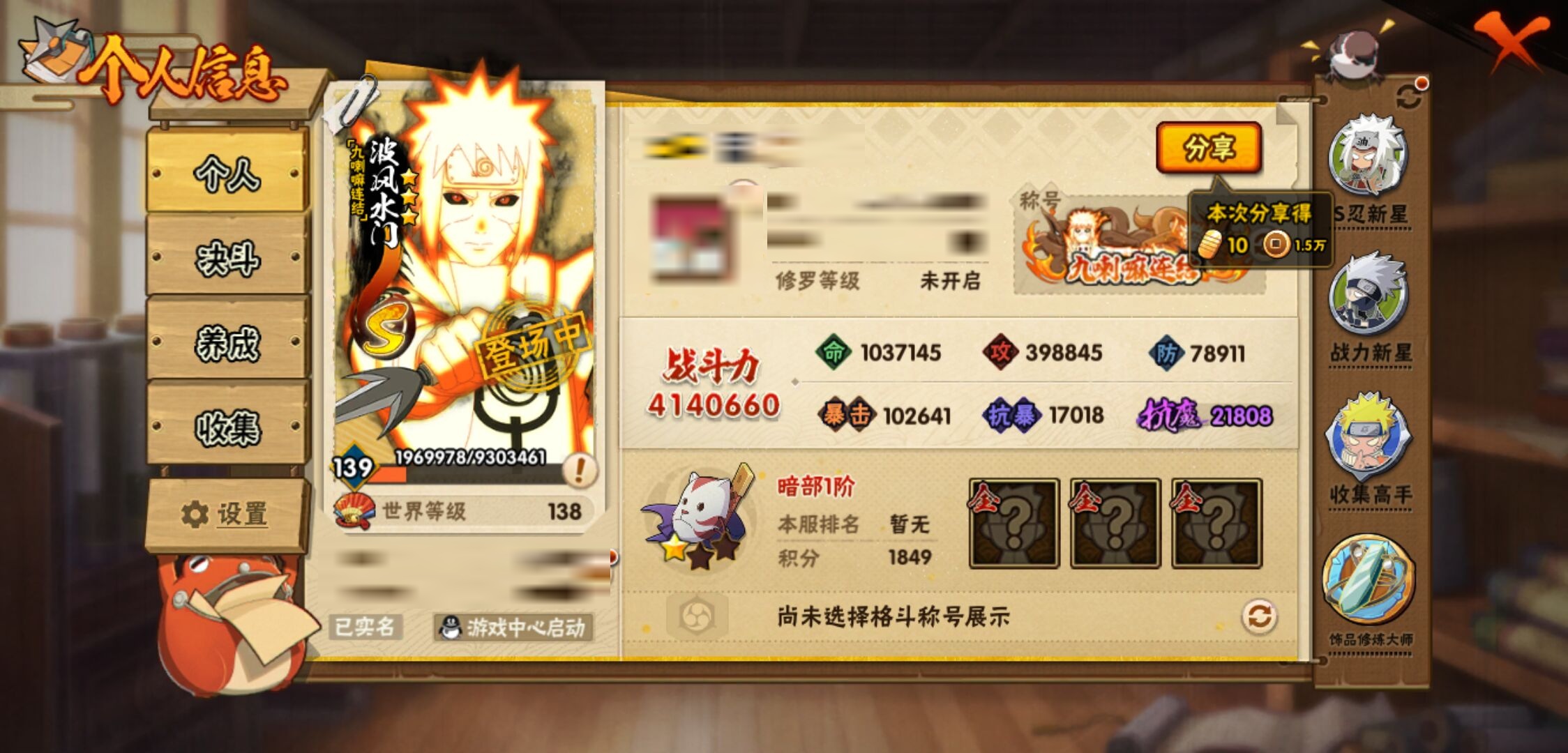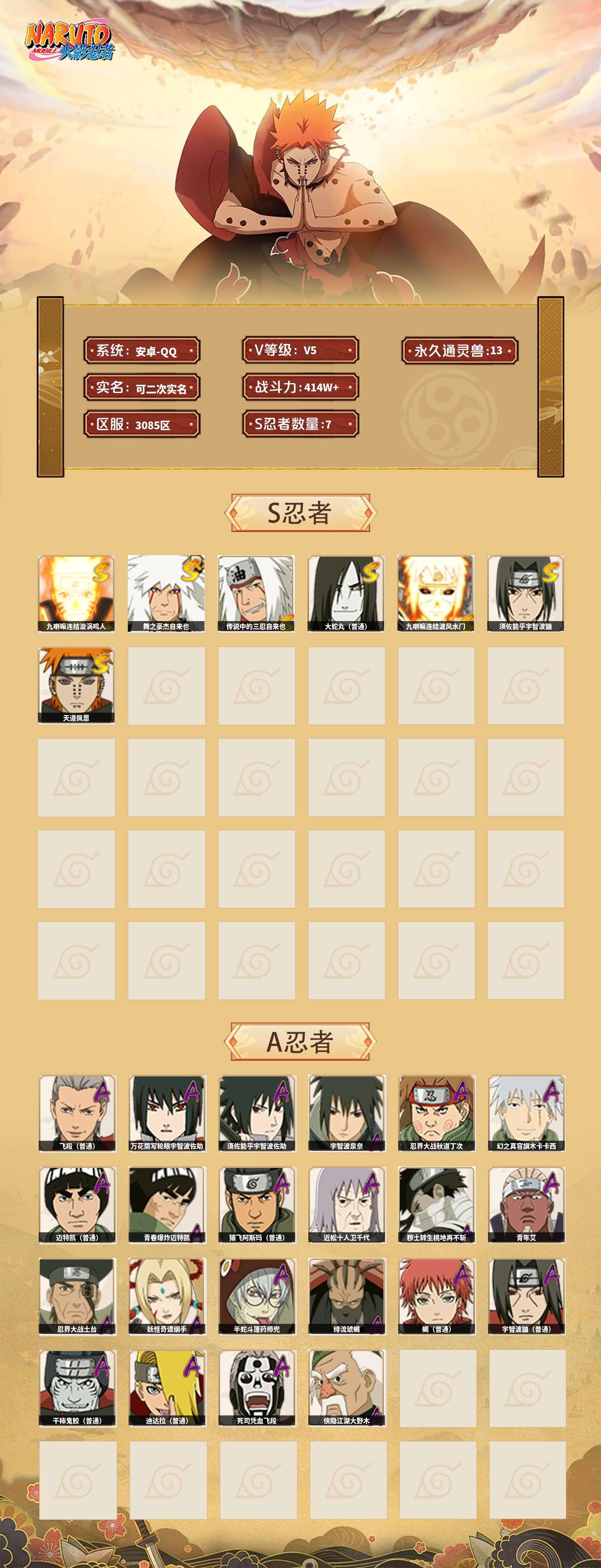 【火影忍者】【lyhy9418】战斗力:414w;段位:暗部1阶;本服排名:2718;vip:v5级;s忍:7个;a忍:22个;通灵兽:13个,s忍:九喇嘛连结漩涡鸣人|舞之豪杰自来也|传说中的三忍自来也|大蛇丸(普通)|九喇嘛连结波风水门|须佐能乎宇智波鼬|天道佩恩__a忍:飞段(普通) 3星|万花筒写轮眼宇智波佐助|须佐能乎宇智波佐助|宇智波泉奈|忍界大战秋道丁次|幻之真容旗木卡卡西|迈特凯(普通)|青春爆炸迈特凯|猿飞阿斯玛(普通)|近松十人卫千代|秽土转生桃地再不斩|青年艾|忍界大战土台|妖怪奇谭纲手|半蛇斗篷药师兜|绯流琥蝎|蝎(普通)|宇智波鼬(普通)|干柿鬼鲛(普通)|迪达拉(普通)|死司凭血飞段|侠隐江湖大野木__通灵兽:忍犬(普通)|蓝蛇|蛤蟆吉|忍龟|镰鼬|猿魔|山椒鱼|蜃|砂之守鹤|蛤蟆仙人|鲛鲨|蛤蟆健|乌鸦(普通)