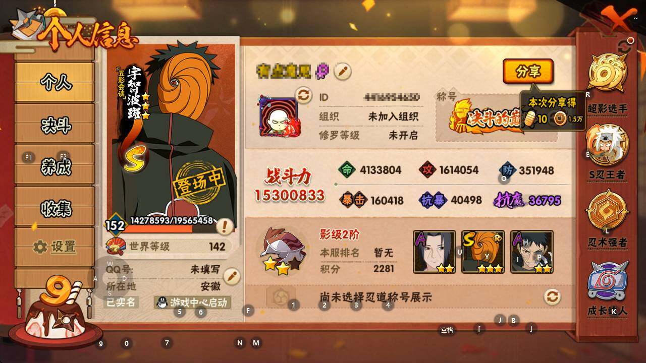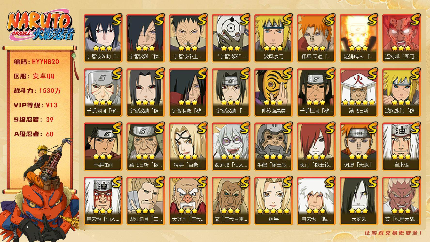 【hyyh820】v13/战力1530w/s忍39/a忍60/3星宇智波斑「秽土转生」/2星纲手「侠隐江湖」/2星照美冥「夏日泳装」/2星达鲁伊「博人传」/3星旗木卡卡西「须佐能乎」/5星蝎/2星我爱罗「新春限定」/3星猿飞日斩「秽土转生」/2星照美冥「五代目水影」/2星黑土「夏日限定」/5星迈特凯/3星自来也/3星千手扉间「秽土转生」/3星药师兜「仙人模式」/2星长十郎「六代目水影」/2星蝎「绯流琥」/2星春野樱「百豪」/3星迈特凯「死门」/2星飞段「恶灵之影」/2星宇智波带土「暴怒」/2星迪达拉「秽土转生」/2星药师兜「半蛇斗篷」/2星宇智波佐助「万花筒写轮眼」/3星自来也「仙人模式」/2星猿飞木叶丸「博人传」/3星神秘面具男/2星大蛇丸「晓」/2星日向宁次「忍界大战」/5星纲手/3星宇智波佐助「永恒万花筒」/2星长门「青年」/2星桃地再不斩/3星宇智波带土「忍界大战」/3星波风水门/3星大筒木舍人「最终章」/3星大野木「三代目土影」/2星角都「秽土转生」/3星艾「三代目雷影」/2星李洛克「忍界大战」/2星土台「忍界大战」/2星波风水门「青年」/3星半藏「秽土转生」/2星小南「新春限定」/2星宇智波泉奈/3星大蛇丸/3星艾「忍界大战」/3星宇智波斑「秽土转生·解」/3星鬼灯幻月「二代目水影」/2星迈特凯「青春爆炸」/2星宇智波佐助「须佐能乎」/3星长门「秽土转生」/3星宇智波鼬「须佐能乎」/2星波风水门「新春限定」/3星纲手「百豪」/2星大野木「侠隐江湖」/3星波风水门「九喇嘛连结」/2星宇智波止水/5星猿飞阿斯玛/2星猿飞日斩「火影继承人」/2星宇智波佐助「侠隐江湖」/2星宇智波鼬「新春限定」/2星奇拉比「忍界大战」/5星猿飞日斩/3星漩涡鸣人「暴怒·第六尾」/2星桃地再不斩「秽土转生」/3星宇智波斑「白面具」/3星自来也「传说中的三忍」/3星千手柱间/2星黑土「博人传」/3星佩恩·天道「超」/2星神农「羁绊」/2星迪达拉/4星我爱罗「疾风传」/2星小南/4星飞段「死司凭血」/2星漩涡鸣人「九尾查克拉」/2星不动/2星宇智波带土「漂泊浪客」/2星宇智波鼬/3星宇智波鼬「秽土转生」/3星佩恩「天道」/3星漩涡鸣人「九喇嘛连结」/3星波风水门「秽土转生」/2星秋道丁次「忍界大战」/2星漩涡博人「桃式显现」/3星千手柱间「秽土转生」/3星自来也「舞之豪杰」/3星宇智波止水「须佐能乎」/4星飞段/2星奇拉比/2星漩涡鸣人「仙人模式」/2星宇智波鼬「夏日限定」/2星加藤断/2星巳月「仙人模式」/2星艾「青年」/3星宇智波斑「五影会谈」/5星干柿鬼鲛/2星机械鸣人「初始形态」/2星千代「近松十人卫」