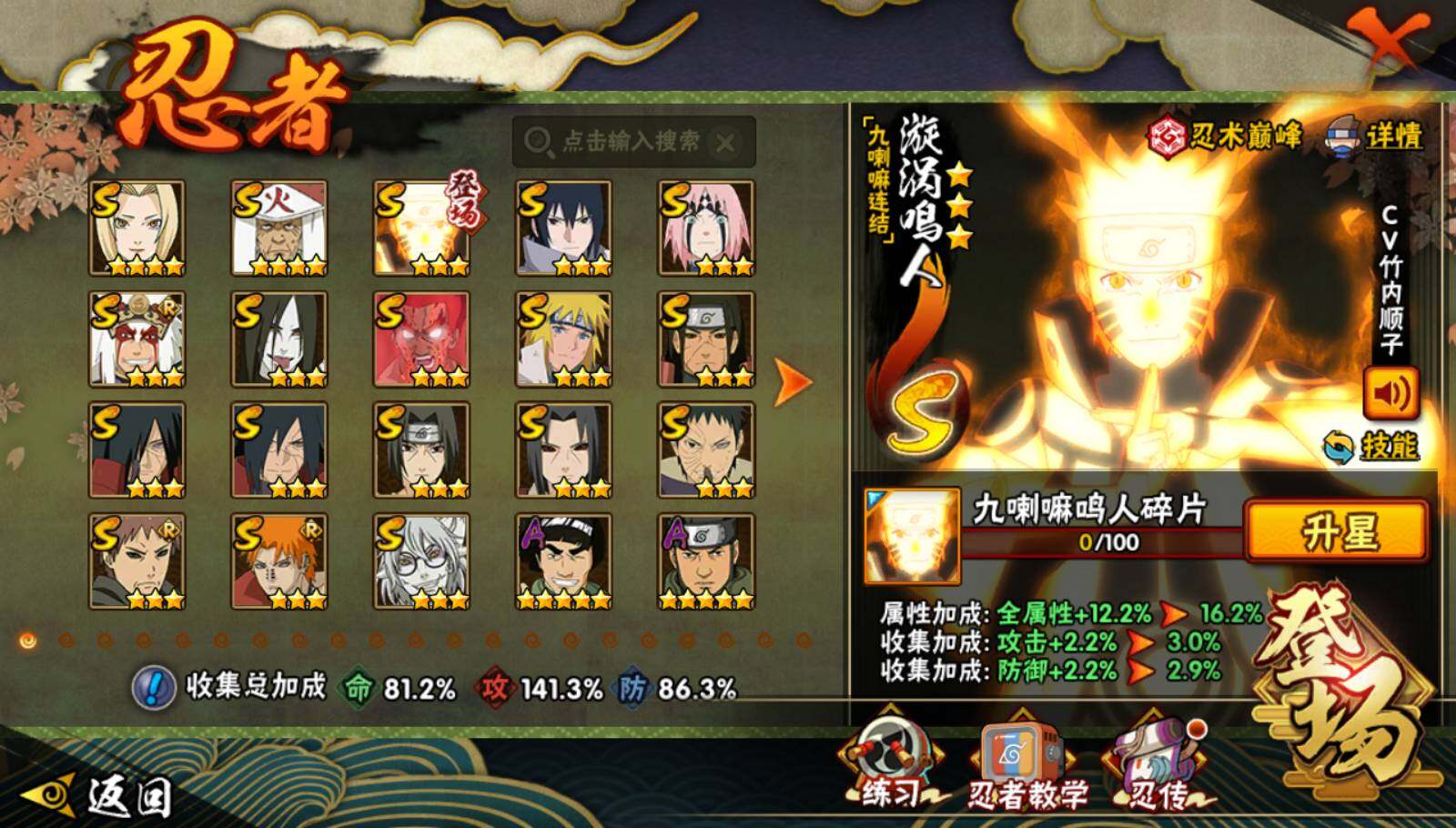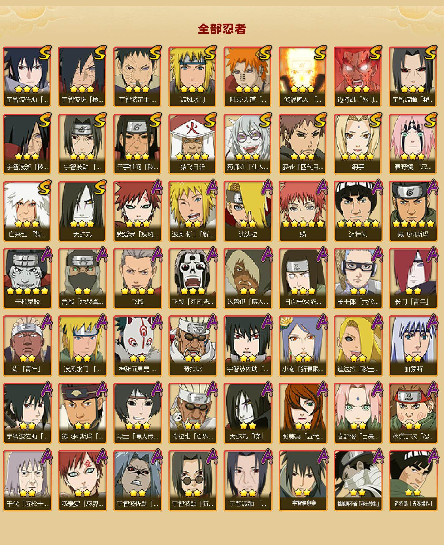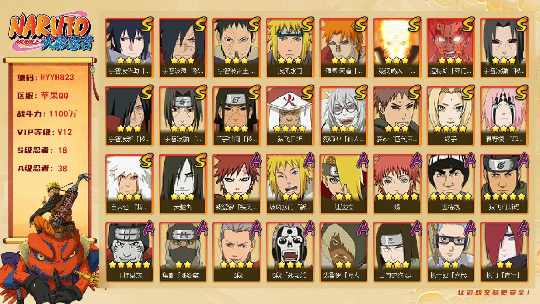 【hyyh823】v12/战力1100w/s忍18/a忍38/3星宇智波斑「秽土转生」/2星波风水门「新春限定」/2星达鲁伊「博人传」/5星猿飞阿斯玛/5星蝎/2星照美冥「五代目水影」/5星迈特凯/2星宇智波鼬「新春限定」/3星日向宁次「忍界大战」/2星奇拉比「忍界大战」/2星神秘面具男「忍者之路」/3星罗砂「四代目风影」/3星药师兜「仙人模式」/2星长十郎「六代目水影」/2星桃地再不斩「秽土转生」/2星春野樱「百豪」/4星纲手/3星迈特凯「死门」/3星佩恩·天道「超」/2星迪达拉「秽土转生」/3星飞段「死司凭血」/3星春野樱「忍界大战」/2星宇智波佐助「万花筒写轮眼」/2星我爱罗「忍界大战」/2星迪达拉/2星大蛇丸「晓」/3星宇智波佐助「永恒万花筒」/3星宇智波鼬「秽土转生」/2星长门「青年」/2星宇智波佐助「疾风传咒印」/3星宇智波带土「忍界大战」/2星角都「地怨虞」/3星波风水门/3星漩涡鸣人「九喇嘛连结」/2星秋道丁次「忍界大战」/3星千手柱间「秽土转生」/3星我爱罗「疾风传」/2星波风水门「青年」/3星自来也「舞之豪杰」/3星黑土「博人传」/2星小南「新春限定」/4星飞段/2星奇拉比/2星宇智波鼬「夏日限定」/2星加藤断/2星宇智波泉奈/4星猿飞日斩/3星大蛇丸/3星宇智波斑「秽土转生·解」/2星艾「青年」/2星迈特凯「青春爆炸」/2星宇智波佐助「须佐能乎」/2星猿飞阿斯玛「七夕限定」/5星干柿鬼鲛/2星千代「近松十人卫」/3星宇智波鼬「须佐能乎」