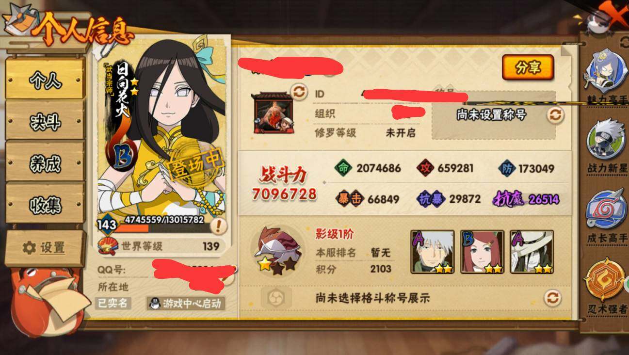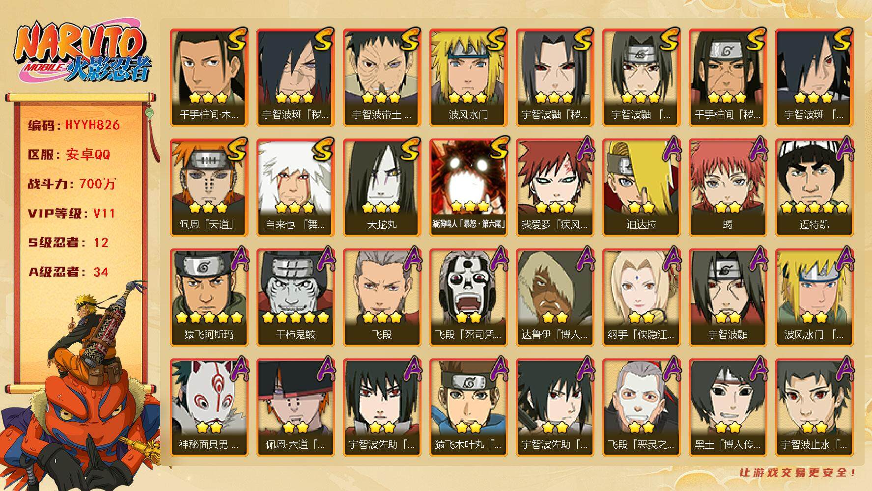 【hyyh826】v11/战力700w/s忍12/a忍34/2星纲手「侠隐江湖」/2星达鲁伊「博人传」/2星飞段「死司凭血」/2星宇智波鼬/5星猿飞阿斯玛/3星宇智波鼬「秽土转生」/3星宇智波带土「忍界大战」/3星飞段/2星蝎/3星佩恩「天道」/3星波风水门/2星秋道丁次「忍界大战」/5星迈特凯/2星奇拉比「忍界大战」/3星千手柱间「木叶创立」/3星千手柱间「秽土转生」/3星我爱罗「疾风传」/2星神秘面具男「忍者之路」/2星大蛇丸「新春限定」/2星波风水门「青年」/2星蝎「绯流琥」/3星自来也「舞之豪杰」/3星漩涡鸣人「暴怒·第六尾」/2星桃地再不斩「秽土转生」/2星千手扉间「漂泊武士」/2星干柿鬼鲛「鲛肌融合」/2星佩恩·六道「漂泊浪客」/2星飞段「恶灵之影」/2星黑土「博人传」/2星神农「羁绊」/2星宇智波佐助「万花筒写轮眼」/2星宇智波泉奈/2星宇智波止水「新春限定」/2星迪达拉/2星旗木卡卡西「幻之真容」/3星宇智波斑「木叶创立」/3星大蛇丸/2星小南「漂泊浪客」/3星宇智波斑「秽土转生·解」/2星迈特凯「青春爆炸」/2星宇智波佐助「须佐能乎」/2星猿飞木叶丸「博人传」/5星干柿鬼鲛/2星机械鸣人「初始形态」/2星千代「近松十人卫」/3星宇智波鼬「须佐能乎」
