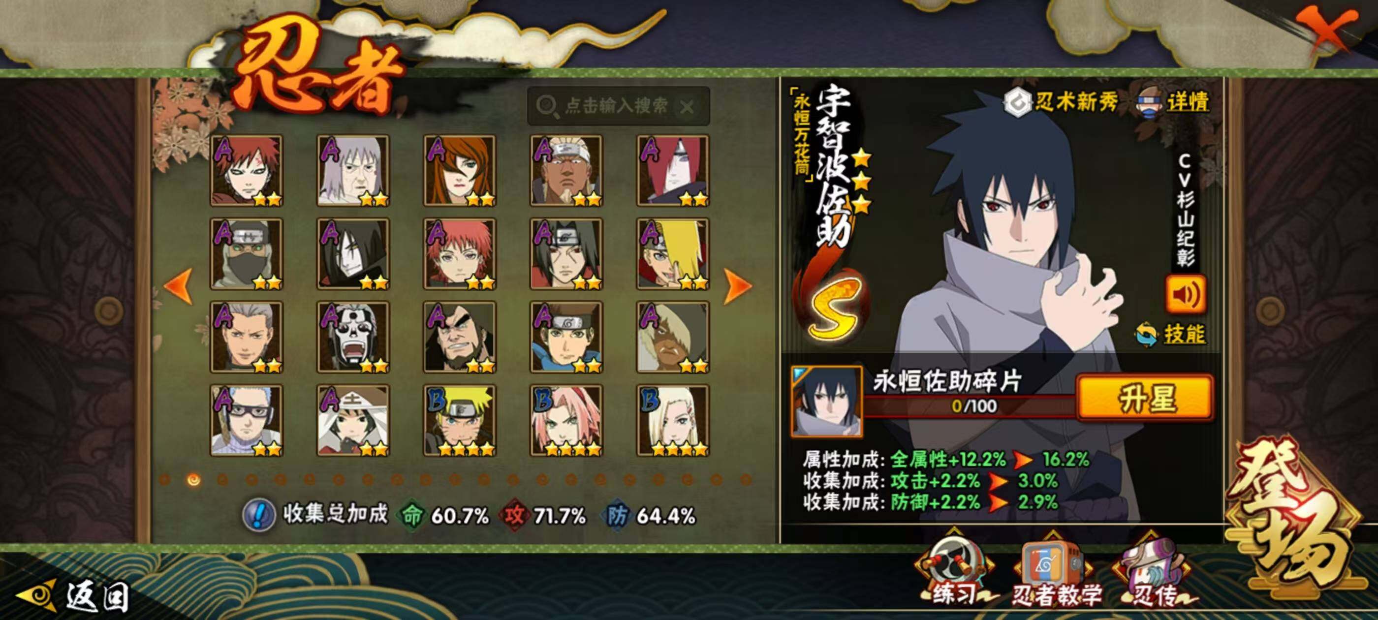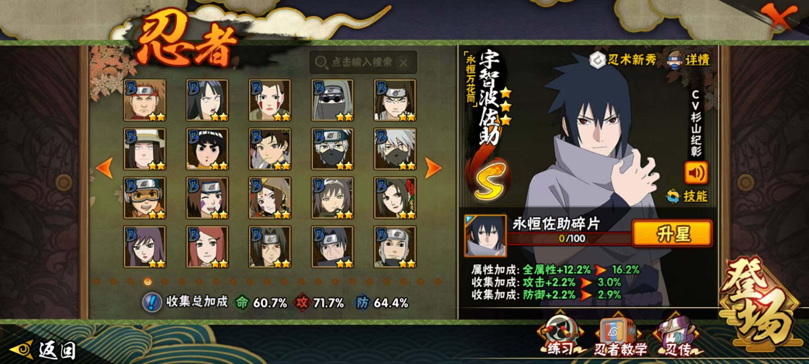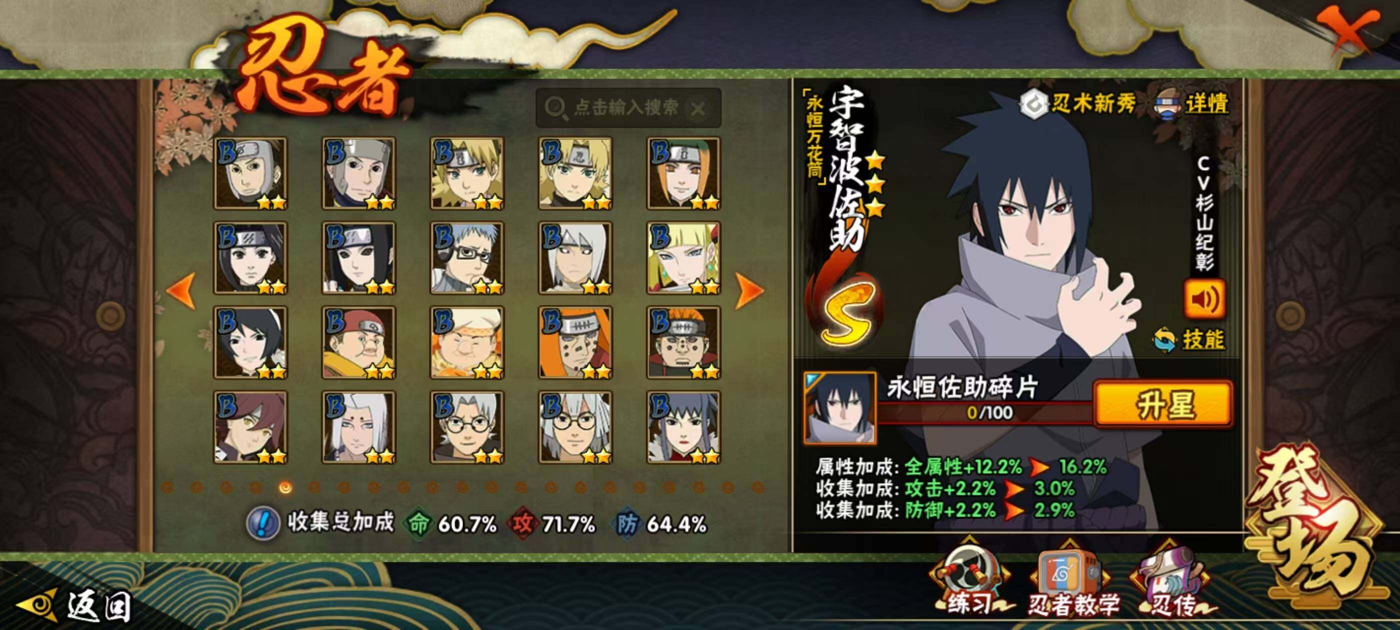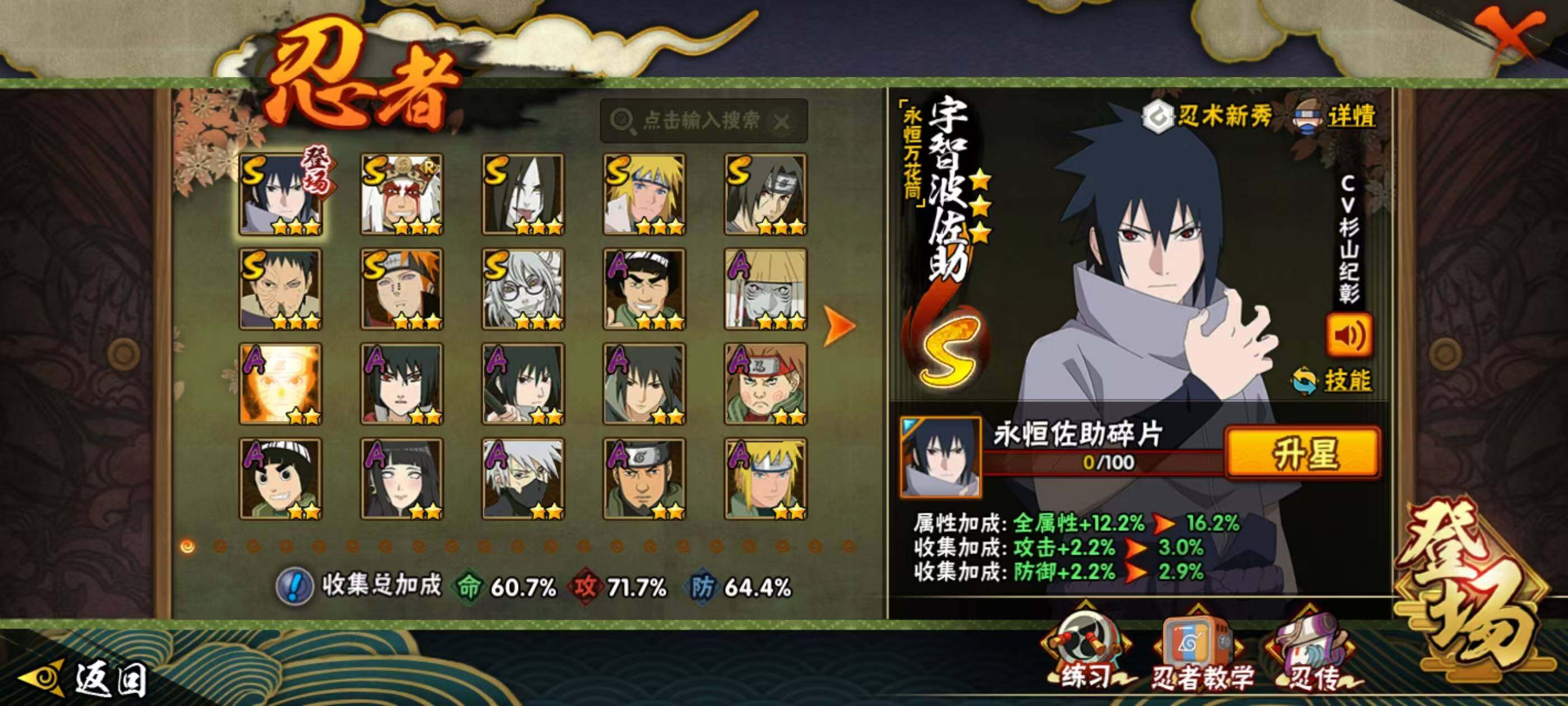 1677619 8s级忍者数-29a级忍者数 【s级忍者】:宇智波带土「忍界大战」3星,宇智波鼬「须佐能乎」3星,自来也「舞之豪杰」3星,大蛇丸3星,波风水门3星,药师兜「仙人模式」3星,佩恩「天道」3星,宇智波佐助「永恒万花筒」3星 【a级忍者】:艾「青年」2星,长门「青年」2星,波风水门「青年」2星,达鲁伊「博人传」2星,迪达拉2星,大蛇