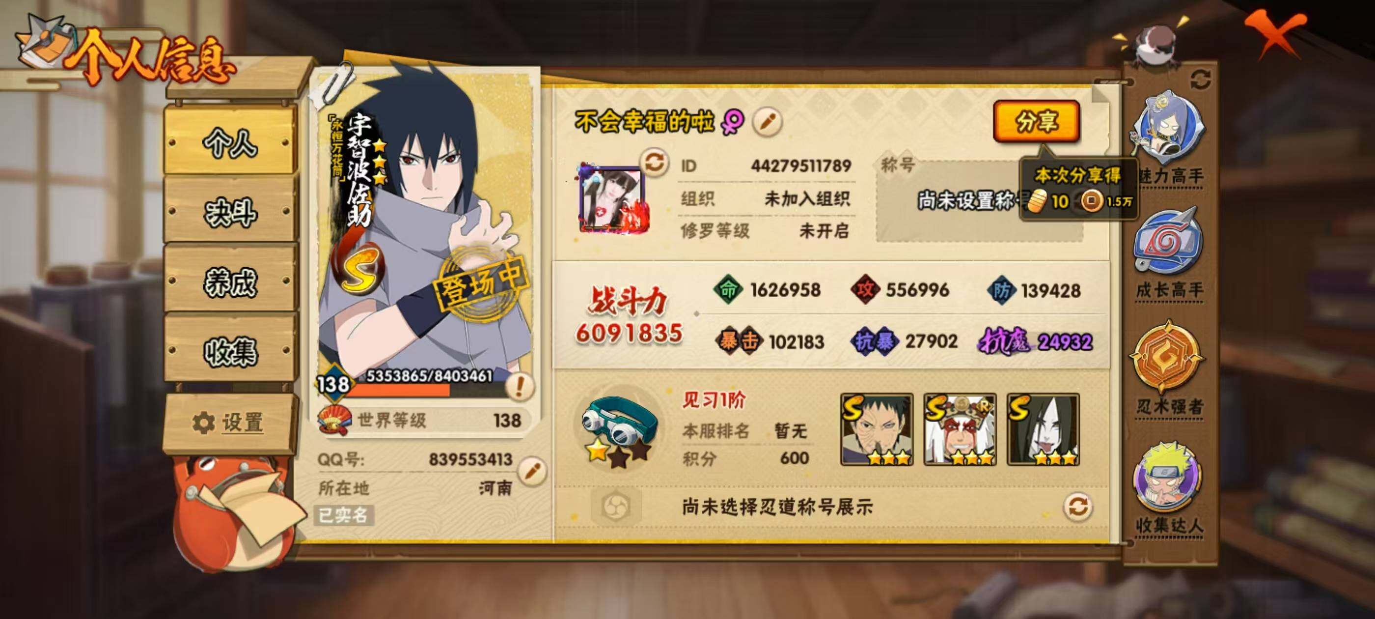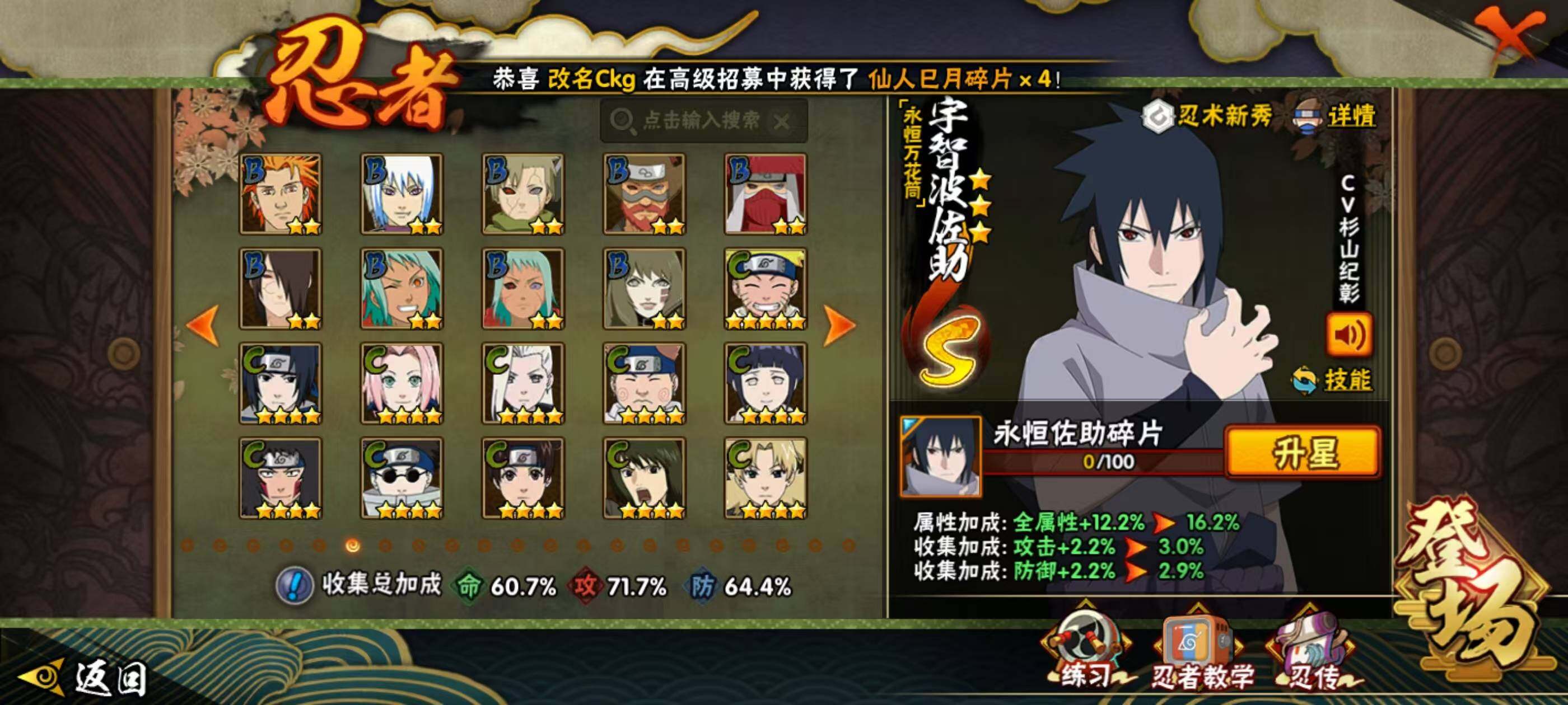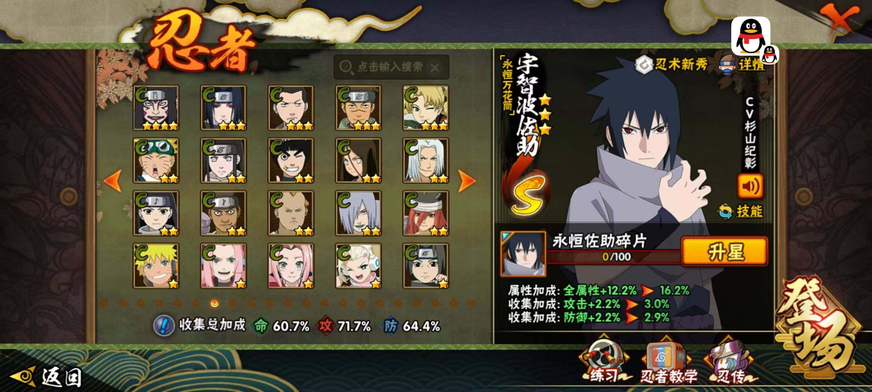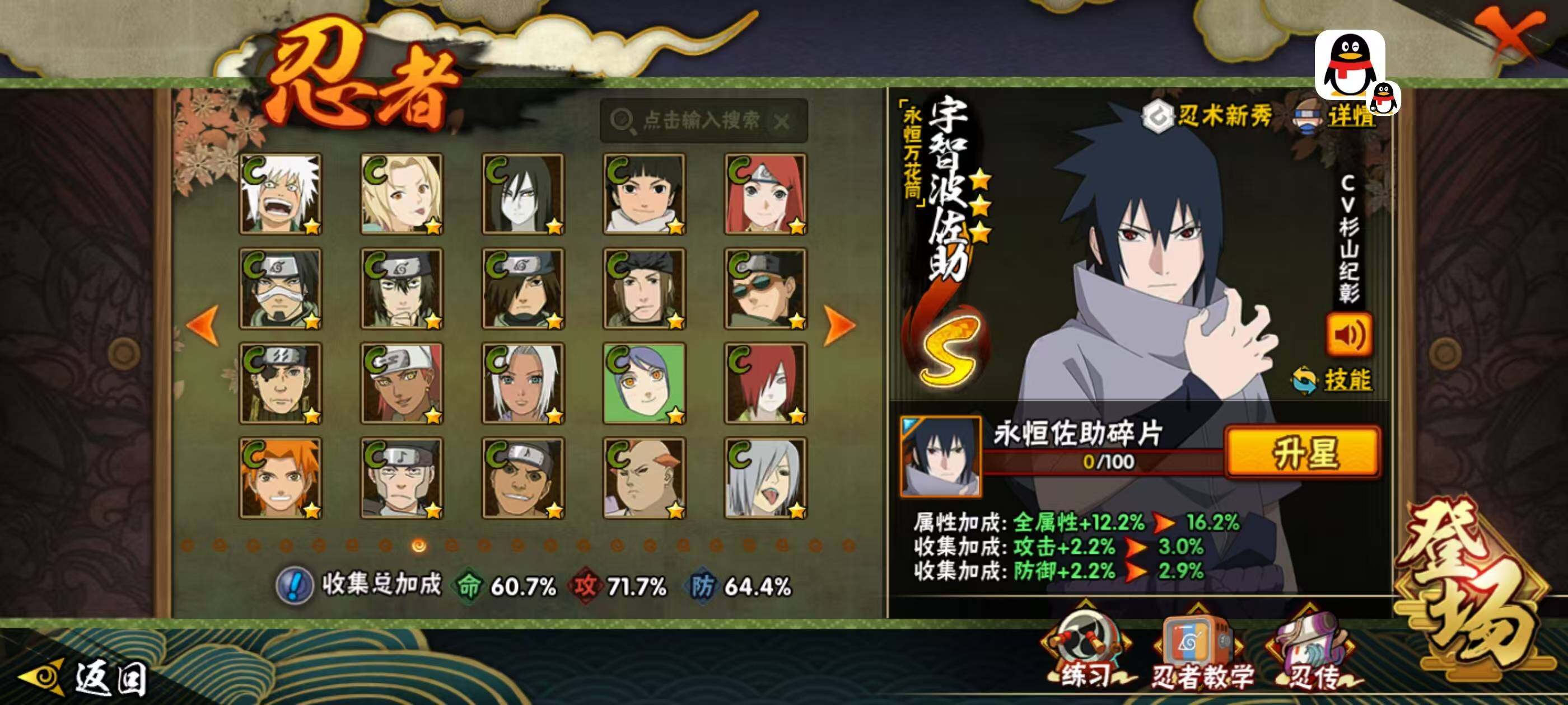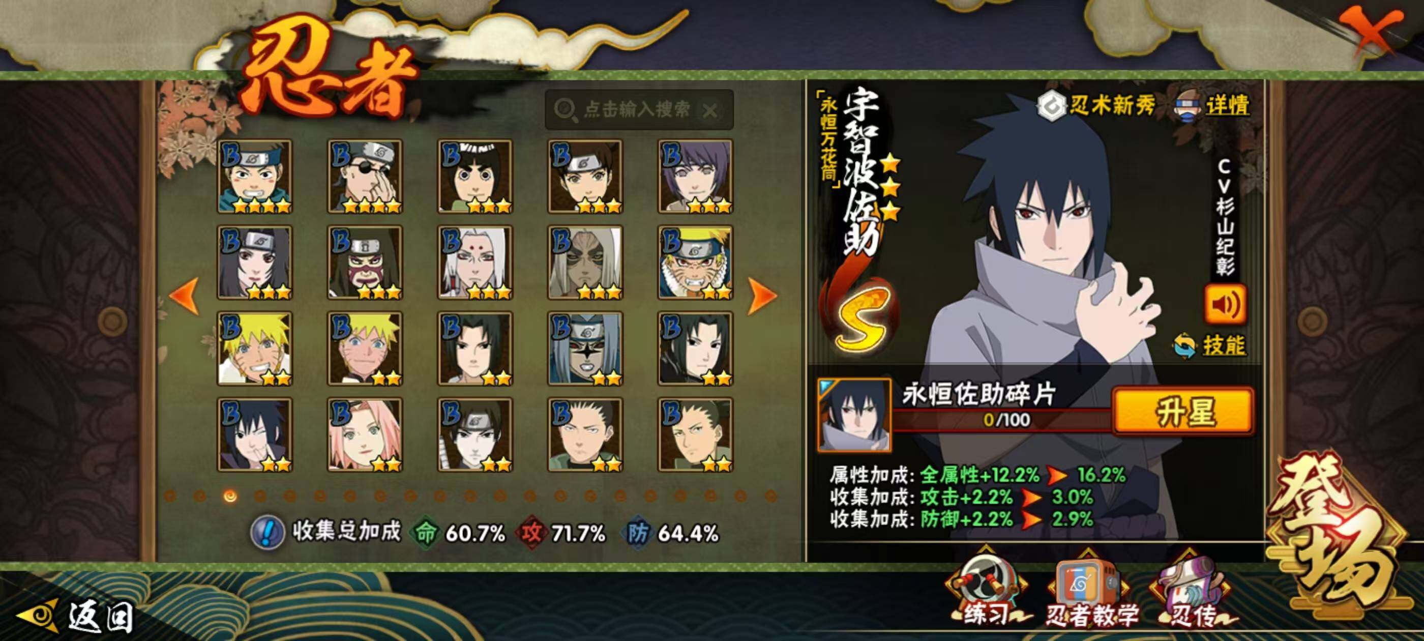 1677619 8s级忍者数-29a级忍者数 【s级忍者】:宇智波带土「忍界大战」3星,宇智波鼬「须佐能乎」3星,自来也「舞之豪杰」3星,大蛇丸3星,波风水门3星,药师兜「仙人模式」3星,佩恩「天道」3星,宇智波佐助「永恒万花筒」3星 【a级忍者】:艾「青年」2星,长门「青年」2星,波风水门「青年」2星,达鲁伊「博人传」2星,迪达拉2星,大蛇