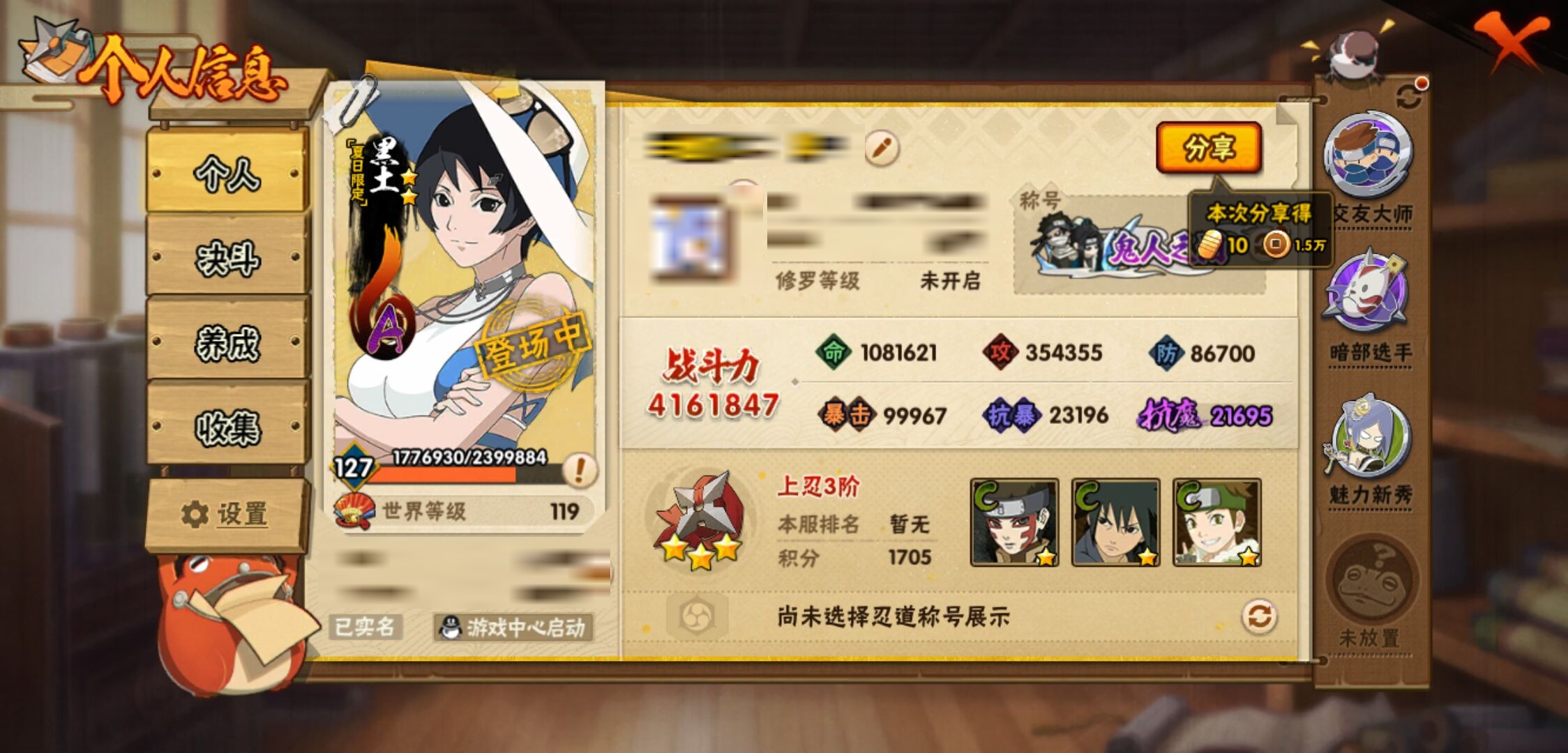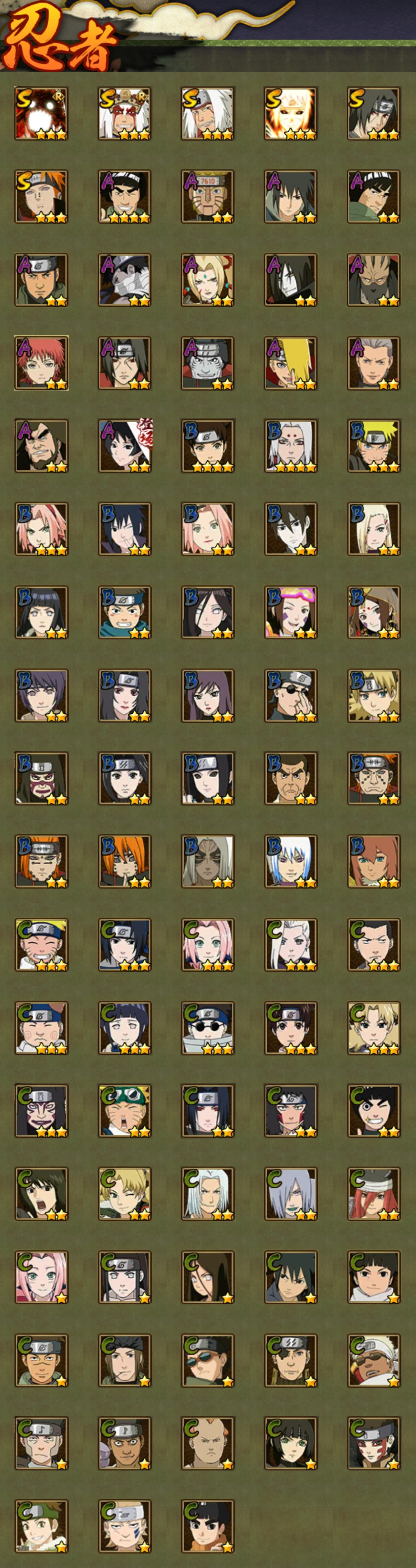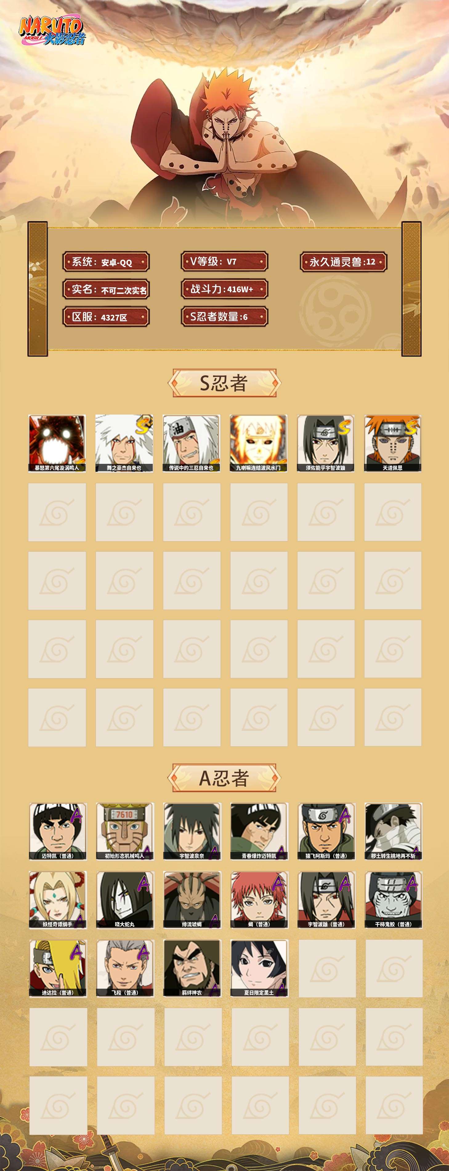 【火影忍者】【lyhy9430】战斗力:416w;段位:上忍3阶;vip:v7级;s忍:6个;a忍:16个;通灵兽:12个,s忍:暴怒第六尾漩涡鸣人|舞之豪杰自来也|传说中的三忍自来也|九喇嘛连结波风水门|须佐能乎宇智波鼬|天道佩恩__a忍:迈特凯(普通) 4星|初始形态机械鸣人|宇智波泉奈|青春爆炸迈特凯|猿飞阿斯玛(普通)|秽土转生桃地再不斩|妖怪奇谭纲手|晓大蛇丸|绯流琥蝎|蝎(普通)|宇智波鼬(普通)|干柿鬼鲛(普通)|迪达拉(普通)|飞段(普通)|羁绊神农|夏日限定黑土__通灵兽:忍犬(普通)|蓝蛇|蛤蟆吉|忍龟|镰鼬|砂之守鹤|猿魔|山椒鱼|蜃|蛤蟆仙人|鲛鲨|蛤蟆健