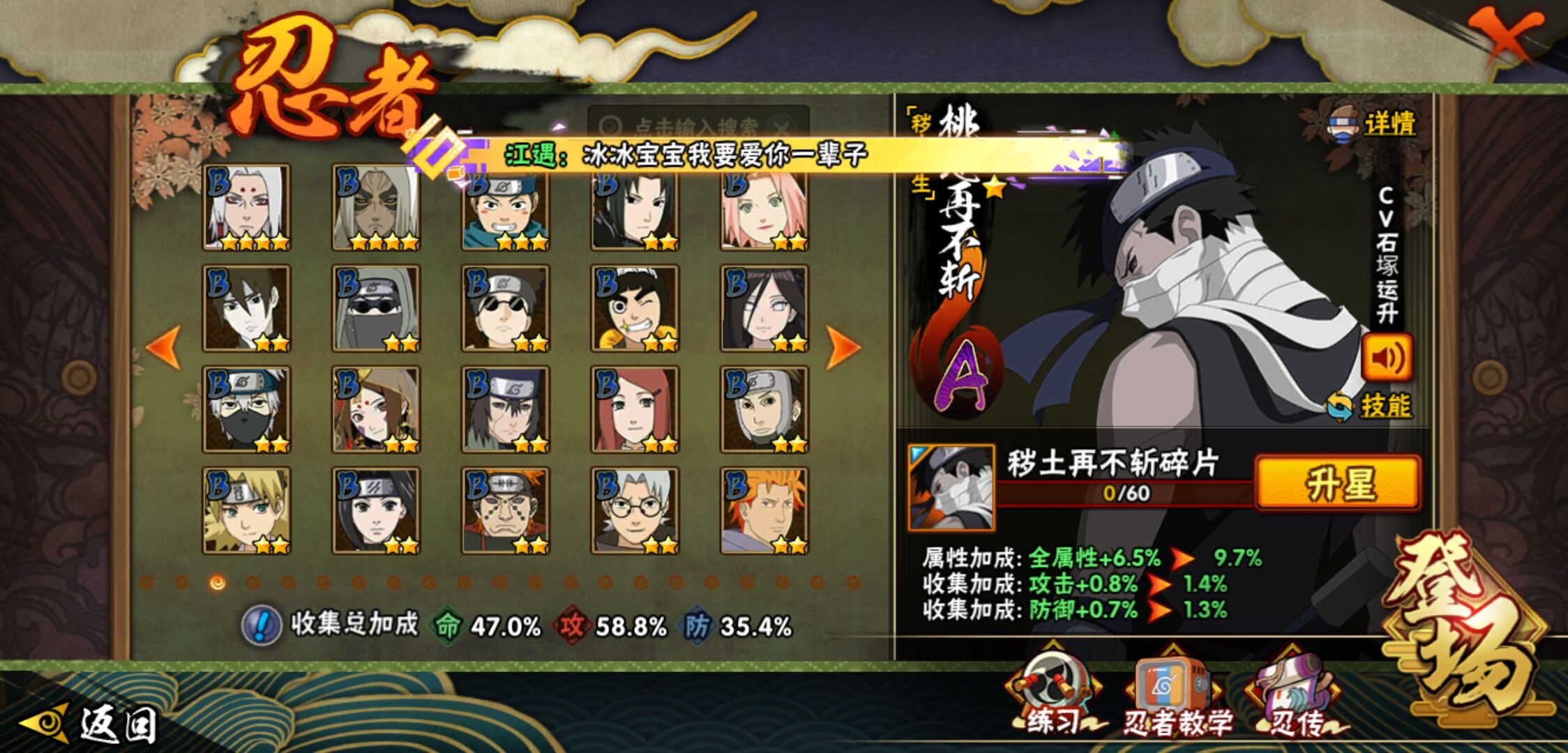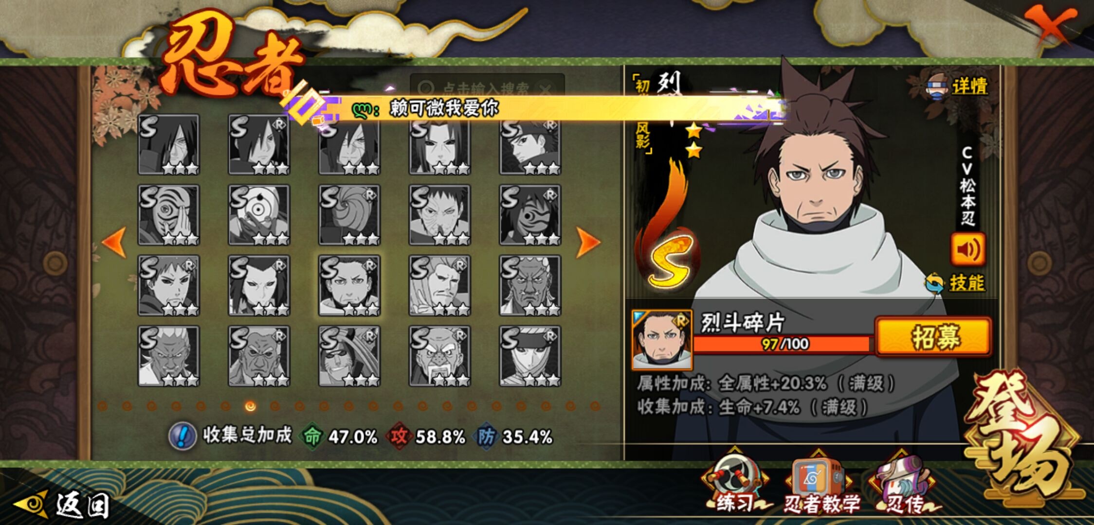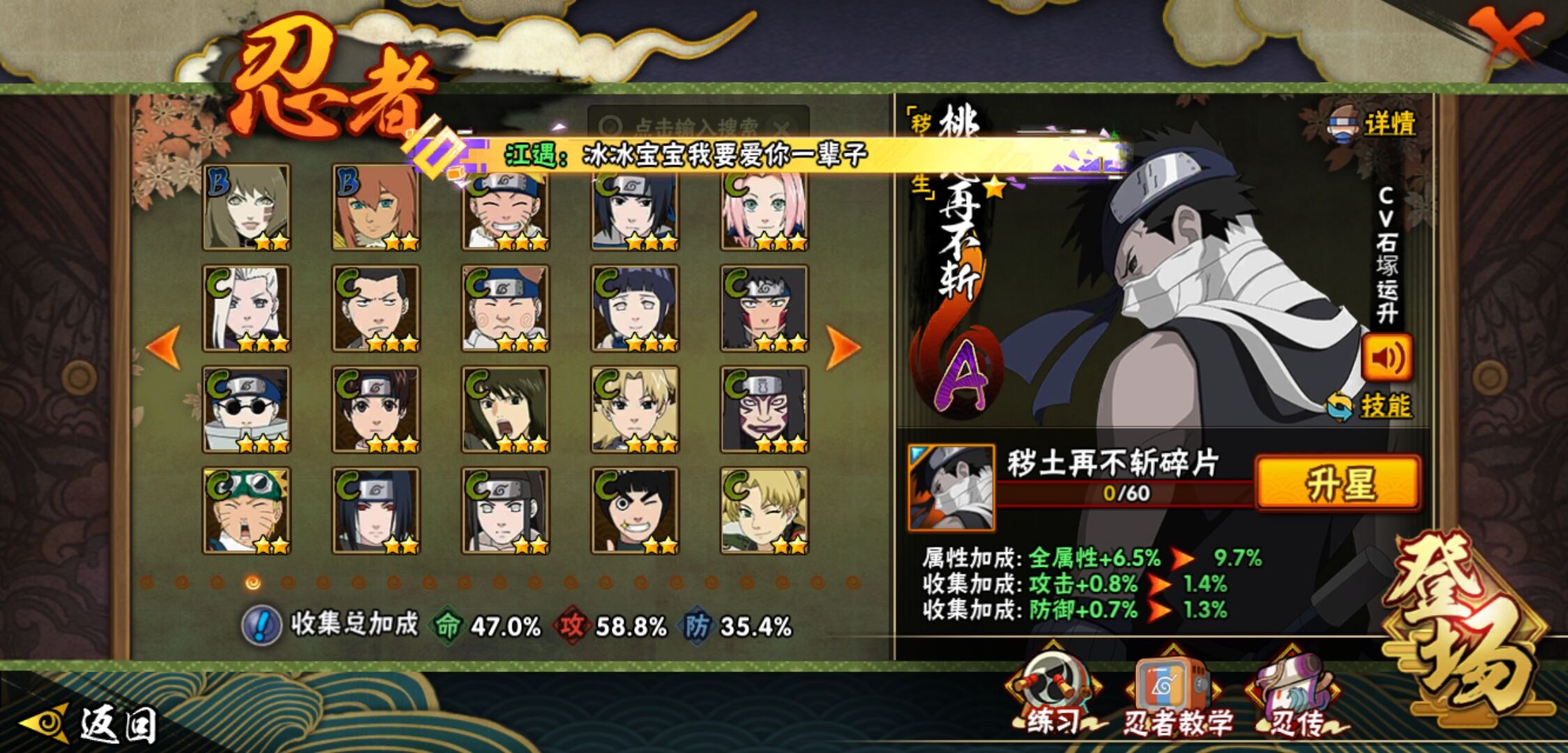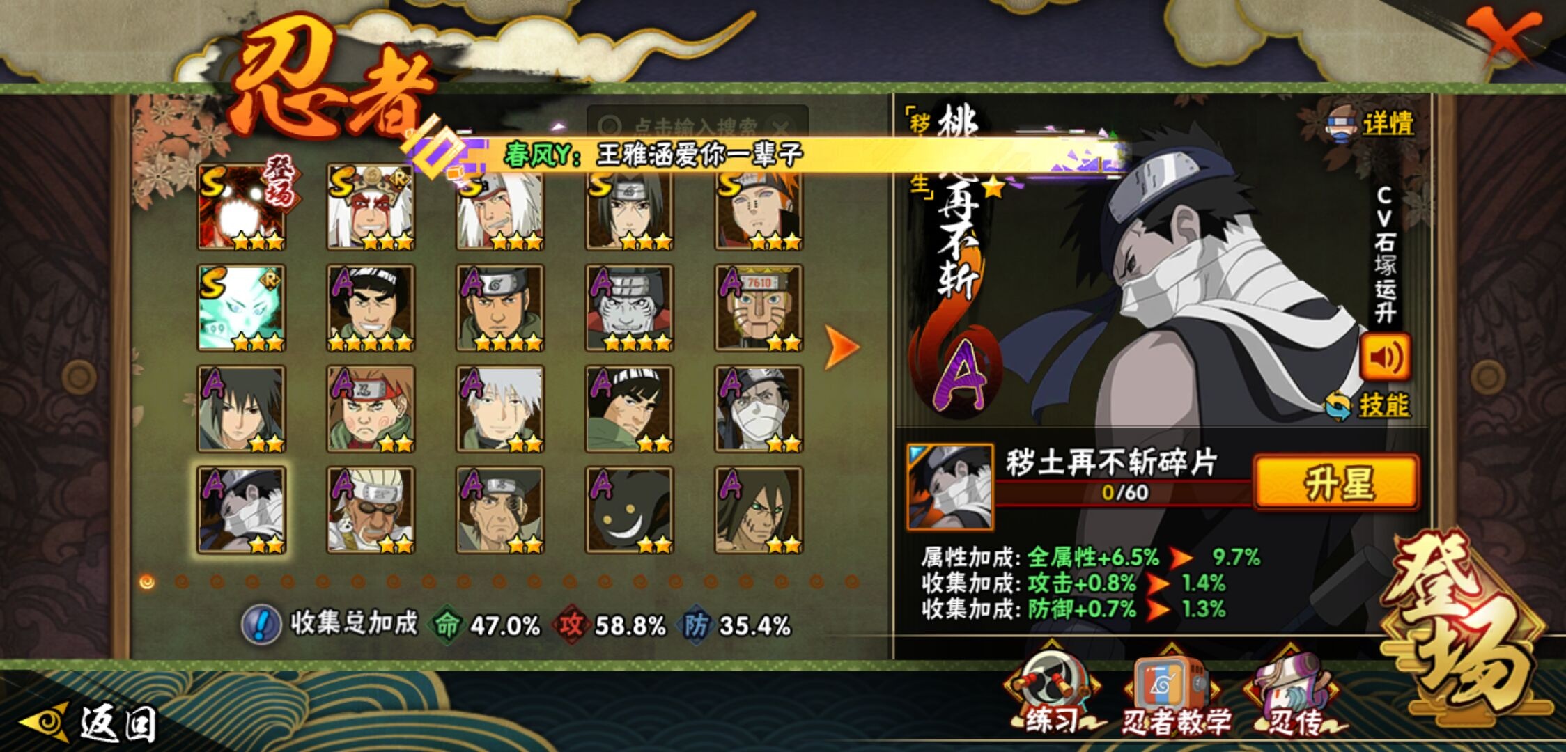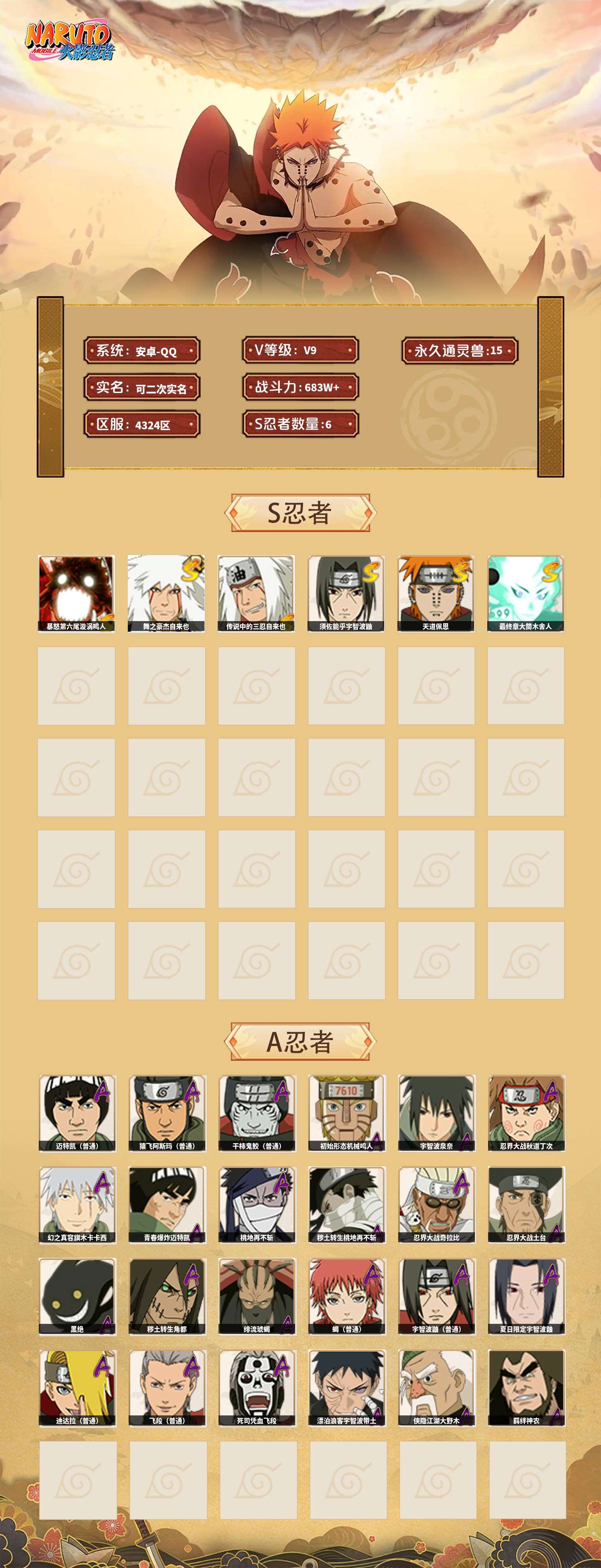 【火影忍者】【lyhy9436】战斗力:683w;段位:下忍1阶;本服排名:84;vip:v9级;s忍:6个;a忍:24个;通灵兽:15个,s忍:暴怒第六尾漩涡鸣人|舞之豪杰自来也|传说中的三忍自来也|须佐能乎宇智波鼬|天道佩恩|最终章大筒木舍人__a忍:迈特凯(普通) 5星|猿飞阿斯玛(普通) 4星|干柿鬼鲛(普通) 4星|初始形态机械鸣人|宇智波泉奈|忍界大战秋道丁次|幻之真容旗木卡卡西|青春爆炸迈特凯|桃地再不斩|秽土转生桃地再不斩|忍界大战奇拉比|忍界大战土台|黑绝|秽土转生角都|绯流琥蝎|蝎(普通)|宇智波鼬(普通)|夏日限定宇智波鼬|迪达拉(普通)|飞段(普通)|死司凭血飞段|漂泊浪客宇智波带土|侠隐江湖大野木|羁绊神农__通灵兽:忍犬(普通)|蓝蛇|蛤蟆吉|忍龟|砂之守鹤|镰鼬|猿魔|山椒鱼|蜃|蛤蟆仙人|鲛鲨|蛤蟆健|乌鸦(普通)|蛞蝓(普通)|蛤蟆龙