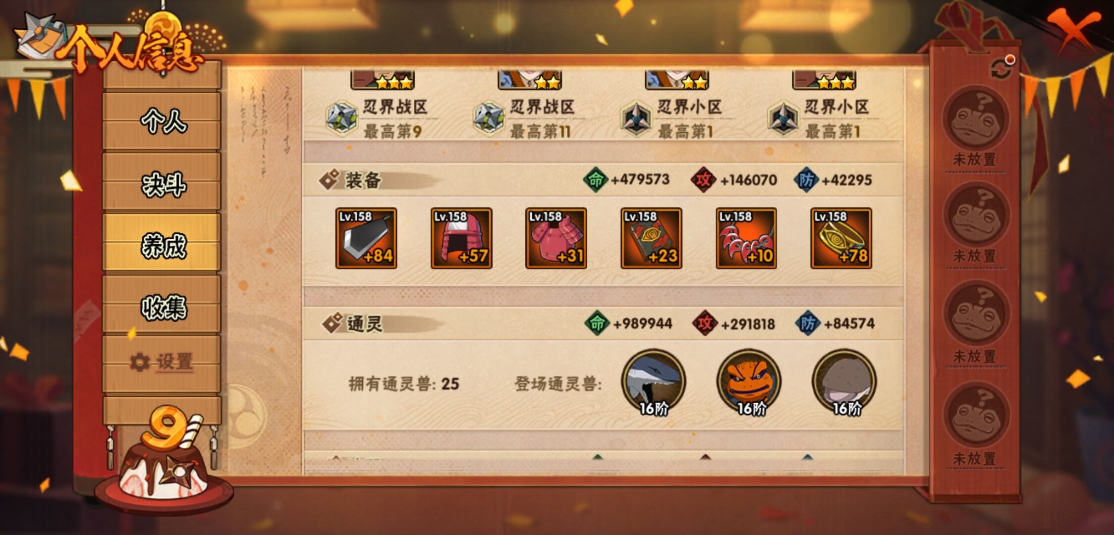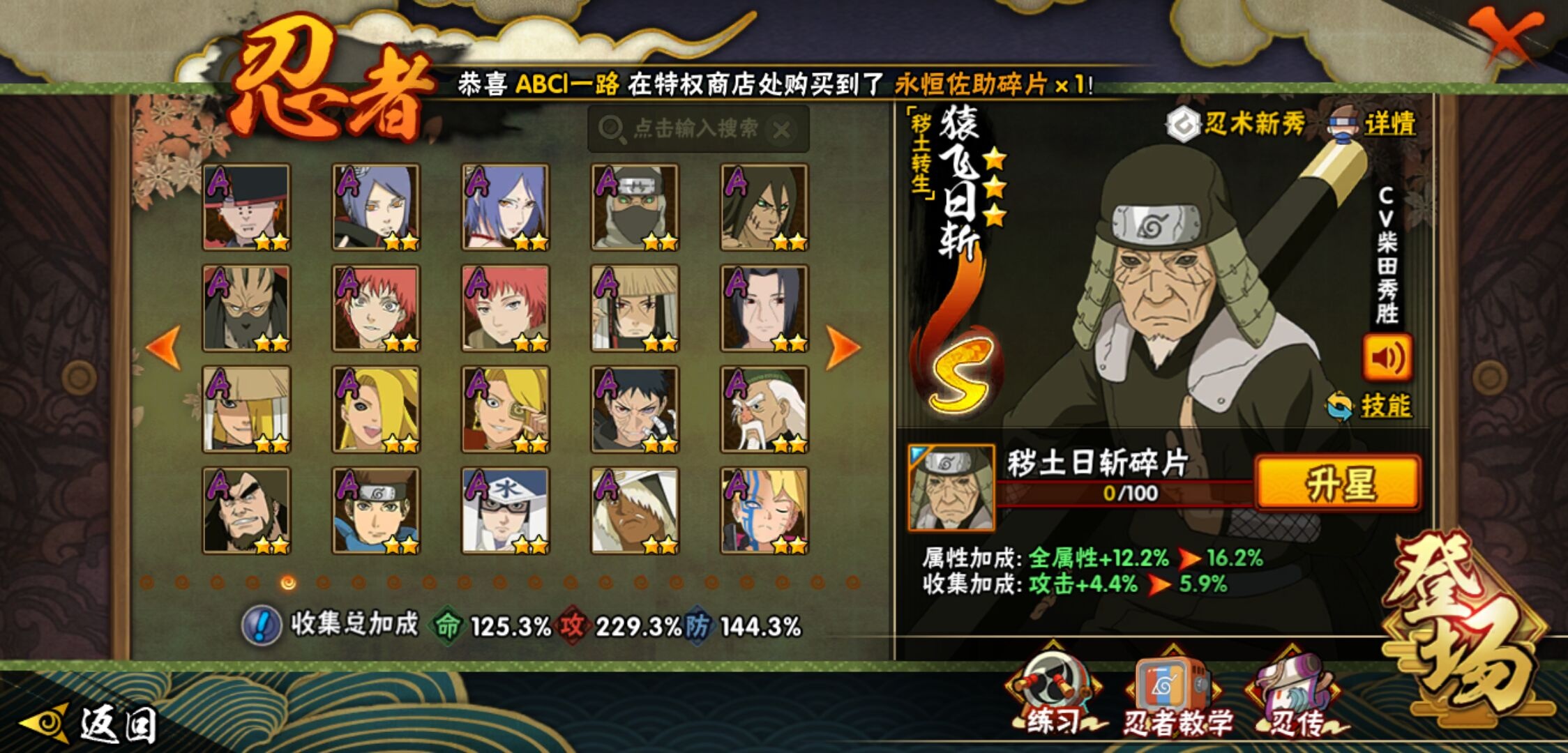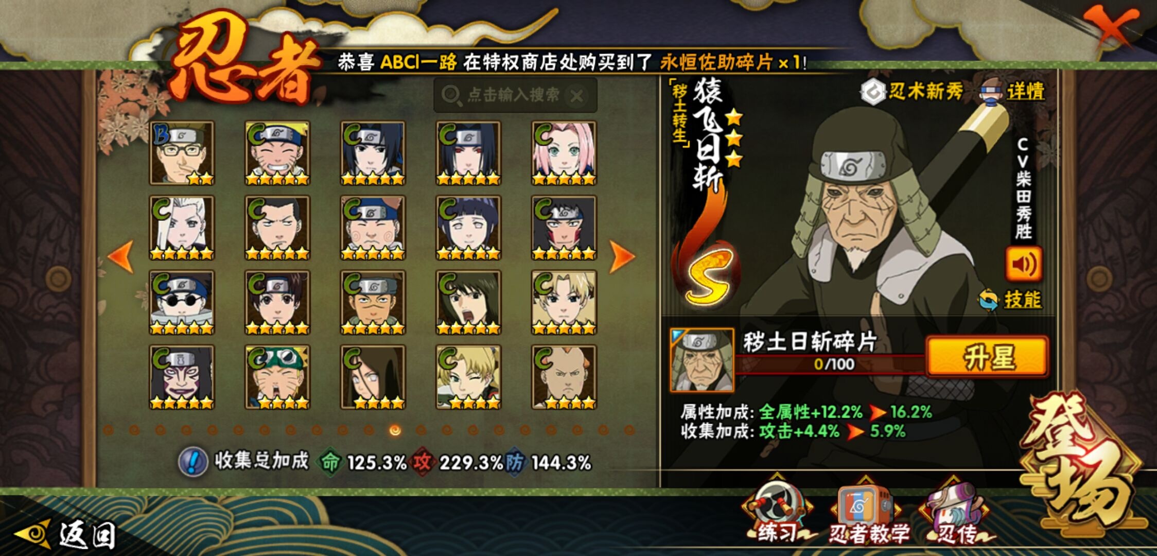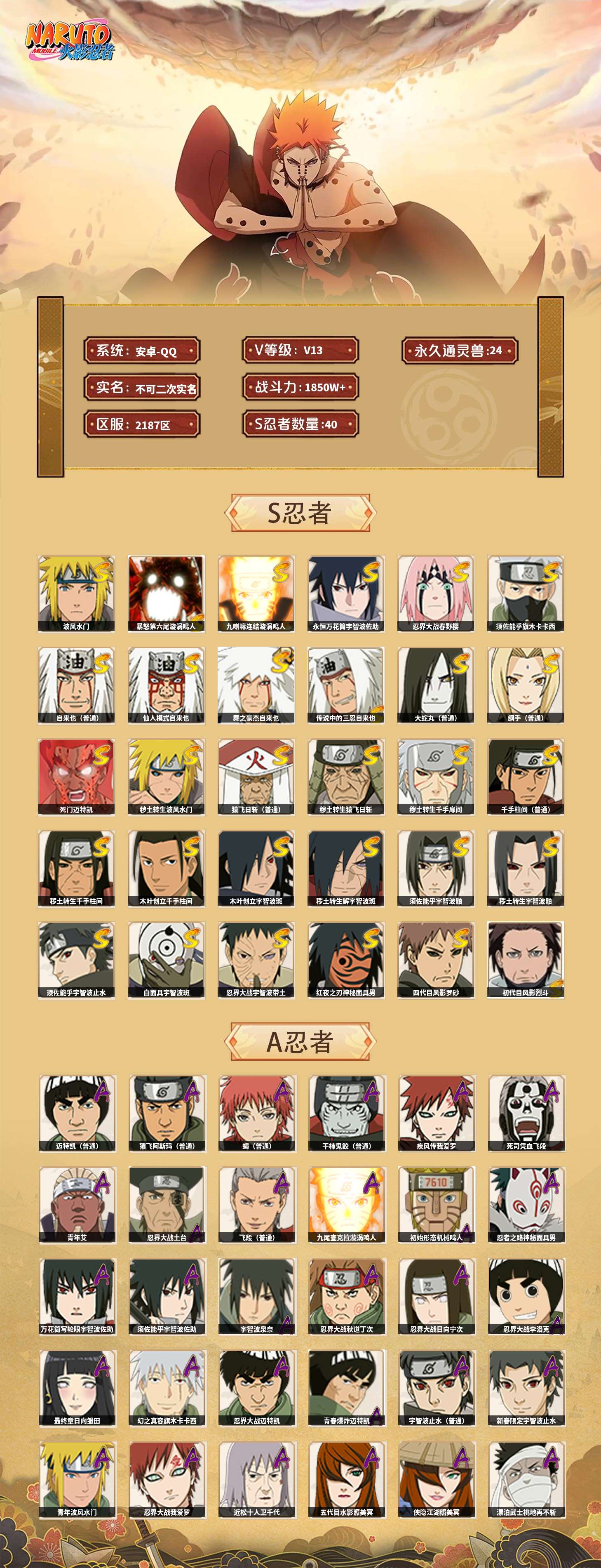 【火影忍者】【lyhy9440】战斗力:1850w;段位:上忍2阶;本服排名:50;vip:v13级;s忍:40个;a忍:62个;通灵兽:24个,s忍:波风水门 4星|暴怒第六尾漩涡鸣人|九喇嘛连结漩涡鸣人|永恒万花筒宇智波佐助|忍界大战春野樱|须佐能乎旗木卡卡西|自来也(普通)|仙人模式自来也|舞之豪杰自来也|传说中的三忍自来也|大蛇丸(普通)|纲手(普通)|死门迈特凯|秽土转生波风水门|猿飞日斩(普通)|秽土转生猿飞日斩|秽土转生千手扉间|千手柱间(普通)|秽土转生千手柱间|木叶创立千手柱间|木叶创立宇智波斑|秽土转生解宇智波斑|须佐能乎宇智波鼬|秽土转生宇智波鼬|须佐能乎宇智波止水|白面具宇智波斑|忍界大战宇智波带土|红夜之刃神秘面具男|四代目风影罗砂|初代目风影烈斗|秽土转生三代目风影|忍界大战艾|忍界大战大野木|秽土转生半藏|天道佩恩|超佩恩天道|仙人模式药师兜|最终章大筒木舍人|大筒木桃式|博人传大筒木金式__a忍:迈特凯(普通) 5星|猿飞阿斯玛(普通) 5星|蝎(普通) 5星|干柿鬼鲛(普通) 5星|疾风传我爱罗 4星|死司凭血飞段 4星|青年艾 3星|忍界大战土台 3星|飞段(普通) 3星|初始形态机械鸣人|忍者之路神秘面具男|九尾查克拉漩涡鸣人 3星|万花筒写轮眼宇智波佐助|须佐能乎宇智波佐助|宇智波泉奈|忍界大战秋道丁次|忍界大战日向宁次|忍界大战李洛克|最终章日向雏田|幻之真容旗木卡卡西|忍界大战迈特凯|青春爆炸迈特凯|宇智波止水(普通)|新春限定宇智波止水|青年波风水门|忍界大战我爱罗|近松十人卫千代|五代目水影照美冥|侠隐江湖照美冥|漂泊武士桃地再不斩|秽土转生桃地再不斩|忍界大战奇拉比|奇拉比(普通)|漂泊武士千手扉间|半蛇斗篷药师兜|侠隐江湖药师兜|不风|不缘|不动|青年长门|漂泊浪客佩恩六道|小南(普通)|漂泊浪客小南|地怨虞角都|秽土转生角都|绯流琥蝎|百机操演蝎|晓创生蝎|宇智波鼬(普通)|夏日限定宇智波鼬|迪达拉(普通)|秽土转生迪达拉|新春限定迪达拉|漂泊浪客宇智波带土|侠隐江湖大野木|羁绊神农|木叶上忍猿飞木叶丸|六代目水影长十郎|五代目雷影达鲁伊|桃式显现漩涡博人|仙人模式巳月|四代目土影黑土__通灵兽:忍犬(普通)|蓝蛇|蛤蟆吉|忍龟|镰鼬|猿魔|山椒鱼|砂之守鹤|蛞蝓(普通)|蜃|蛤蟆仙人|鲛鲨|蛤蟆健|乌鸦(普通)|蛤蟆龙|熊猫|螃蟹|蛤蟆广|梦貘|鹰|辛牙|蜘蛛|怒鬼爪|怒鬼无臂