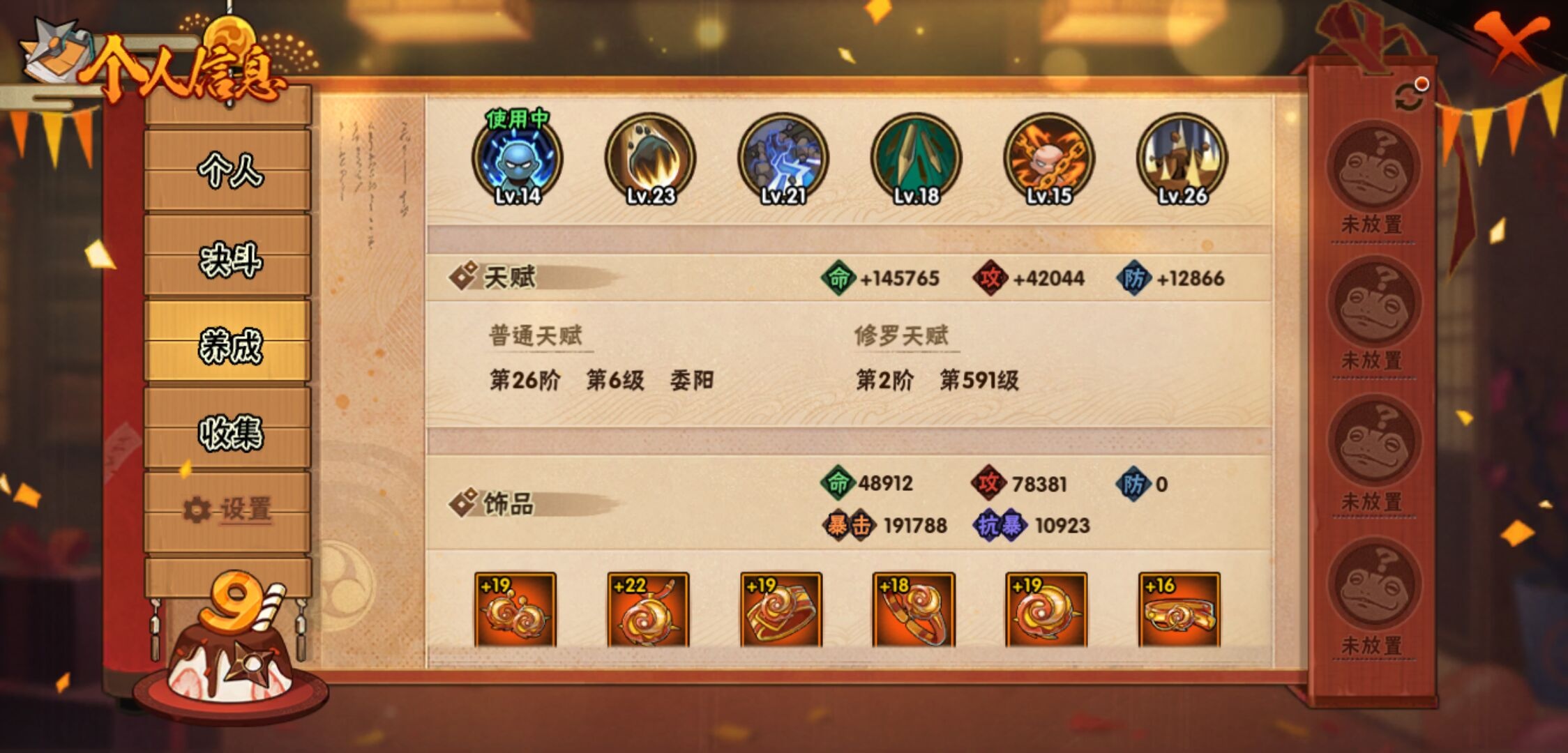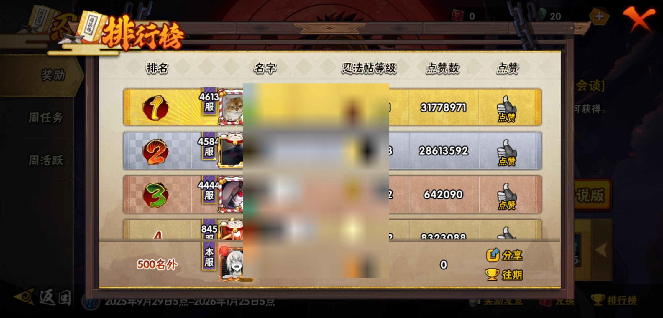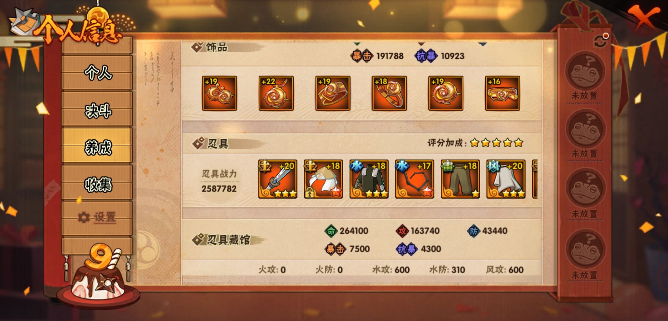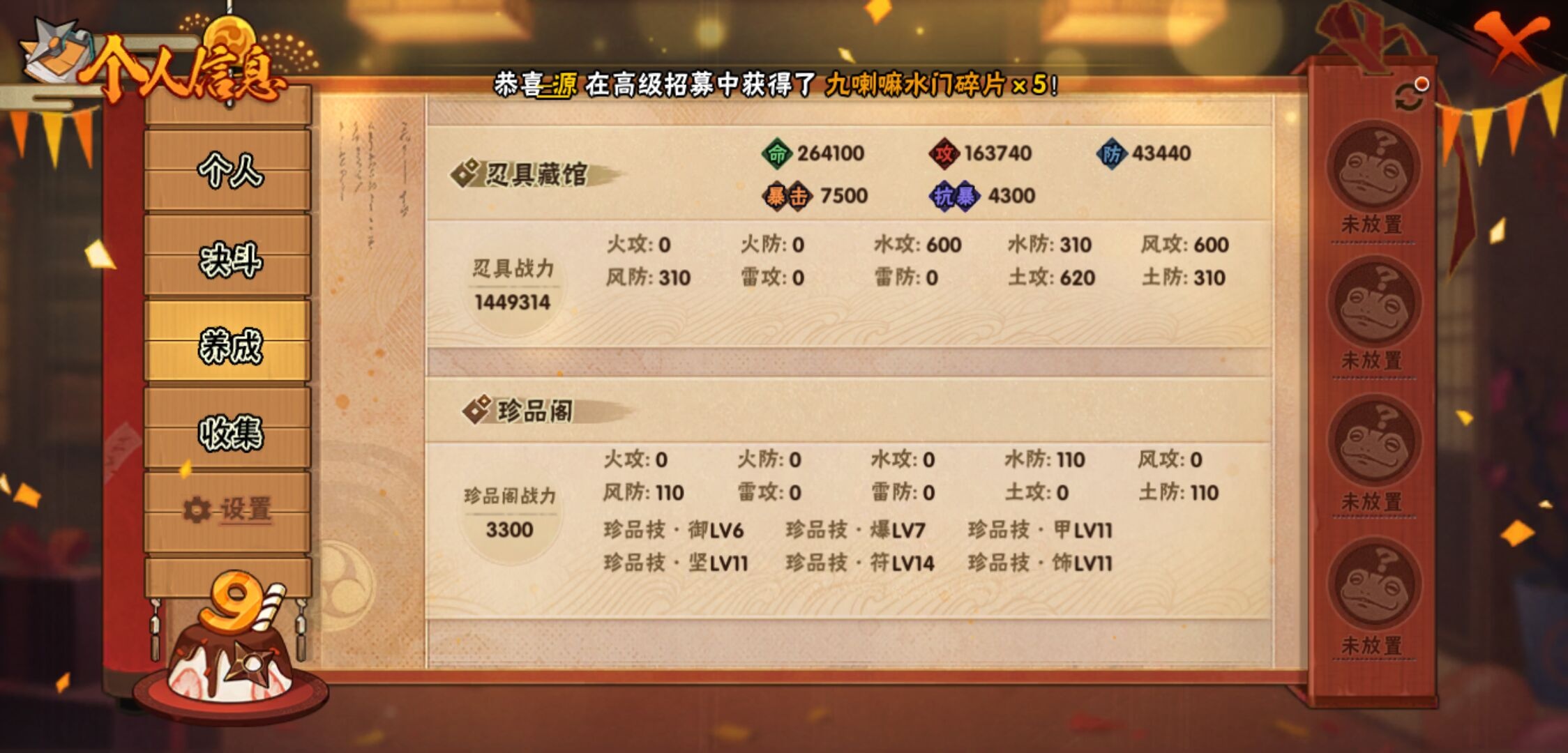 【火影忍者】【lyhy9440】战斗力:1850w;段位:上忍2阶;本服排名:50;vip:v13级;s忍:40个;a忍:62个;通灵兽:24个,s忍:波风水门 4星|暴怒第六尾漩涡鸣人|九喇嘛连结漩涡鸣人|永恒万花筒宇智波佐助|忍界大战春野樱|须佐能乎旗木卡卡西|自来也(普通)|仙人模式自来也|舞之豪杰自来也|传说中的三忍自来也|大蛇丸(普通)|纲手(普通)|死门迈特凯|秽土转生波风水门|猿飞日斩(普通)|秽土转生猿飞日斩|秽土转生千手扉间|千手柱间(普通)|秽土转生千手柱间|木叶创立千手柱间|木叶创立宇智波斑|秽土转生解宇智波斑|须佐能乎宇智波鼬|秽土转生宇智波鼬|须佐能乎宇智波止水|白面具宇智波斑|忍界大战宇智波带土|红夜之刃神秘面具男|四代目风影罗砂|初代目风影烈斗|秽土转生三代目风影|忍界大战艾|忍界大战大野木|秽土转生半藏|天道佩恩|超佩恩天道|仙人模式药师兜|最终章大筒木舍人|大筒木桃式|博人传大筒木金式__a忍:迈特凯(普通) 5星|猿飞阿斯玛(普通) 5星|蝎(普通) 5星|干柿鬼鲛(普通) 5星|疾风传我爱罗 4星|死司凭血飞段 4星|青年艾 3星|忍界大战土台 3星|飞段(普通) 3星|初始形态机械鸣人|忍者之路神秘面具男|九尾查克拉漩涡鸣人 3星|万花筒写轮眼宇智波佐助|须佐能乎宇智波佐助|宇智波泉奈|忍界大战秋道丁次|忍界大战日向宁次|忍界大战李洛克|最终章日向雏田|幻之真容旗木卡卡西|忍界大战迈特凯|青春爆炸迈特凯|宇智波止水(普通)|新春限定宇智波止水|青年波风水门|忍界大战我爱罗|近松十人卫千代|五代目水影照美冥|侠隐江湖照美冥|漂泊武士桃地再不斩|秽土转生桃地再不斩|忍界大战奇拉比|奇拉比(普通)|漂泊武士千手扉间|半蛇斗篷药师兜|侠隐江湖药师兜|不风|不缘|不动|青年长门|漂泊浪客佩恩六道|小南(普通)|漂泊浪客小南|地怨虞角都|秽土转生角都|绯流琥蝎|百机操演蝎|晓创生蝎|宇智波鼬(普通)|夏日限定宇智波鼬|迪达拉(普通)|秽土转生迪达拉|新春限定迪达拉|漂泊浪客宇智波带土|侠隐江湖大野木|羁绊神农|木叶上忍猿飞木叶丸|六代目水影长十郎|五代目雷影达鲁伊|桃式显现漩涡博人|仙人模式巳月|四代目土影黑土__通灵兽:忍犬(普通)|蓝蛇|蛤蟆吉|忍龟|镰鼬|猿魔|山椒鱼|砂之守鹤|蛞蝓(普通)|蜃|蛤蟆仙人|鲛鲨|蛤蟆健|乌鸦(普通)|蛤蟆龙|熊猫|螃蟹|蛤蟆广|梦貘|鹰|辛牙|蜘蛛|怒鬼爪|怒鬼无臂