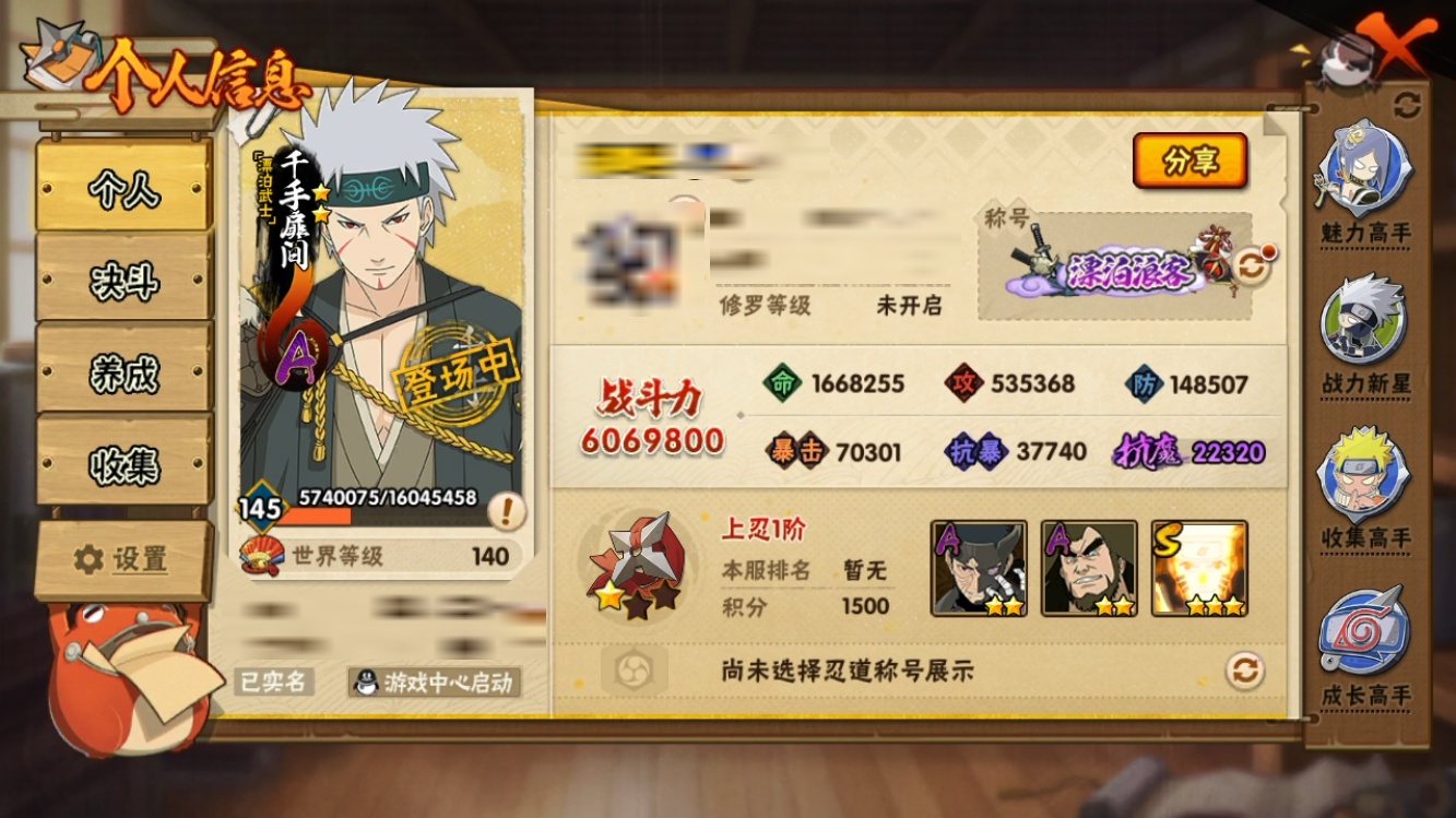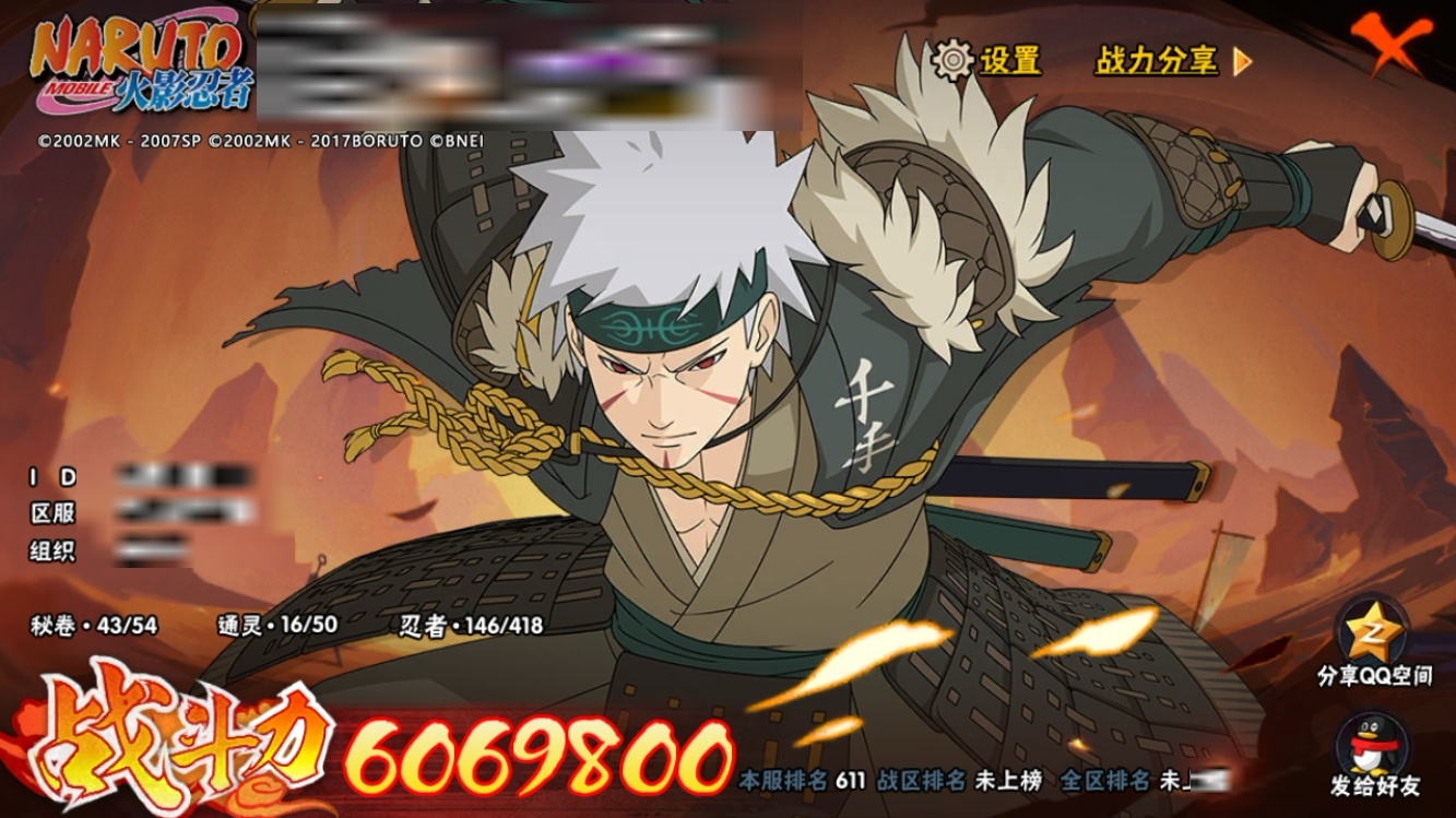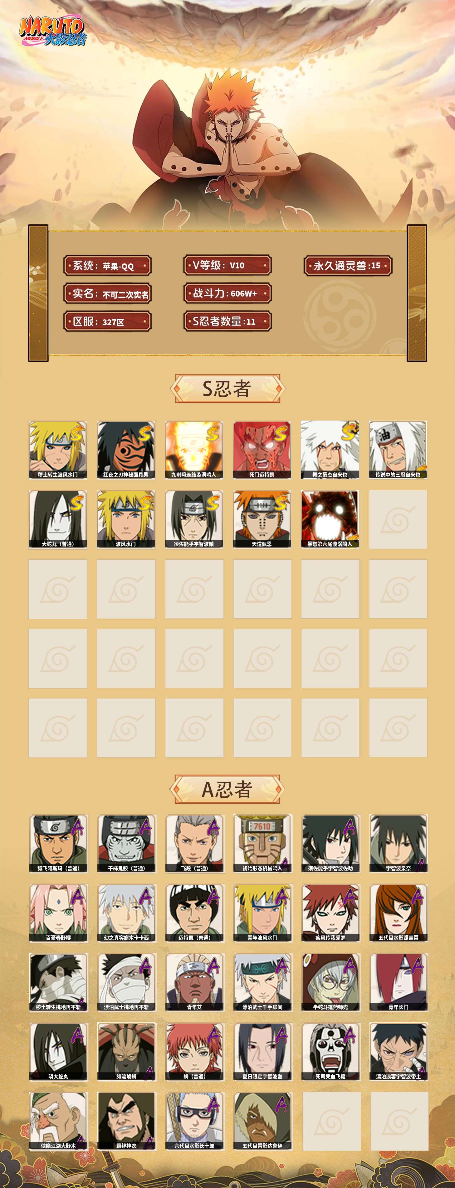 【火影忍者】【lyhy9445】战斗力:606w;段位:上忍1阶;本服排名:611;vip:v10级;s忍:11个;a忍:28个;通灵兽:15个,s忍:秽土转生波风水门|红夜之刃神秘面具男|九喇嘛连结漩涡鸣人|死门迈特凯|舞之豪杰自来也|传说中的三忍自来也|大蛇丸(普通)|波风水门|须佐能乎宇智波鼬|天道佩恩|暴怒第六尾漩涡鸣人__a忍:猿飞阿斯玛(普通)|干柿鬼鲛(普通)|飞段(普通)|初始形态机械鸣人|须佐能乎宇智波佐助|宇智波泉奈|百豪春野樱|幻之真容旗木卡卡西|迈特凯(普通)|青年波风水门|疾风传我爱罗|五代目水影照美冥|秽土转生桃地再不斩|漂泊武士桃地再不斩|青年艾|漂泊武士千手扉间|半蛇斗篷药师兜|青年长门|晓大蛇丸|绯流琥蝎|蝎(普通)|夏日限定宇智波鼬|死司凭血飞段|漂泊浪客宇智波带土|侠隐江湖大野木|羁绊神农|六代目水影长十郎|五代目雷影达鲁伊__通灵兽:忍犬(普通)|蓝蛇|蛤蟆吉|忍龟|镰鼬|猿魔|山椒鱼|蜃|蛤蟆仙人|鲛鲨|砂之守鹤|蛤蟆健|乌鸦(普通)|蛤蟆龙|蛞蝓(普通)