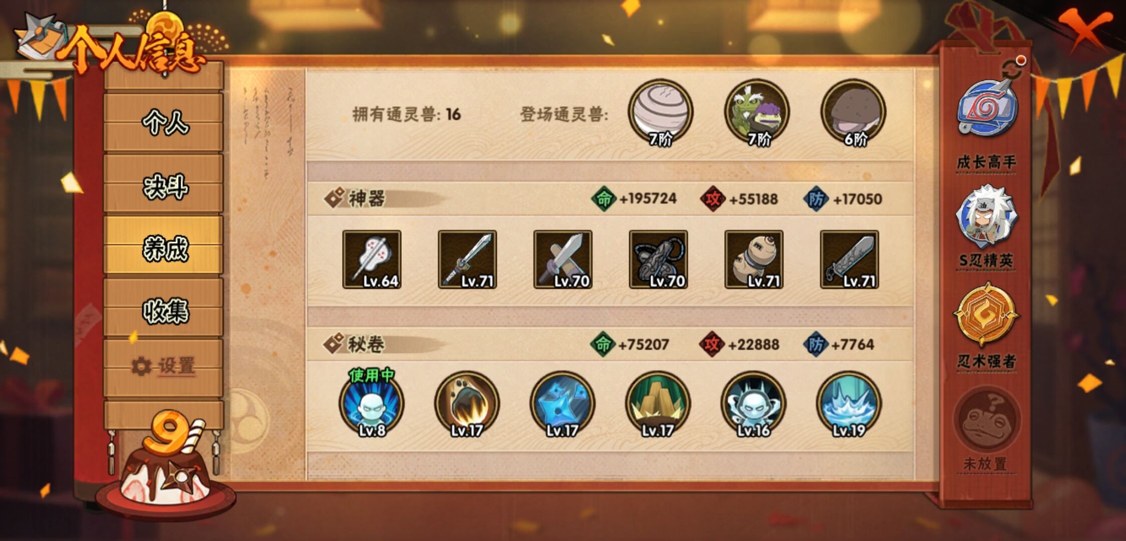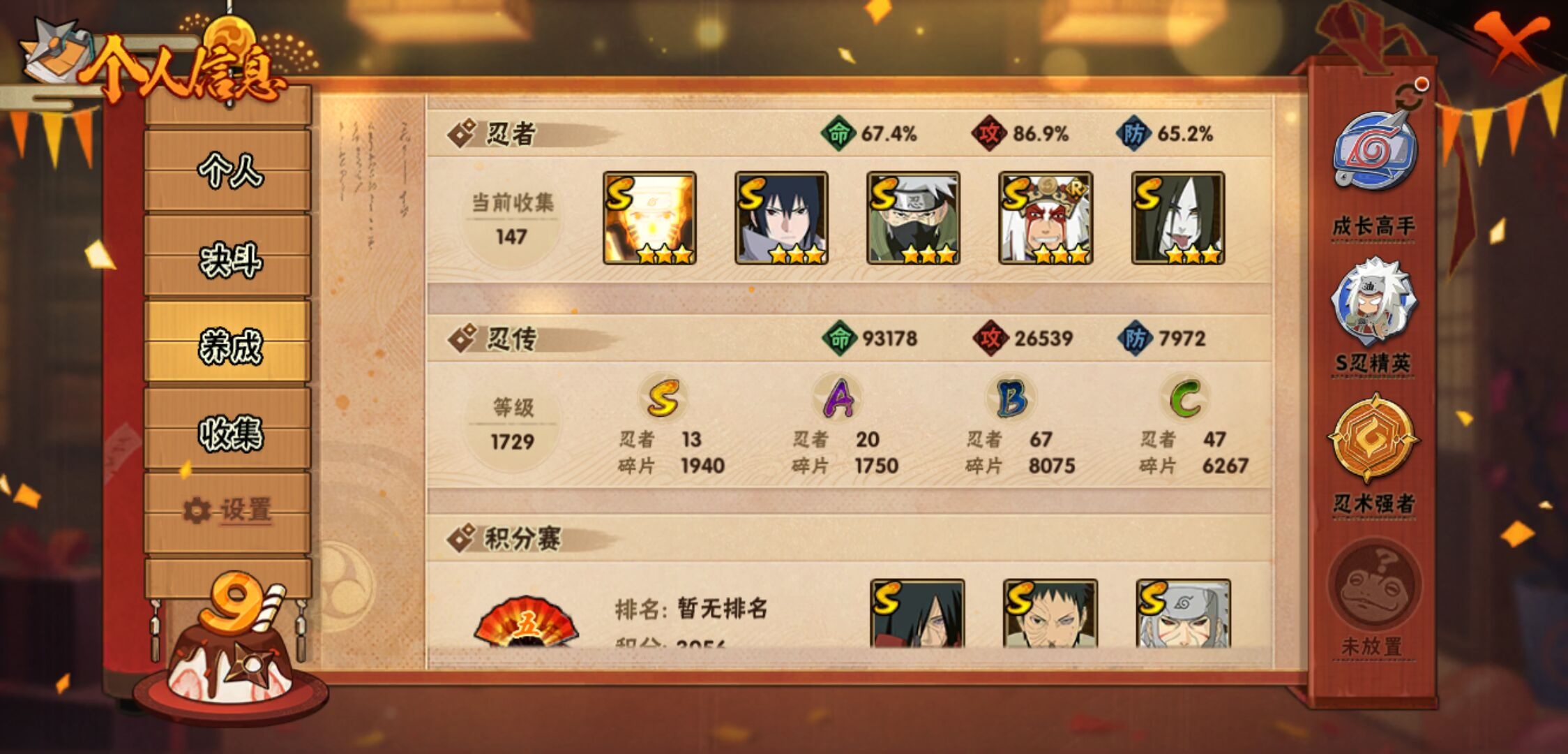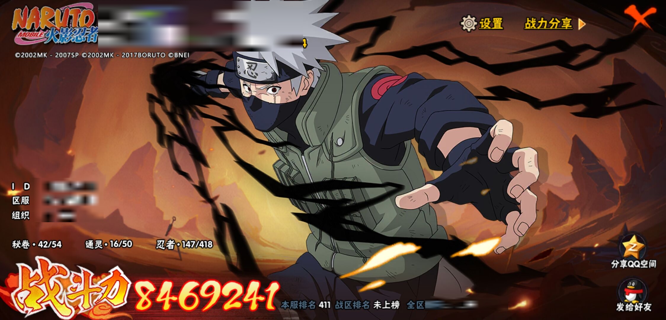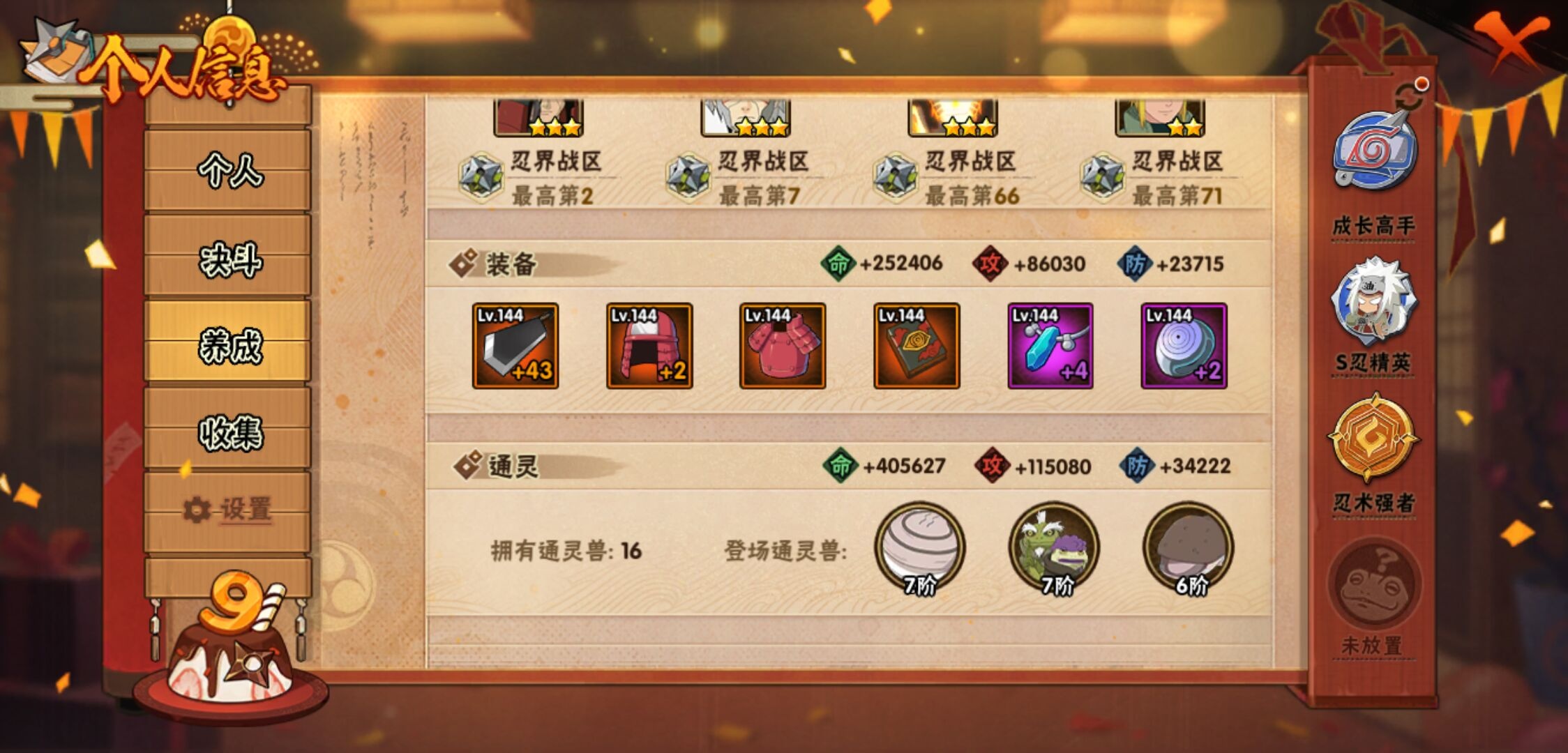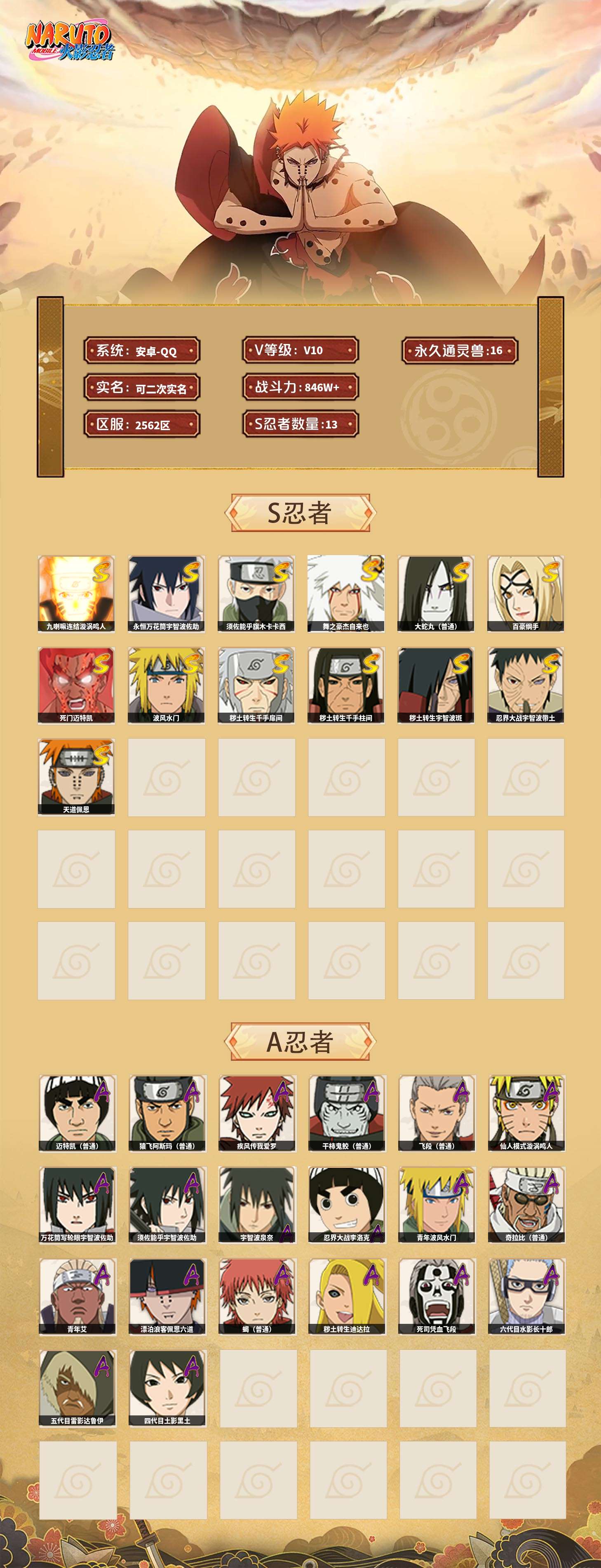 【火影忍者】【lyhy9450】战斗力:846w;段位:中忍1阶;本服排名:411;vip:v10级;s忍:13个;a忍:20个;通灵兽:16个,s忍:九喇嘛连结漩涡鸣人|永恒万花筒宇智波佐助|须佐能乎旗木卡卡西|舞之豪杰自来也|大蛇丸(普通)|百豪纲手|死门迈特凯|波风水门|秽土转生千手扉间|秽土转生千手柱间|秽土转生宇智波斑|忍界大战宇智波带土|天道佩恩__a忍:迈特凯(普通) 4星|猿飞阿斯玛(普通) 3星|疾风传我爱罗 3星|干柿鬼鲛(普通) 3星|飞段(普通) 3星|仙人模式漩涡鸣人|万花筒写轮眼宇智波佐助|须佐能乎宇智波佐助|宇智波泉奈|忍界大战李洛克|青年波风水门|奇拉比(普通)|青年艾|漂泊浪客佩恩六道|蝎(普通)|秽土转生迪达拉|死司凭血飞段|六代目水影长十郎|五代目雷影达鲁伊|四代目土影黑土__通灵兽:忍犬(普通)|蓝蛇|蛤蟆吉|砂之守鹤|忍龟|镰鼬|猿魔|山椒鱼|蛞蝓(普通)|蜃|蛤蟆仙人|鲛鲨|蛤蟆健|乌鸦(普通)|蛤蟆龙|蛤蟆广