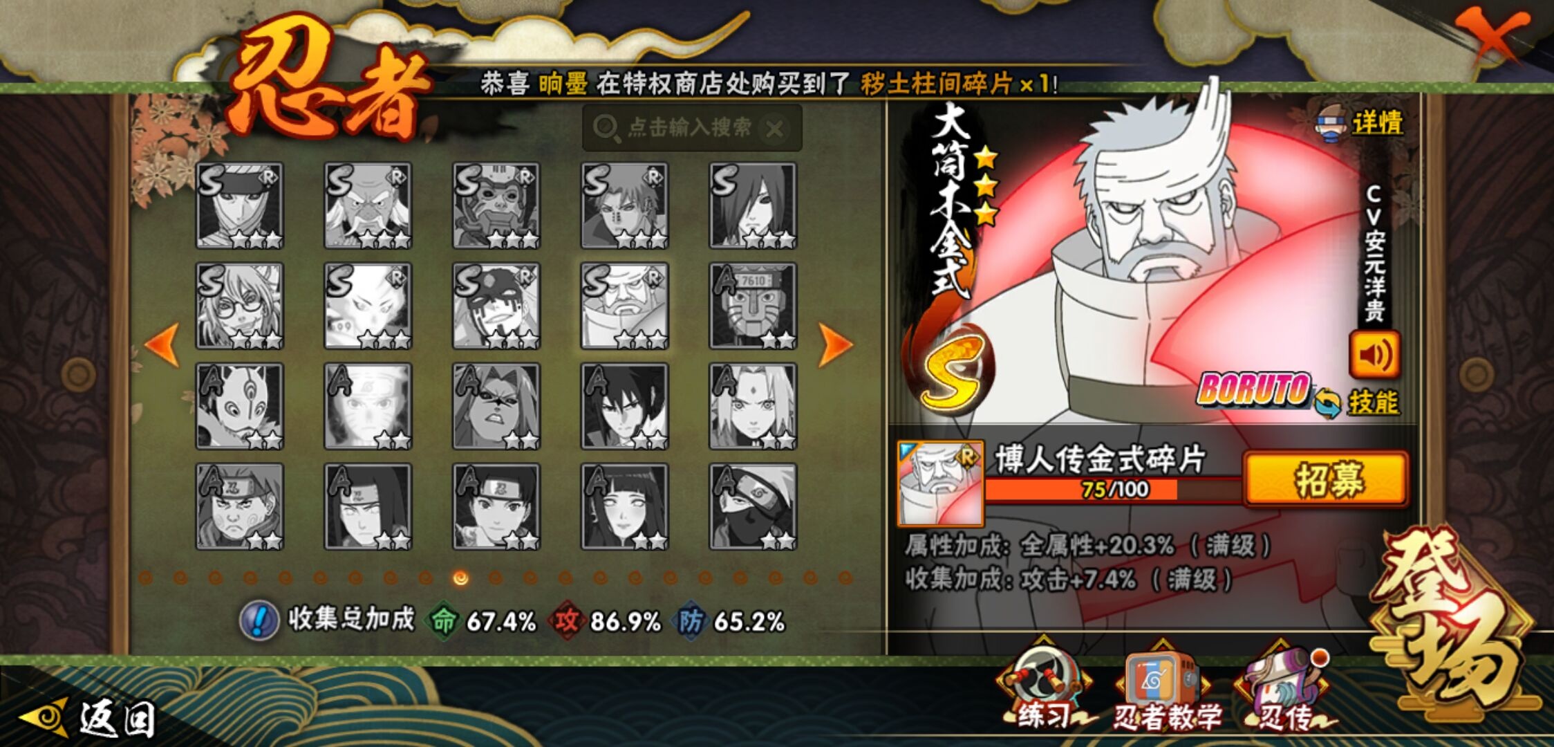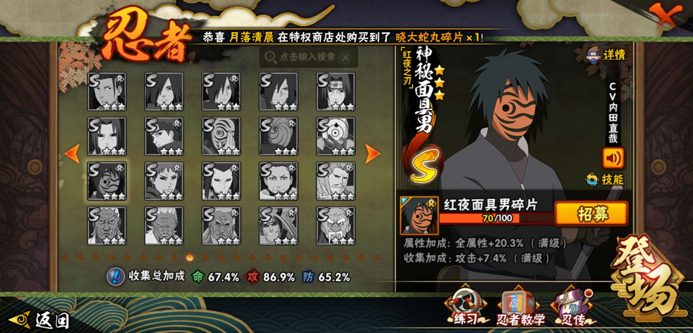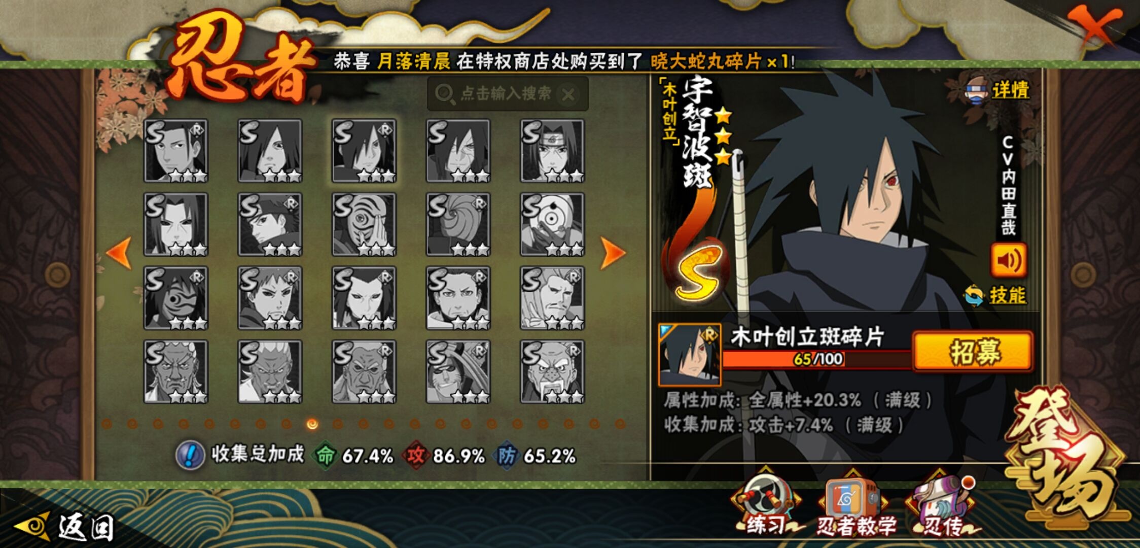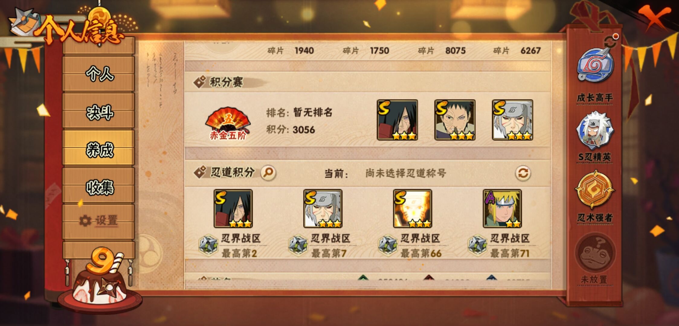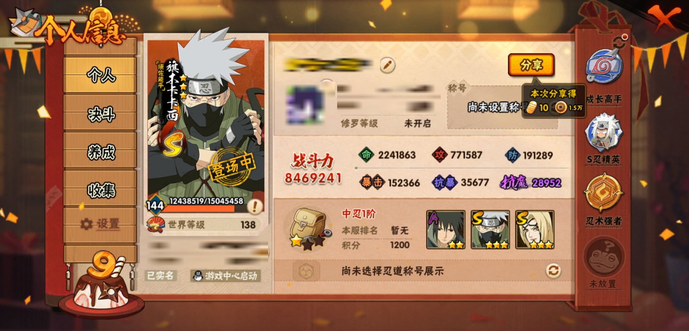 【火影忍者】【lyhy9450】战斗力:846w;段位:中忍1阶;本服排名:411;vip:v10级;s忍:13个;a忍:20个;通灵兽:16个,s忍:九喇嘛连结漩涡鸣人|永恒万花筒宇智波佐助|须佐能乎旗木卡卡西|舞之豪杰自来也|大蛇丸(普通)|百豪纲手|死门迈特凯|波风水门|秽土转生千手扉间|秽土转生千手柱间|秽土转生宇智波斑|忍界大战宇智波带土|天道佩恩__a忍:迈特凯(普通) 4星|猿飞阿斯玛(普通) 3星|疾风传我爱罗 3星|干柿鬼鲛(普通) 3星|飞段(普通) 3星|仙人模式漩涡鸣人|万花筒写轮眼宇智波佐助|须佐能乎宇智波佐助|宇智波泉奈|忍界大战李洛克|青年波风水门|奇拉比(普通)|青年艾|漂泊浪客佩恩六道|蝎(普通)|秽土转生迪达拉|死司凭血飞段|六代目水影长十郎|五代目雷影达鲁伊|四代目土影黑土__通灵兽:忍犬(普通)|蓝蛇|蛤蟆吉|砂之守鹤|忍龟|镰鼬|猿魔|山椒鱼|蛞蝓(普通)|蜃|蛤蟆仙人|鲛鲨|蛤蟆健|乌鸦(普通)|蛤蟆龙|蛤蟆广
