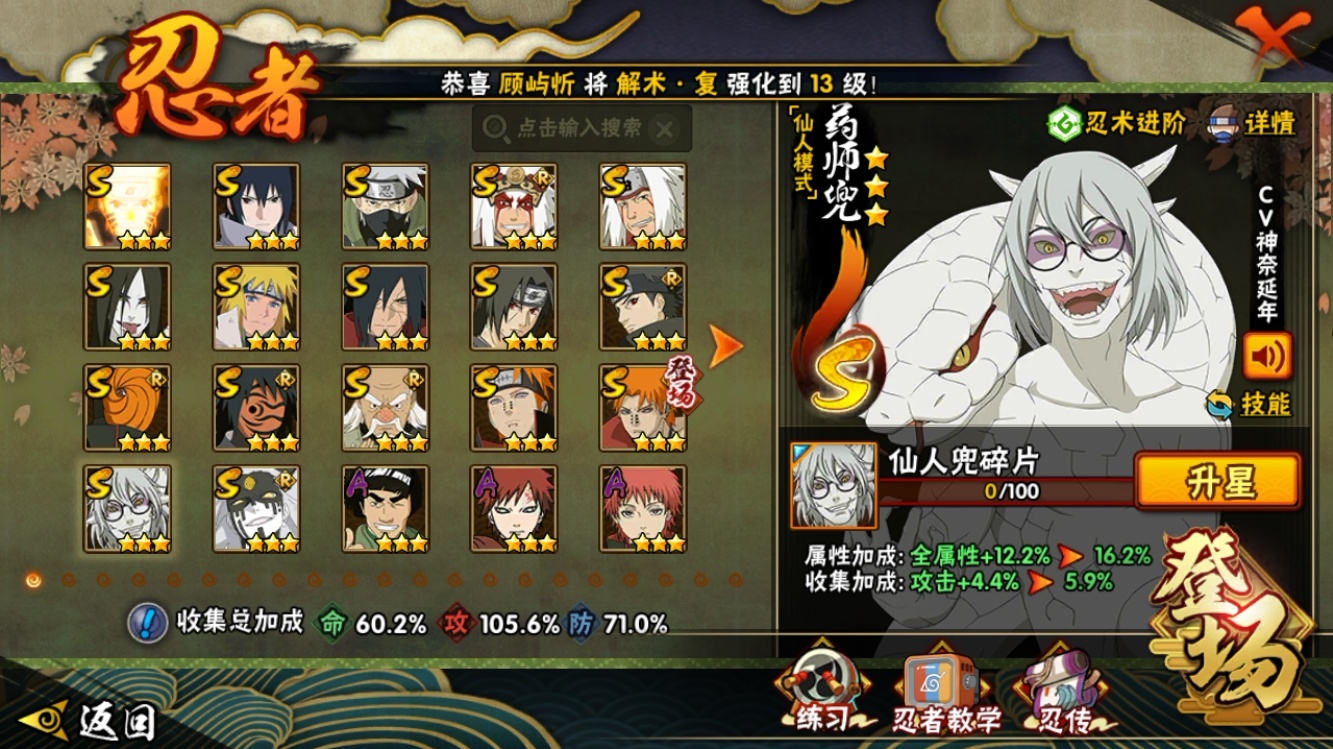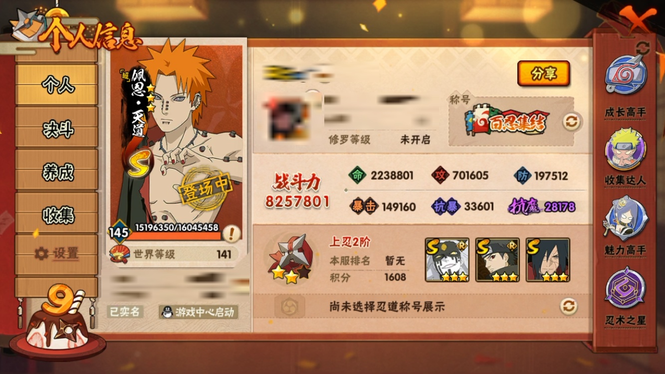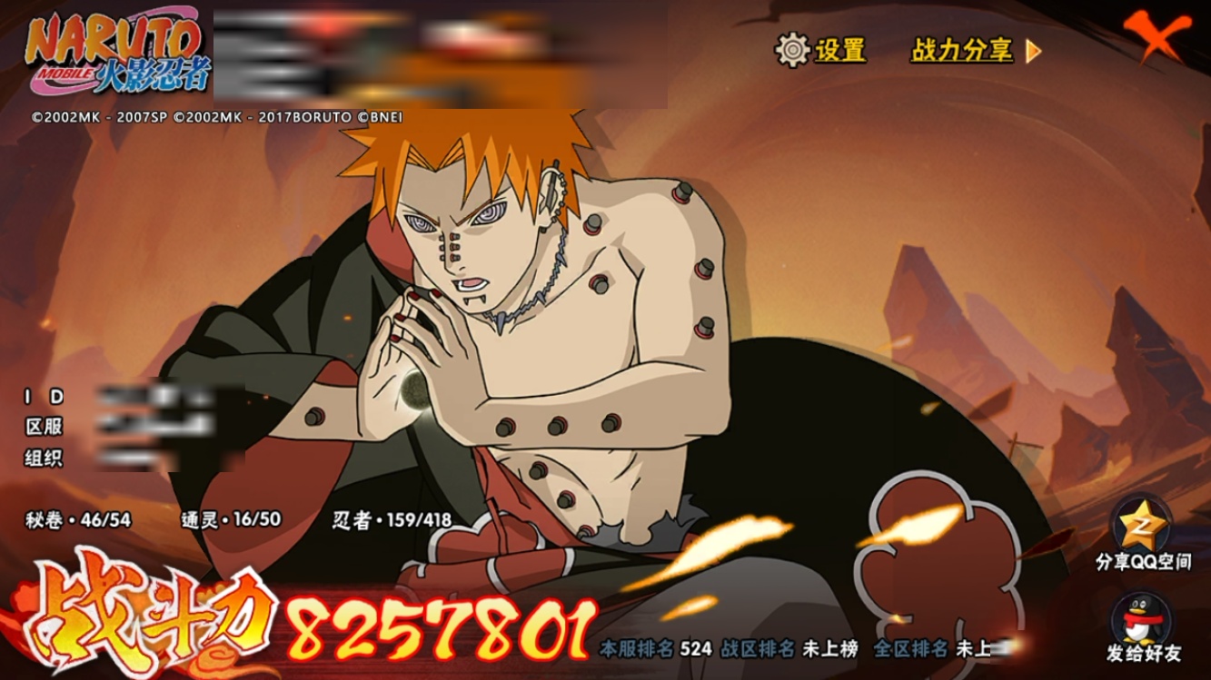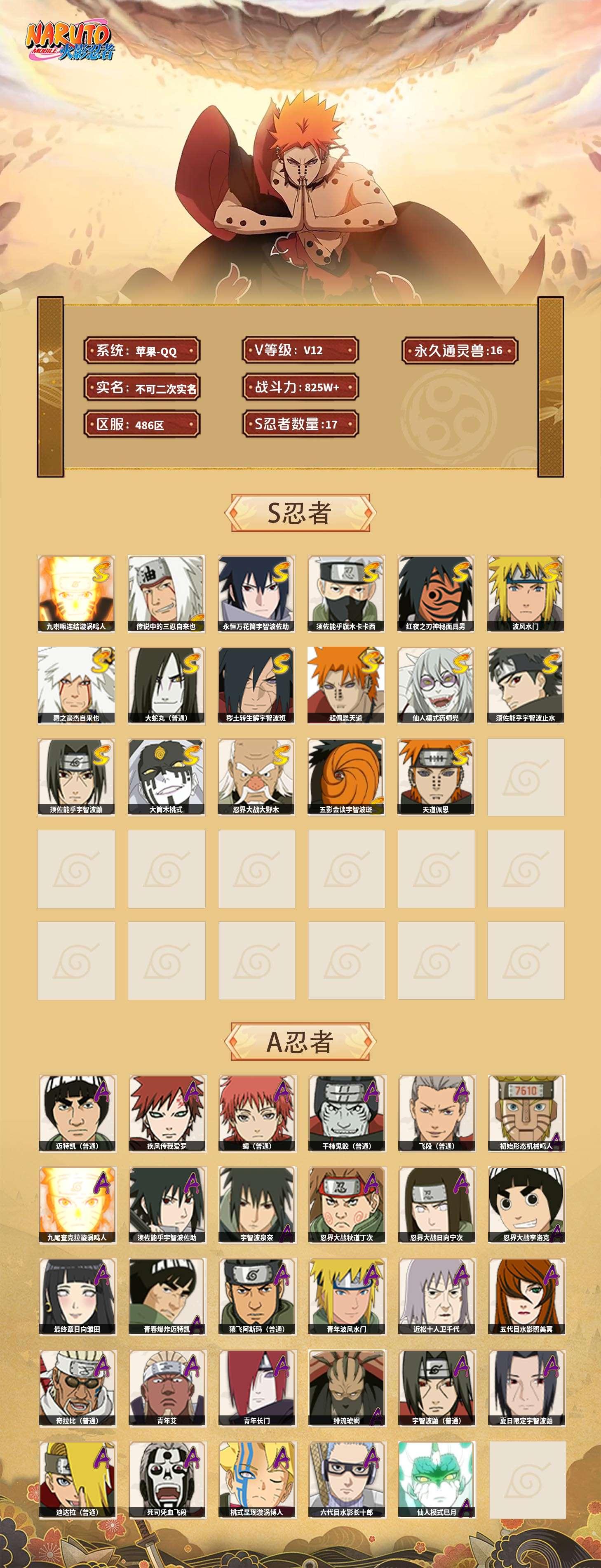 【火影忍者】【lyhy9449】战斗力:825w;段位:上忍2阶;本服排名:524;vip:v12级;s忍:17个;a忍:29个;通灵兽:16个,s忍:九喇嘛连结漩涡鸣人|传说中的三忍自来也|永恒万花筒宇智波佐助|须佐能乎旗木卡卡西|红夜之刃神秘面具男|波风水门|舞之豪杰自来也|大蛇丸(普通)|秽土转生解宇智波斑|超佩恩天道|仙人模式药师兜|须佐能乎宇智波止水|须佐能乎宇智波鼬|大筒木桃式|忍界大战大野木|五影会谈宇智波斑|天道佩恩__a忍:迈特凯(普通)|疾风传我爱罗|蝎(普通)|干柿鬼鲛(普通)|飞段(普通)|初始形态机械鸣人|九尾查克拉漩涡鸣人|须佐能乎宇智波佐助|宇智波泉奈|忍界大战秋道丁次|忍界大战日向宁次|忍界大战李洛克|最终章日向雏田|青春爆炸迈特凯|猿飞阿斯玛(普通)|青年波风水门|近松十人卫千代|五代目水影照美冥|奇拉比(普通)|青年艾|青年长门|绯流琥蝎|宇智波鼬(普通)|夏日限定宇智波鼬|迪达拉(普通)|死司凭血飞段|桃式显现漩涡博人|六代目水影长十郎|仙人模式巳月__通灵兽:忍犬(普通)|蓝蛇|蛤蟆吉|忍龟|镰鼬|猿魔|砂之守鹤|山椒鱼|蜃|蛤蟆仙人|鲛鲨|蛤蟆健|乌鸦(普通)|蛤蟆龙|蛞蝓(普通)|蛤蟆广