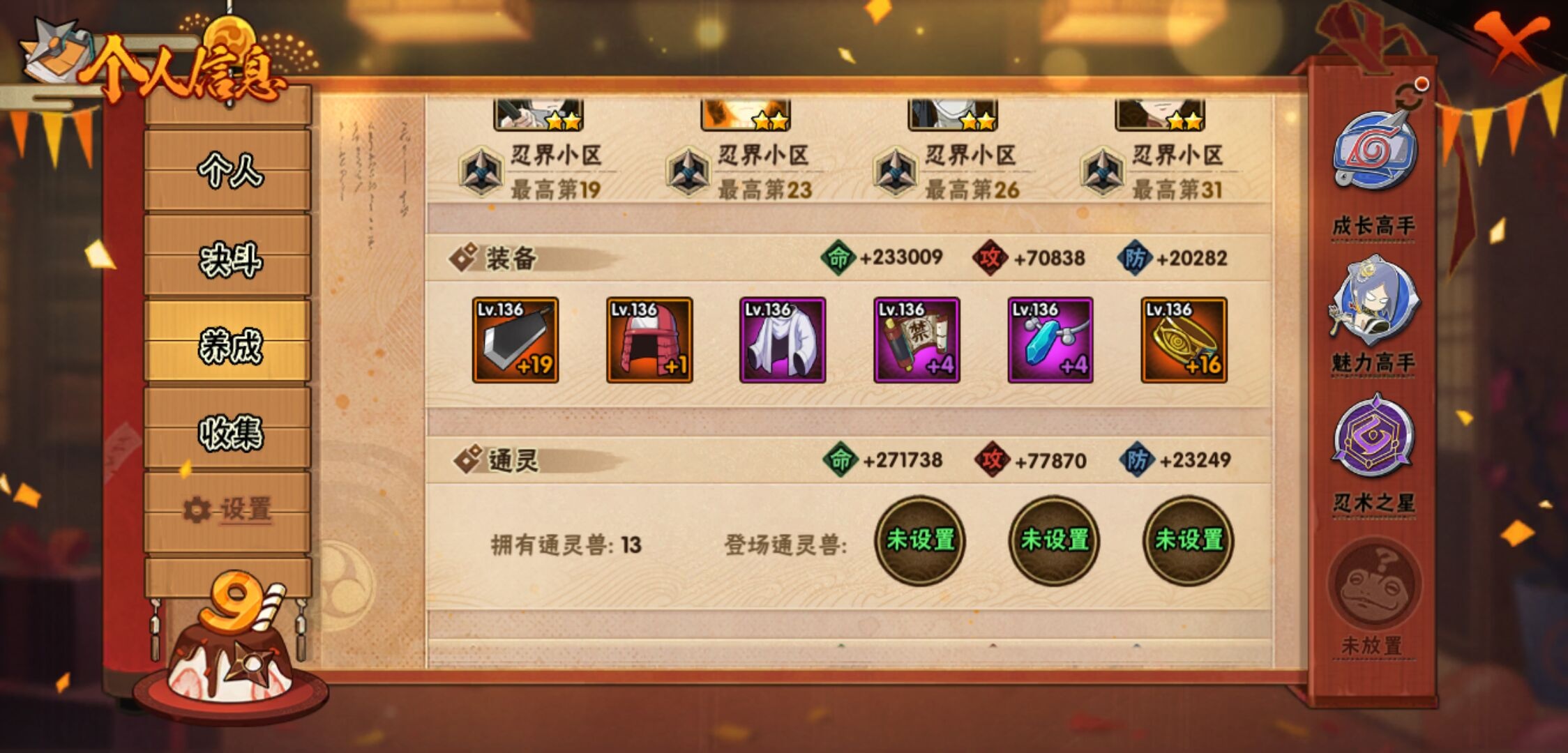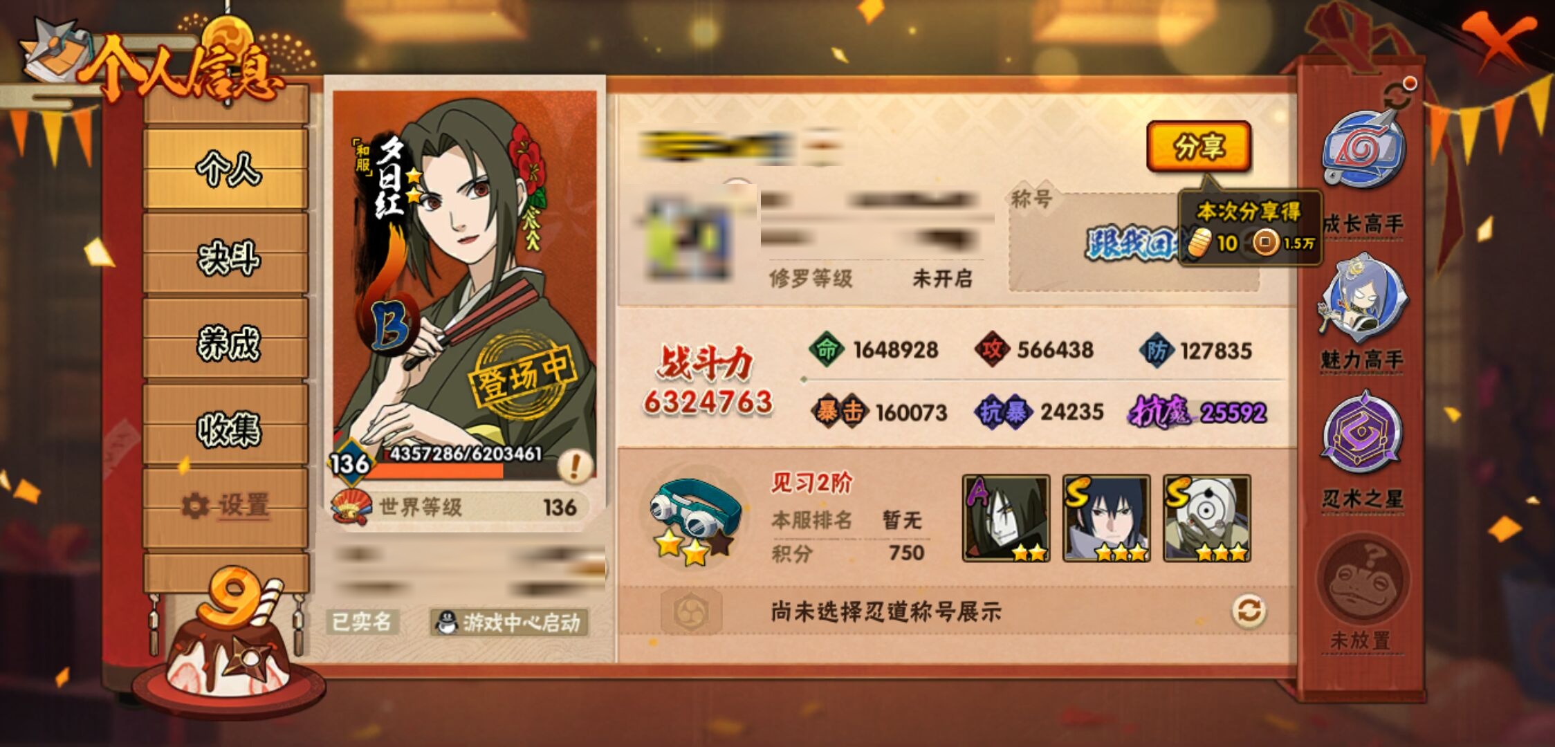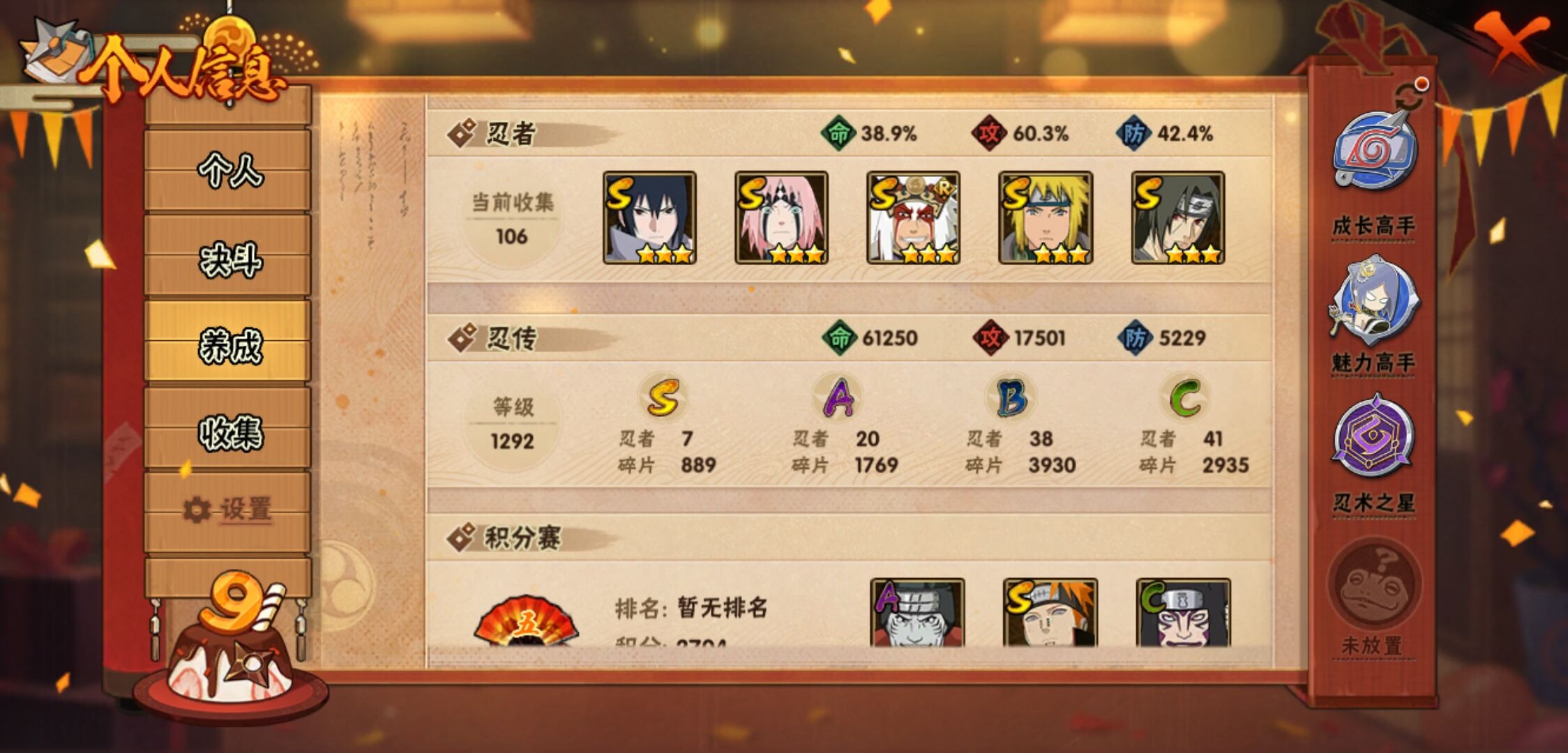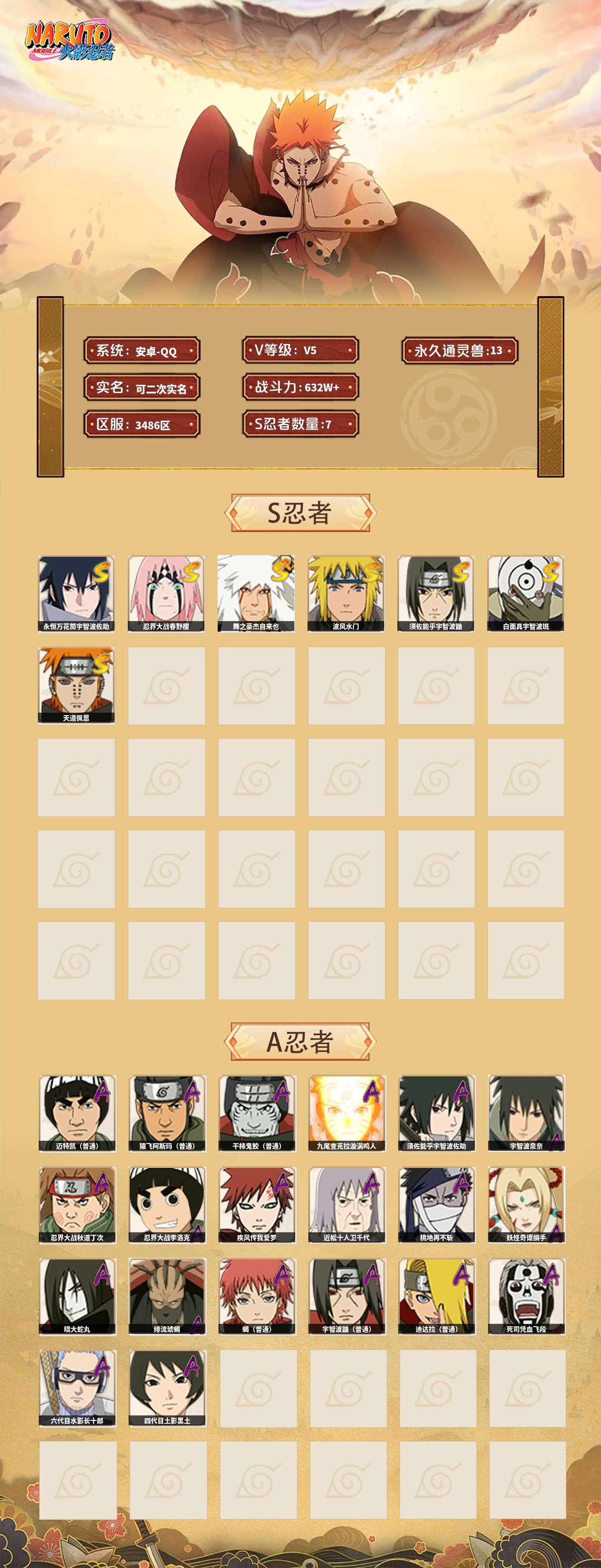 【火影忍者】【lyhy9438】战斗力:632w;段位:见习2阶;本服排名:1210;vip:v5级;s忍:7个;a忍:20个;通灵兽:13个,s忍:永恒万花筒宇智波佐助|忍界大战春野樱|舞之豪杰自来也|波风水门|须佐能乎宇智波鼬|白面具宇智波斑|天道佩恩__a忍:迈特凯(普通) 5星|猿飞阿斯玛(普通) 4星|干柿鬼鲛(普通) 4星|九尾查克拉漩涡鸣人|须佐能乎宇智波佐助|宇智波泉奈|忍界大战秋道丁次|忍界大战李洛克|疾风传我爱罗|近松十人卫千代|桃地再不斩|妖怪奇谭纲手|晓大蛇丸|绯流琥蝎|蝎(普通)|宇智波鼬(普通)|迪达拉(普通)|死司凭血飞段|六代目水影长十郎|四代目土影黑土__通灵兽:忍犬(普通)|蓝蛇|蛤蟆吉|砂之守鹤|忍龟|镰鼬|猿魔|山椒鱼|蜃|蛤蟆仙人|鲛鲨|蛤蟆健|乌鸦(普通)