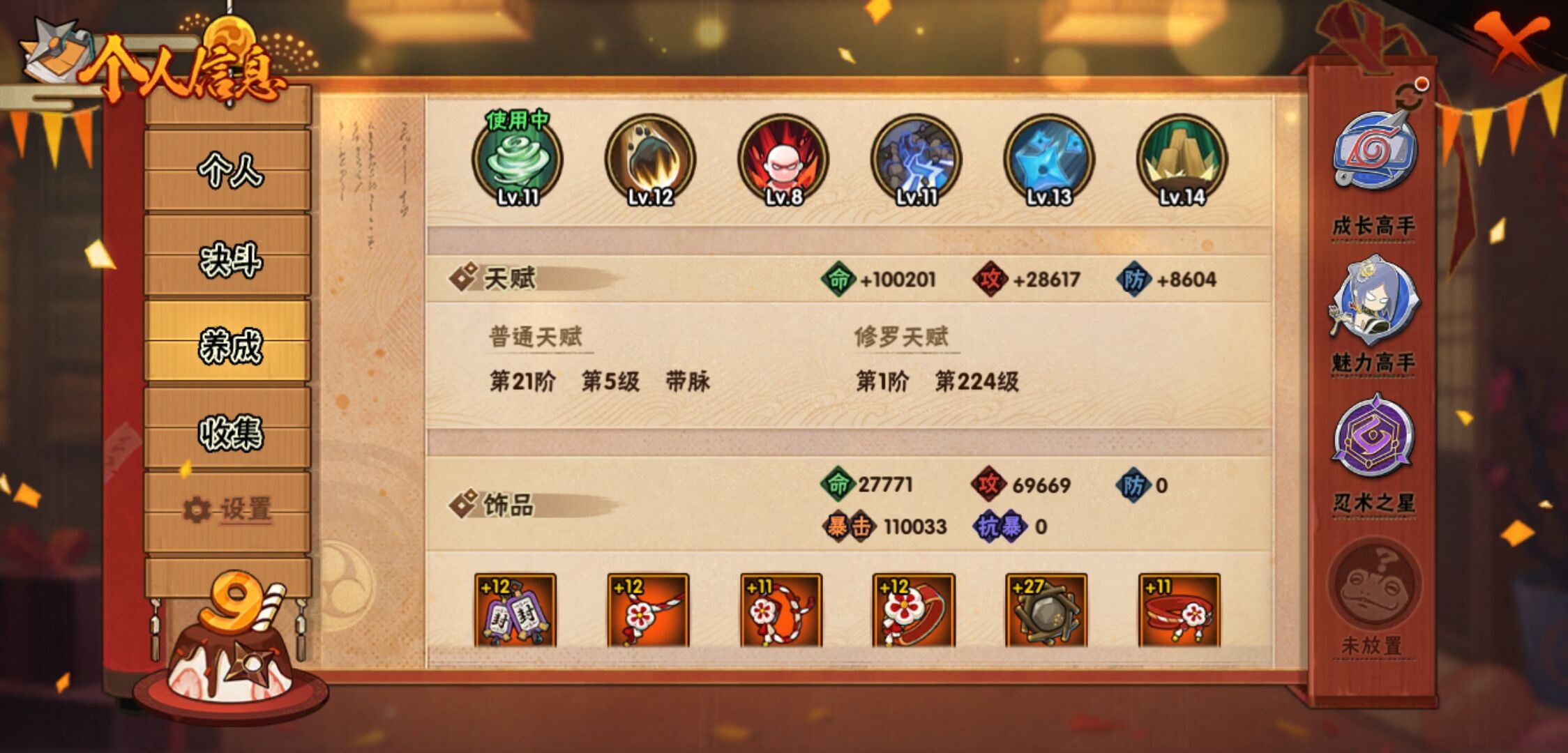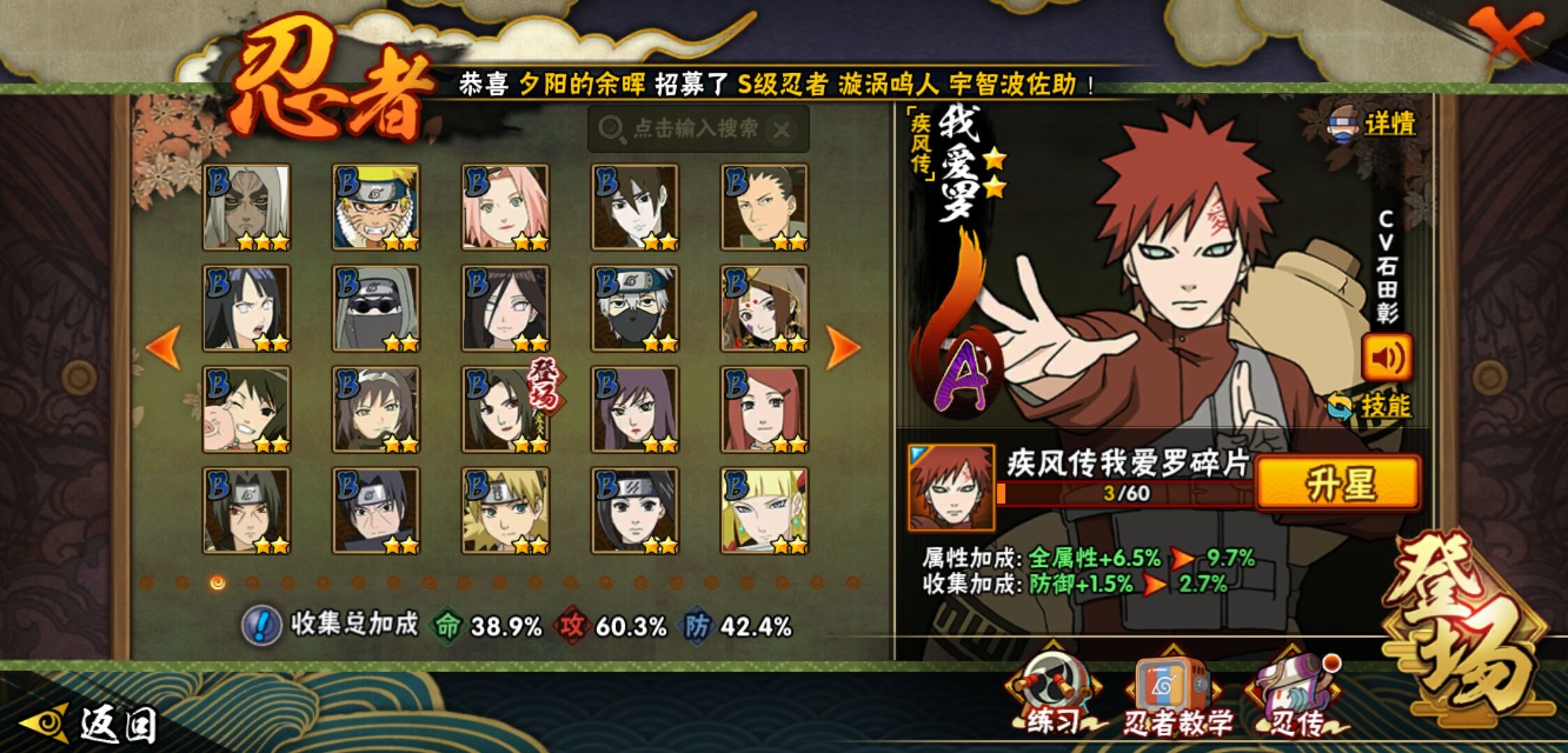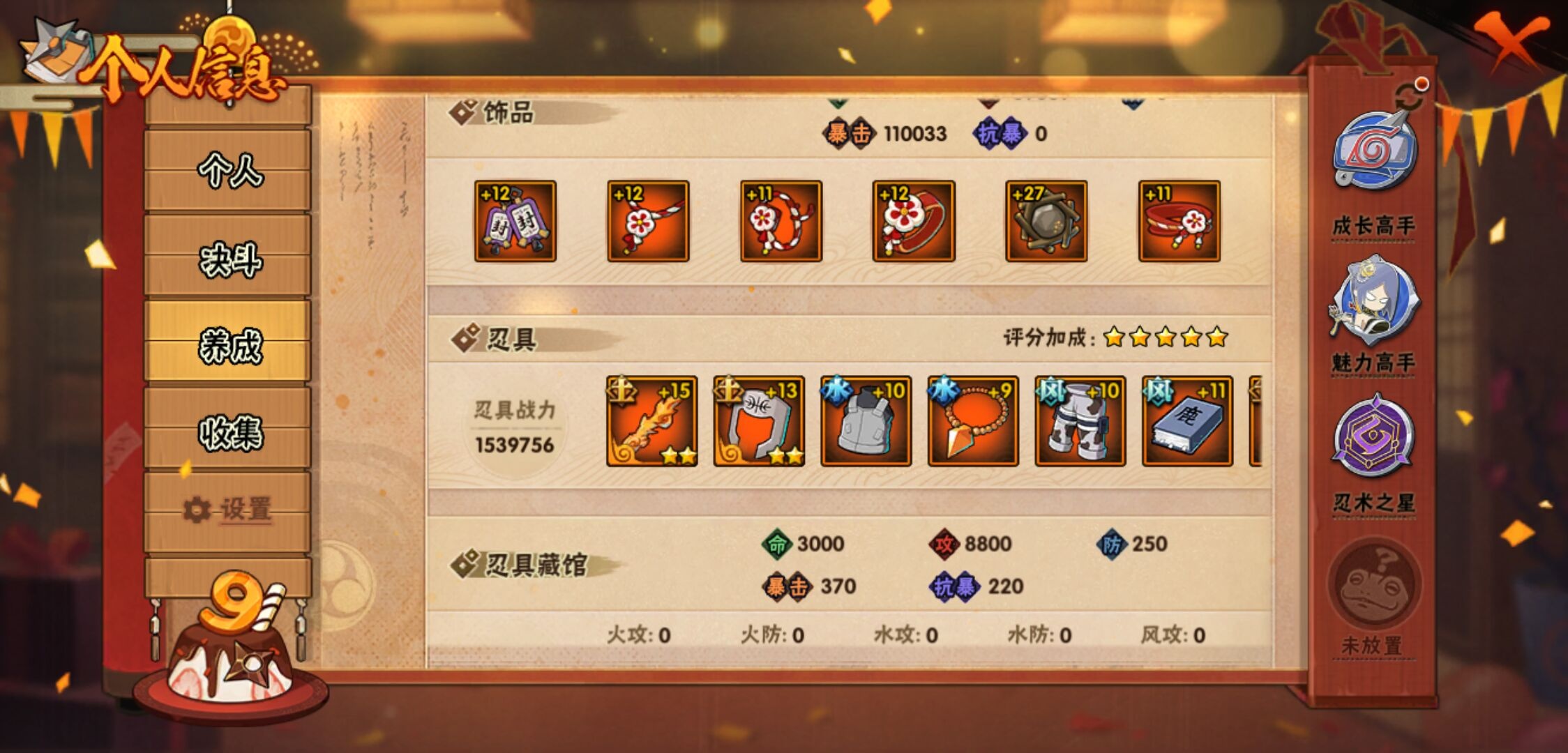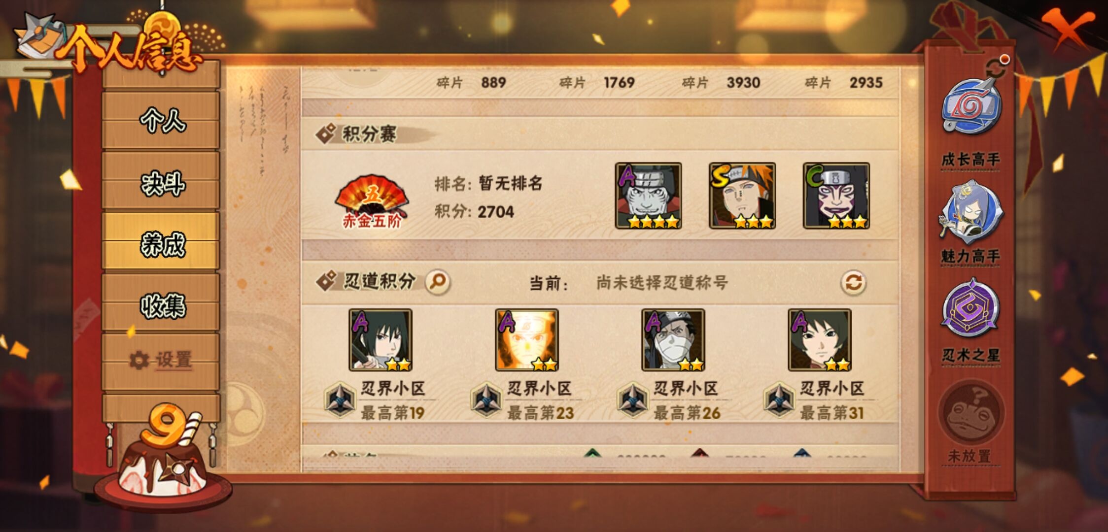 【火影忍者】【lyhy9438】战斗力:632w;段位:见习2阶;本服排名:1210;vip:v5级;s忍:7个;a忍:20个;通灵兽:13个,s忍:永恒万花筒宇智波佐助|忍界大战春野樱|舞之豪杰自来也|波风水门|须佐能乎宇智波鼬|白面具宇智波斑|天道佩恩__a忍:迈特凯(普通) 5星|猿飞阿斯玛(普通) 4星|干柿鬼鲛(普通) 4星|九尾查克拉漩涡鸣人|须佐能乎宇智波佐助|宇智波泉奈|忍界大战秋道丁次|忍界大战李洛克|疾风传我爱罗|近松十人卫千代|桃地再不斩|妖怪奇谭纲手|晓大蛇丸|绯流琥蝎|蝎(普通)|宇智波鼬(普通)|迪达拉(普通)|死司凭血飞段|六代目水影长十郎|四代目土影黑土__通灵兽:忍犬(普通)|蓝蛇|蛤蟆吉|砂之守鹤|忍龟|镰鼬|猿魔|山椒鱼|蜃|蛤蟆仙人|鲛鲨|蛤蟆健|乌鸦(普通)