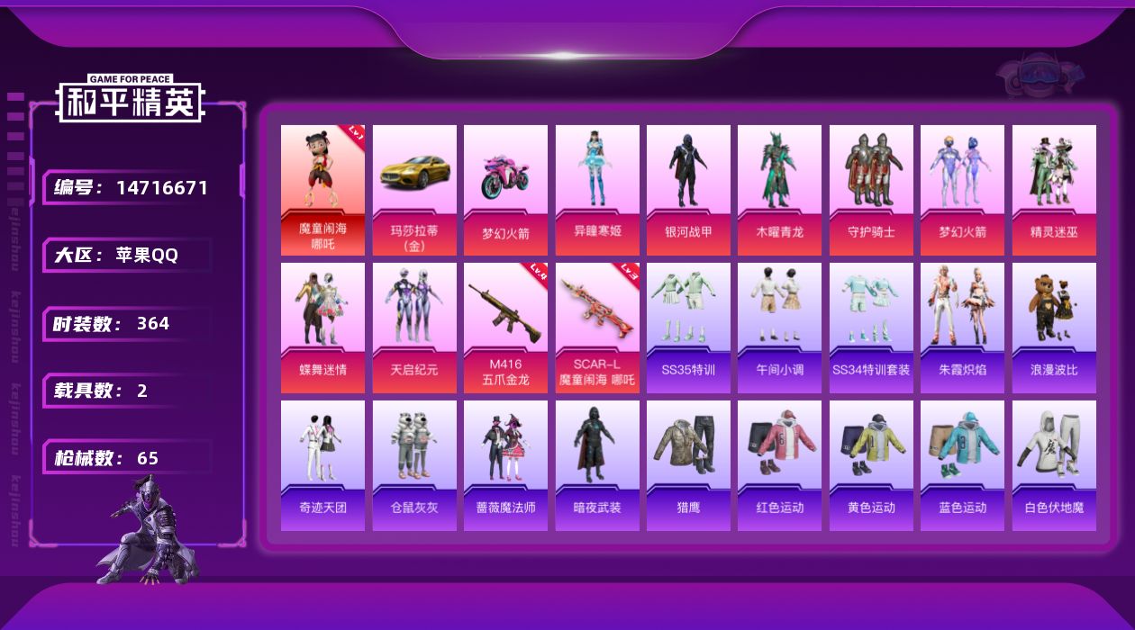 [14716671]1红装 8粉装 2特效呛 2载具 可二次 可修改实名 【一级神装】:一级魔童闹海-哪吒1级哪吒 【热门装扮】:异瞳寒姬梦幻火箭新101 银河战甲守护骑士木曜青龙蝶舞迷情天启纪元精灵迷巫蔷薇魔法师奇迹天团仓鼠灰灰浪漫波比暗夜武装 【载具】:玛莎拉蒂
