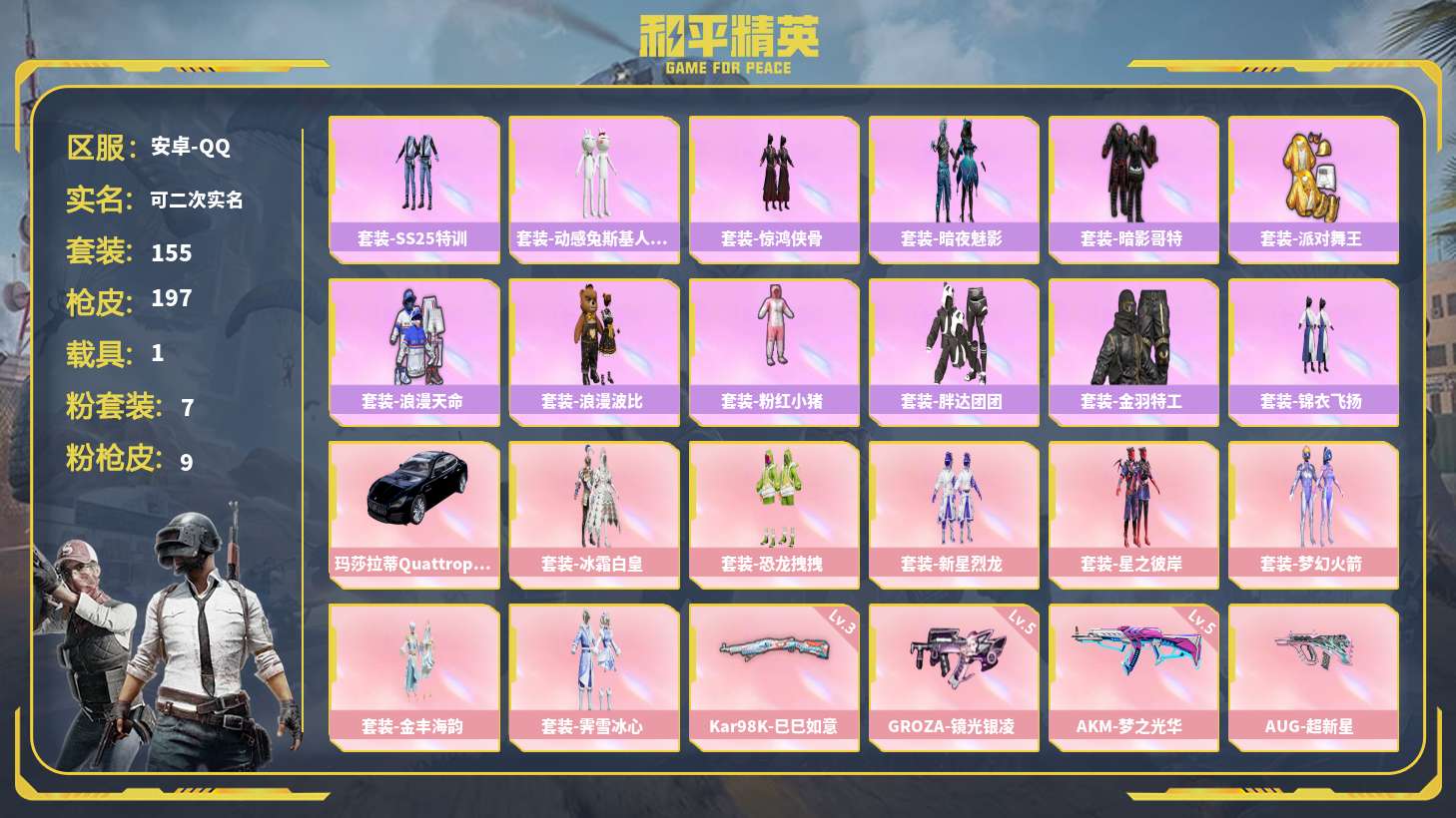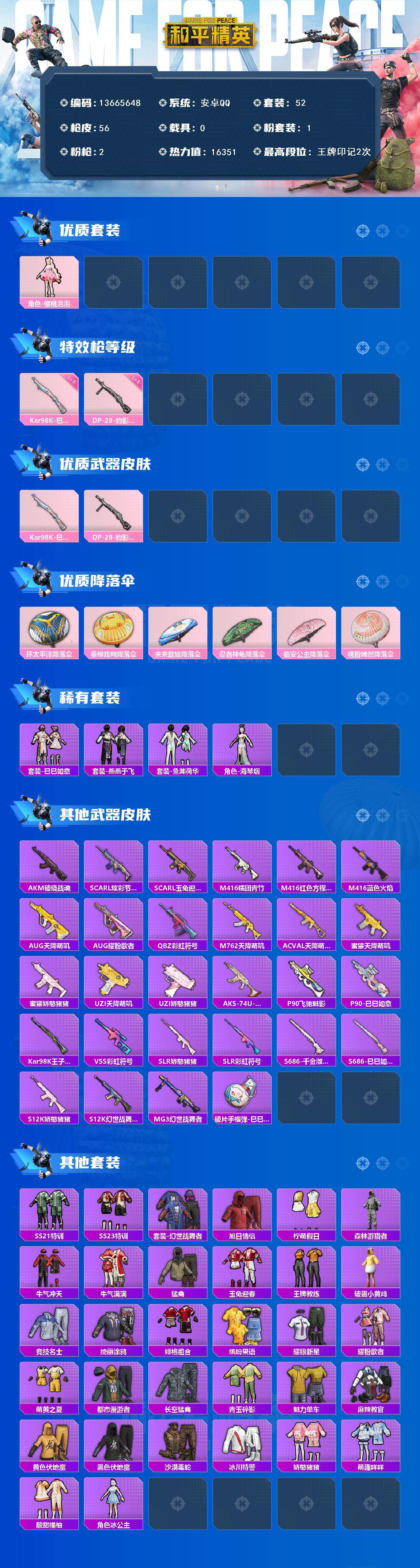 可二次实名 安卓q-1载具2粉装3特效呛3热门87套装127呛皮 36254热力值 11印记 历史卓越王牌15星 【1载具】 玛莎拉蒂q蓝色 【2粉装】 女娲灵识 飒粉甜心 【3特效呛】 kar98k-巳巳如意 5级 dp-28-豹影疾电 5级 dp-28-暗夜鎏金 7级 【3热门】 龟仙人 迅捷狂鲨 破蛋小黄鸡 营地id:945839423