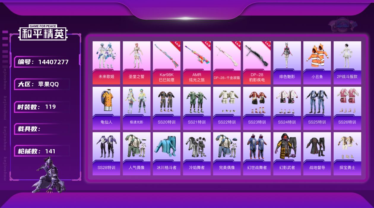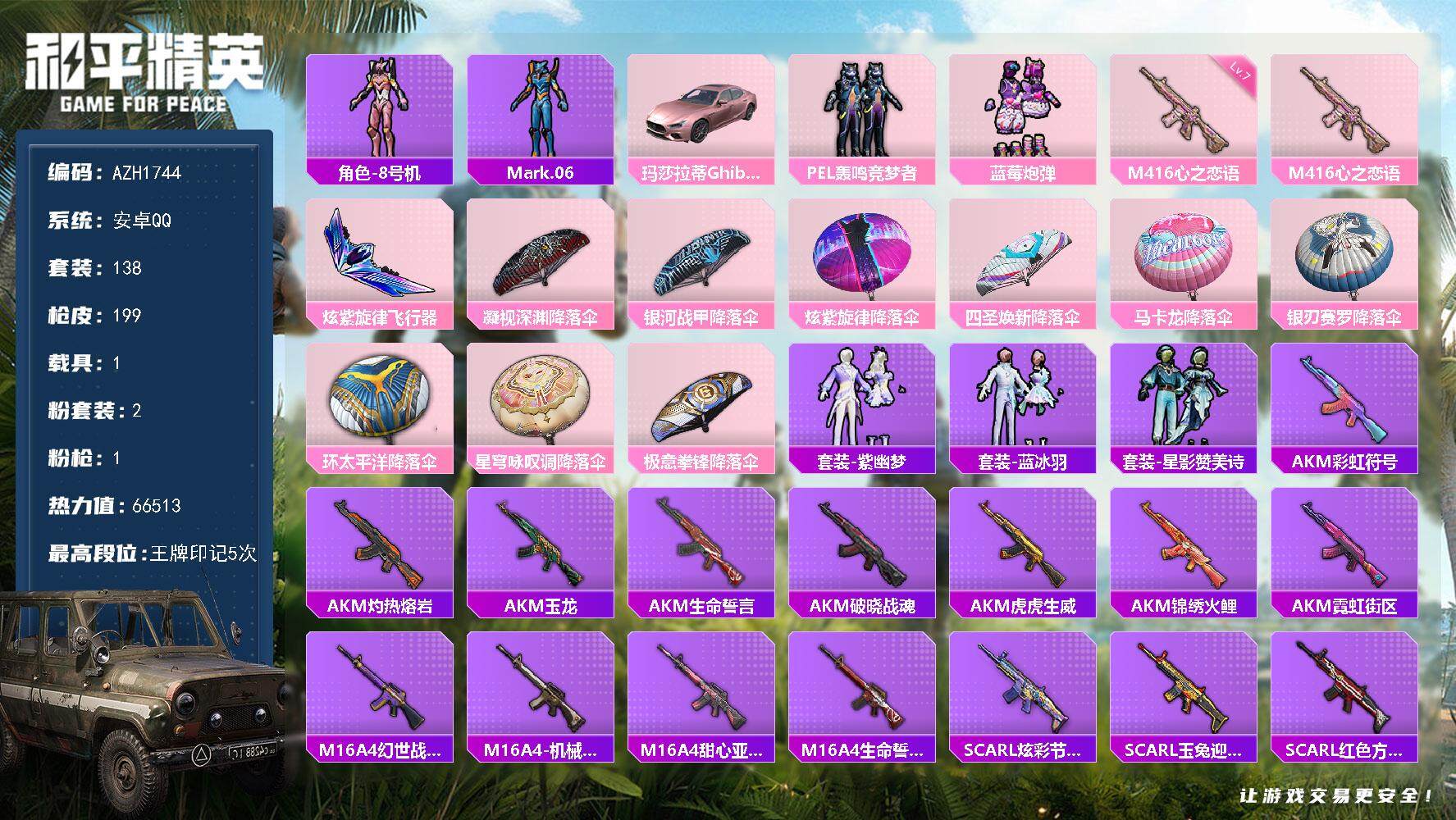 [14407277]苹果 手q-3粉装-4特效呛-0载具-2粉色飞行器-43968热力值-14王牌印记-119套装-141呛皮 【热门品类】:粉装-梦幻火箭,套装-小丑鱼,角色-2p战斗服款,套装-龟仙人 【粉色套装】:粉装-梦幻火箭,粉装-未来歌姬,角色-圣堂之誓 【粉色呛皮等级】:kar98k-巳巳如意五级,amr-炫光之旅五级,dp-28-千金淑猫四级,dp-28-豹影疾电二级 【粉色呛皮】:kar98k-巳巳如意,amr-炫光之旅,dp-28-千金淑猫,dp-28-豹影疾电 【粉色飞行器】:梦幻火箭飞行器,拂晓神骑飞行器 【粉色降落伞】:梦幻火箭降落伞,橘柚倾心降落伞,炙焰牛王降落伞,暗夜鎏金降落伞,飒粉甜心降落伞,拂晓神骑降落伞,闲梦青缨降落伞,炫光之旅降落伞,圣堂之誓降落伞,江南烟雨降落伞,荧海星豚降落伞 【稀有套装】:套装-龟仙人,套装-极速光影,角色-绯色魅影 【稀有呛皮】:akm-彩虹符号,akm-环太平洋,akm-破晓战魂,akm-龙的传人,m16a4-幻世战舞者,m16a4-甜心亚梦,m16a4-红色方程式,m16a4-蓝色火焰,scar-l-炫彩节奏,scar-l-玉兔迎春,scar-l-甜蜜旋律,scar-l-粉锦千层,scar-l-红色方程式,m416-摩登王国,m416-糯团青竹,m416-红色方程式,m416-蓝色火焰,groza-影袭,groza-恐龙拽拽,groza-懵萌河马,groza-田园牧歌,aug-耀粉歌者,q-彩虹符号,q-飞驰魅影,m762-天降萌叽,m762-彩虹符号,m762-瑞龙福将,m762-萌物绒绒,mk47-炫光之旅,g36c-懵萌河马,g36c-青丘仙客,ac-val-天降萌叽,ac-val-快闪甜心,ac-val-甜心亚梦,ac-val-闲梦青缨,蜜獾-娇憨猪猪,uzi-啾咪啾咪,uzi-天降萌叽,uzi-娇憨猪猪,uzi-影袭,uzi-红色方程式,ump45-快乐主宰,ump45-涂山之恋,ump45-炫光之旅,ump45-蓝色火焰,vect-田园牧歌,汤姆逊-天降萌叽,汤姆逊-炫彩节奏,汤姆逊-耀粉歌者,mp5k-甜蜜誓约,mp5k-飒粉甜心,p90-快闪甜心,p90-筑梦精灵,p90-闪光银龙,kar98k-影袭,kar98k-梦幻火箭,kar98k-王子的夏天,kar98k-红色方程式
