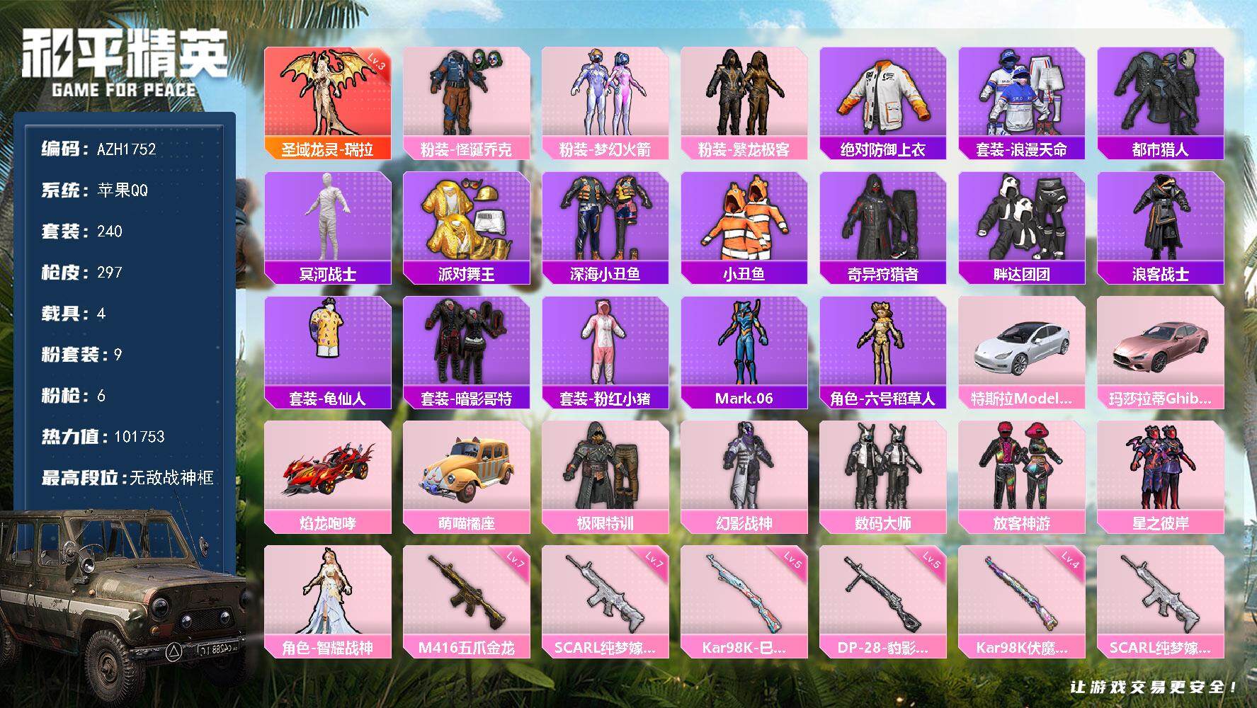 【无敌战神(7天小黑屋15号解除) 2粉装2特效 深海小丑鱼 哥特】安卓q-2稀有2粉装2特效呛18热门175套装201呛皮 60945热力值 16印记 历史无敌战神 【2稀有】 akm-缤纷海域 浪漫天命 【2粉装】 创世救赎 绚金战神 【2特效呛】 kar98k-巳巳如意 5级 dp-28-豹影疾电 1级 【18热门】 小丑鱼 龟仙人 雪山精英 呆萌铁蟹 深海小丑鱼