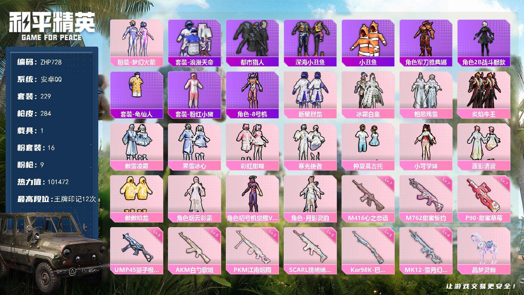 【身法号1载具5粉装2特效呛 梦幻火箭 奇迹舞步美雪 天使彩虹糖 烟云彩露】苹果q-1载具5粉装2特效呛8热门117套装188呛皮 56370热力值 11印记 历史超级王牌13星 【1载具】 鬼马风驰 【5粉装】 梦幻火箭 奇迹舞步美雪 天使彩虹糖 烟云彩露 紫钛骑兵 【2特效呛】 m416-电玩时刻 5级 dp-28-豹影疾电 5级 【8热门】 龟仙人 团圆交子 瑞龙福将 粉红小猪 狂沙