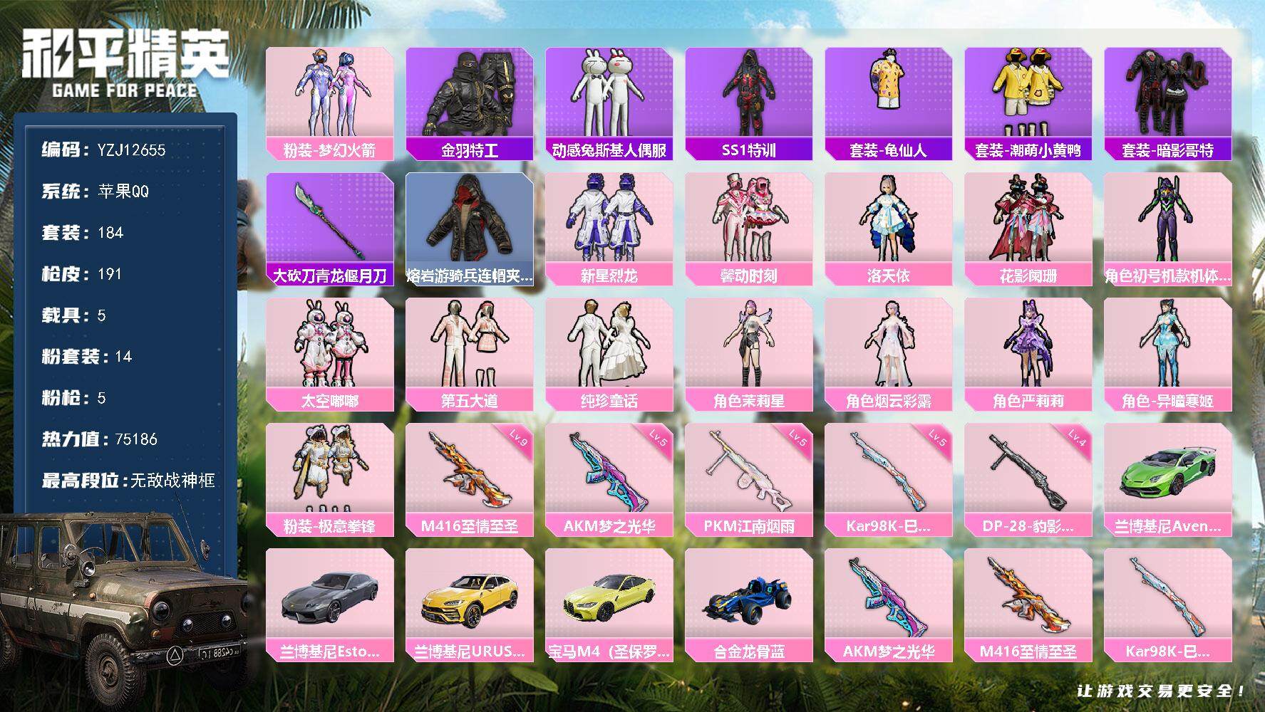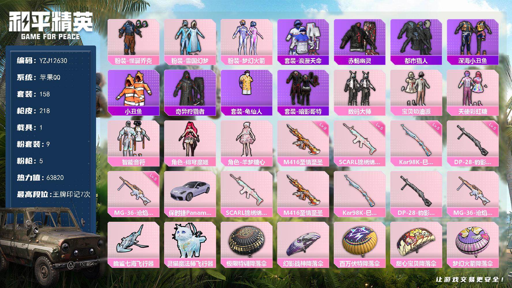 yzj12630-可二次-苹果q-7稀有1载具9粉装5特效呛18热门【极品男神素材号 tt粉丝logo 小丑[怪诞] 雪国 火箭少女 满级至情至圣 赤蝎 都市 保时捷911 智能音符 申公豹 tt战队服 小丑鱼 蜘蛛侠 粉熊背包】158套装218呛皮 63820热力值 7印记 历史超级王牌8星 【7稀有】 奇异狩猎者 赤蝎幽灵 m416-黄金龙骨 awm-黄金龙骨 akm-缤纷海域 都市猎人