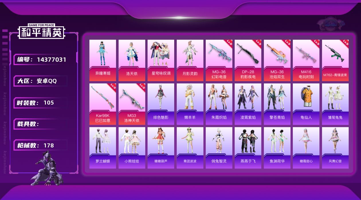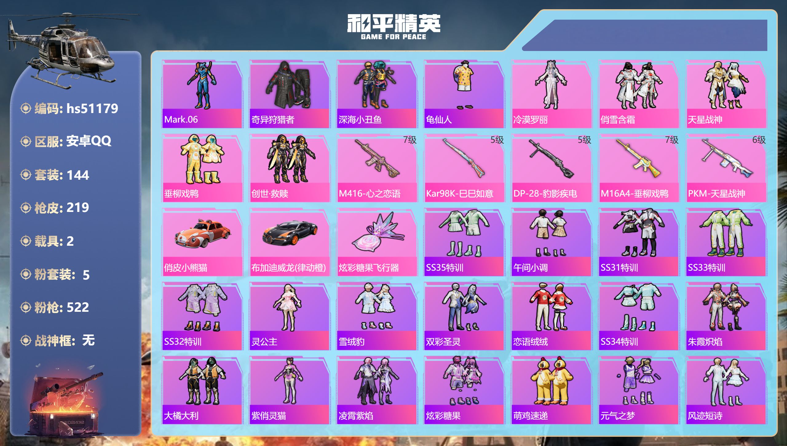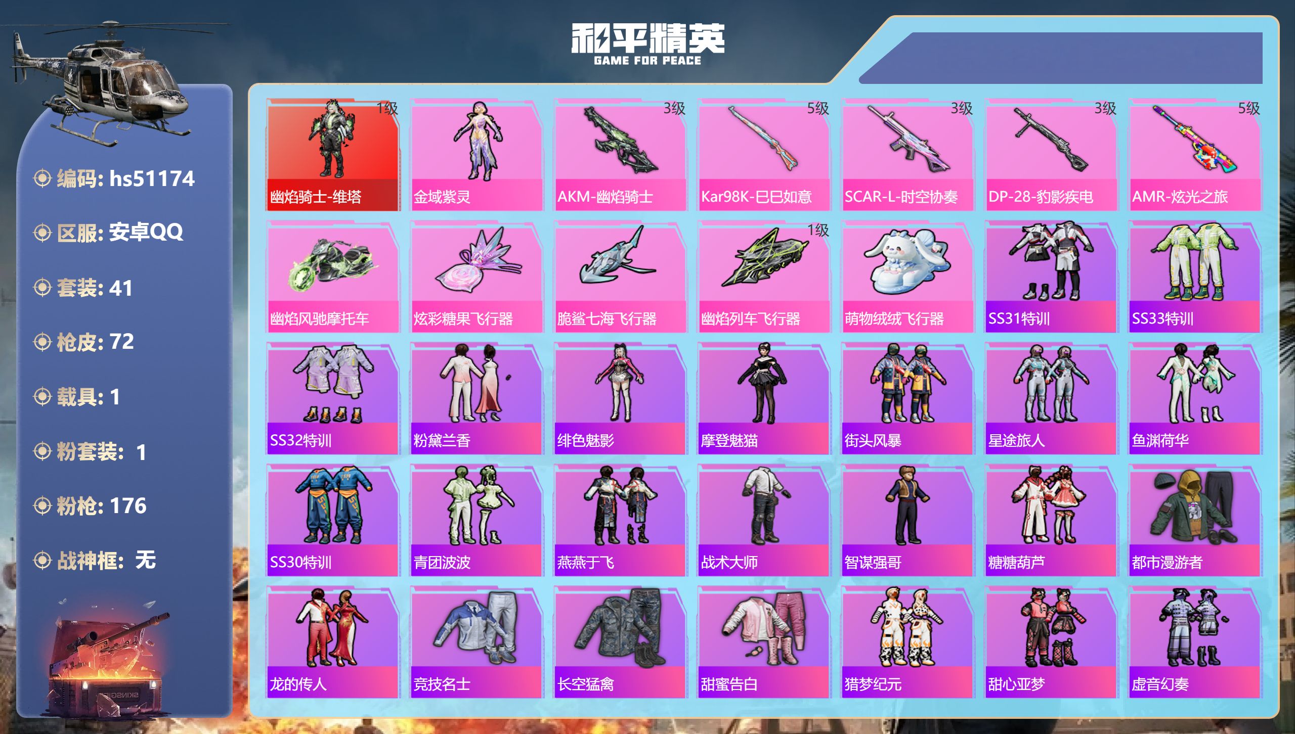 【男神素材号! 赤蝎幽灵 都市 梦幻火箭 猪脸 小白龙 胖螳螂 金羽 1载具9粉装2特效呛】 苹果q-52550热力值 10王牌印记 历史超级王牌18星 148套装 149呛皮 【1载具】 合金龙骨蓝色 【5稀有】 奇异狩猎者 赤蝎幽灵 akm-缤纷海域 都市猎人 浪漫天命 【9粉装】 圣堂之誓 梦幻火箭 缤纷油彩 数码大师 天禅智恒 新星烈龙 霁雪冰心 傲雪凌霜 复仇流浪者