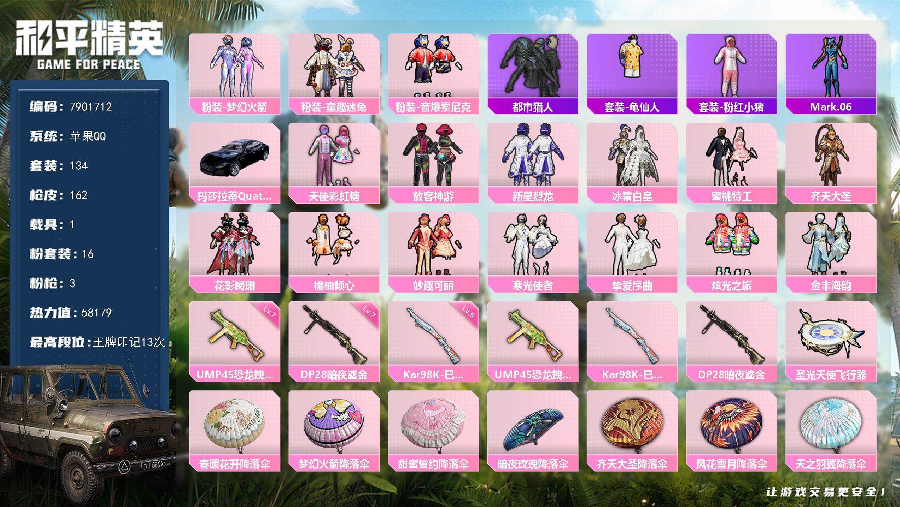 2287870-二次-苹果q-58179热力值 13王牌印记1卓越 历史超级王牌19星 身法女号 梦幻火箭 都市 发光眼罩 蓝螳螂 小白龙 童趣迷兔 天使彩虹糖 兔兔白日梦 132套装 162呛皮 【1载具】 玛莎拉蒂q蓝色 【2稀有】 akm-缤纷海域 都市猎人 【16粉装】 梦幻火箭 天使彩虹糖 金丰海韵 炫光之旅 妙趣可丽 放客神游 橘柚倾心 挚爱序曲 新星烈龙 童趣迷兔 冰霜白皇