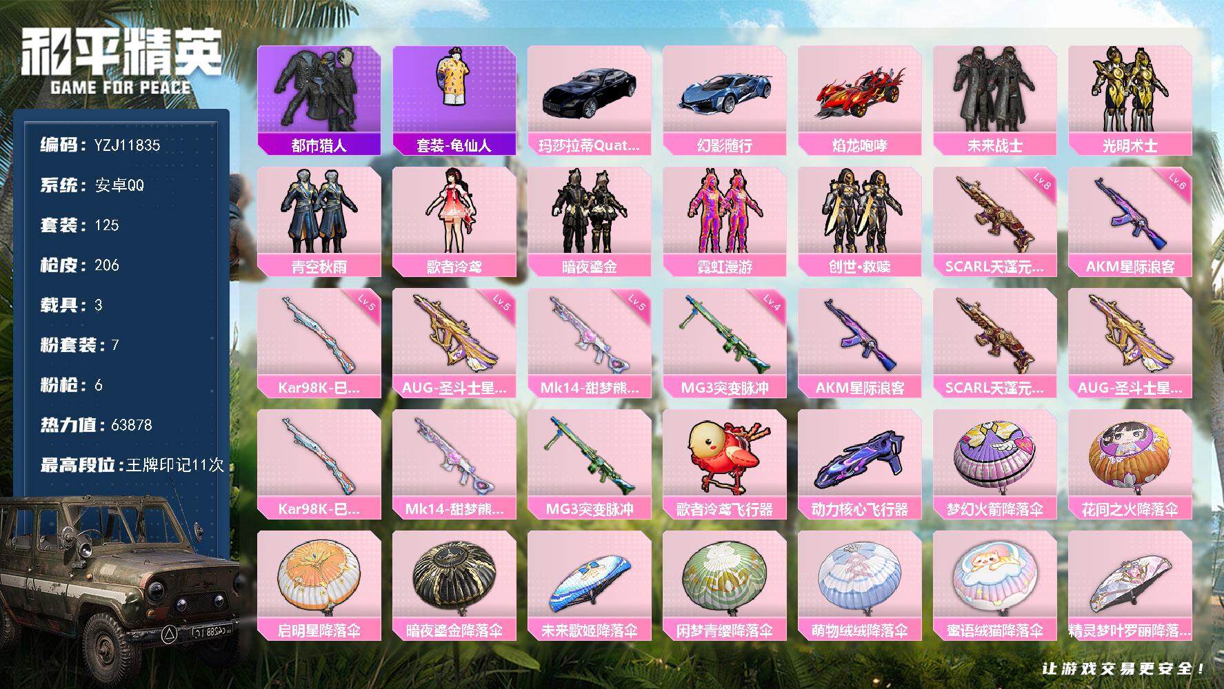 2287901-可二次安卓q-1稀有3载具7粉装6特效呛6热门125套装206呛皮 歌者泠鸢 都市 冰冻风暴 红蹦蹦 夜幕蓝玛莎 8级斯嘎天蓬元帅 6级ak星际浪客 6改名卡63878热力值 11印记 历史超级王牌11星 【1稀有】 都市猎人 【3载具】 玛莎拉蒂q蓝色 幻影随行 焰龙咆哮 【7粉装】 创世救赎 霓虹漫游 青空秋雨 未来战士 歌者泠鸢 光明术士 暗夜鎏金 【6特效呛】 k