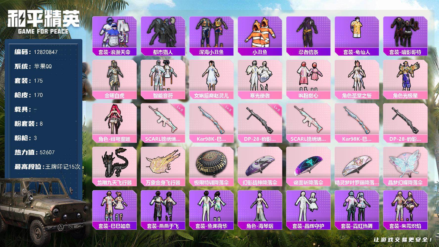 _2287857-可二次-苹果q-2稀有8粉装3特效呛15热门175套装170呛皮52607热力值15印记4卓越历史超级王牌14星小雾神同款身法素材号赵灵儿都市天命红眼罩深海小丑鱼满级斯嘎小丑鱼身法鲨鱼裤tt战斗服水银刺客破蛋小黄鸡粉熊包【2稀有】都市猎人浪漫天命【8粉装】圣堂之誓赵灵儿绯穹魔姬光极星金曜白虎飒粉甜心智能音符寒光使者【3特效呛】scar-l-锦绣绵绵5级kar98k-巳巳如意5级dp-28-豹影疾电5级【15热门】小丑鱼龟仙人梦魇先生呆萌铁蟹迅捷狂鲨深海小丑鱼tt战队服暗影哥特忍者信条水银刺客漫步者破蛋小黄鸡极速红龙弄潮海豚m762-奇异狩猎者【1飞行器】龙翔九天飞行器【2头盔】幻影战神头盔深海小丑鱼头盔【3背包】幻影战神背包萌熊伴侣背包深海小丑鱼背包营地id:910580612
