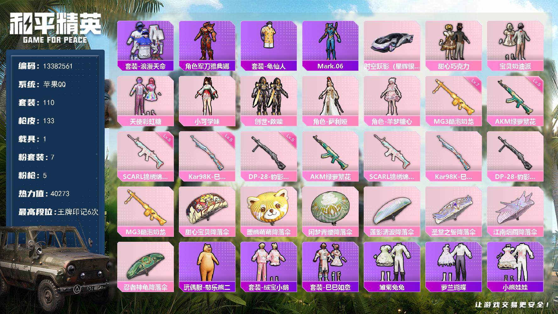 2287848-可二次-苹果q-1稀有6粉装5特效呛17热门153套装209呛皮 66160热力值 战神精氪小号 战神框(ss21)小白龙 红眼罩 圣堂之誓 小黄鸭 深海小丑鱼 激萌罗小黑 ak影袭 满级m416五爪金龙 满级p90金丰海韵 满级mg3炙焰牛王 12印记 历史无敌战神 【1稀有】 浪漫天命 【6粉装】 圣堂之誓 仙女座瞬 雪月幻音 霓裳武神 新星烈龙 炙焰牛王 【5特效呛】