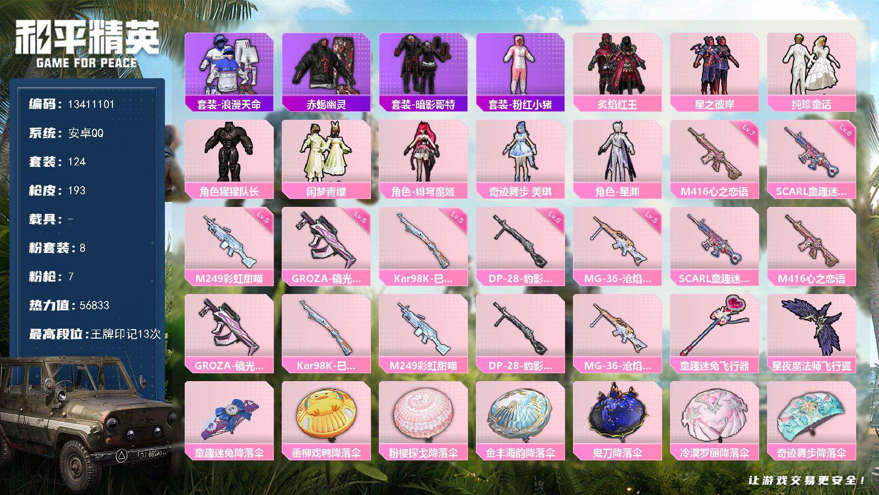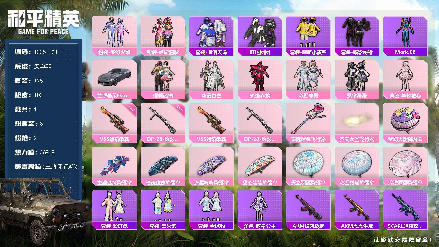 _2287818-可二次可转区安卓q-40469热力值7王牌印记历史超级王牌19星小女号严莉莉美雪烟云彩露星穹咏叹调幻彩电音74套装141呛皮【1载具】宝马m4圣保罗黄【5粉装】严莉莉美雪烟云彩露星穹咏叹调幻彩电音【11特效呛】scar-l-锦绣绵绵5级m416-电玩时刻5级aks-74u-星穹咏叹调4级akm-绿萝繁花5级kar98k-巳巳如意5级mg-36-幻彩电音4级aug-暖羊咩咩5级蜜獾-荧海星豚4级mk14-甜梦熊击5级amr-智耀战神5级groza-镜光银凌5级【6热门】龟仙人团圆交子瑞龙福将极速红龙m762-瑞龙福将m762-风花雪月营地id:919425725