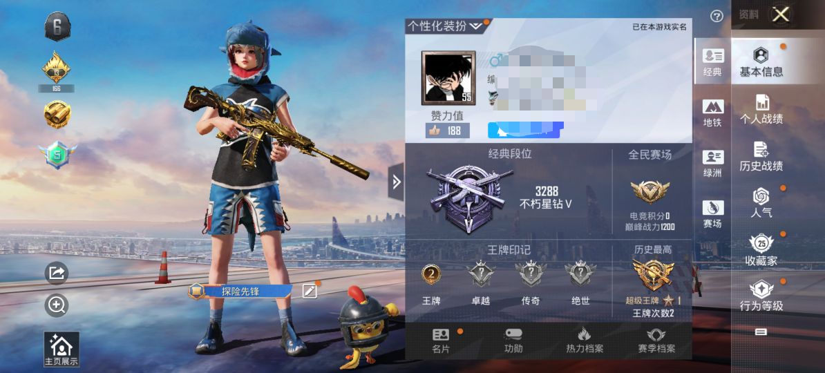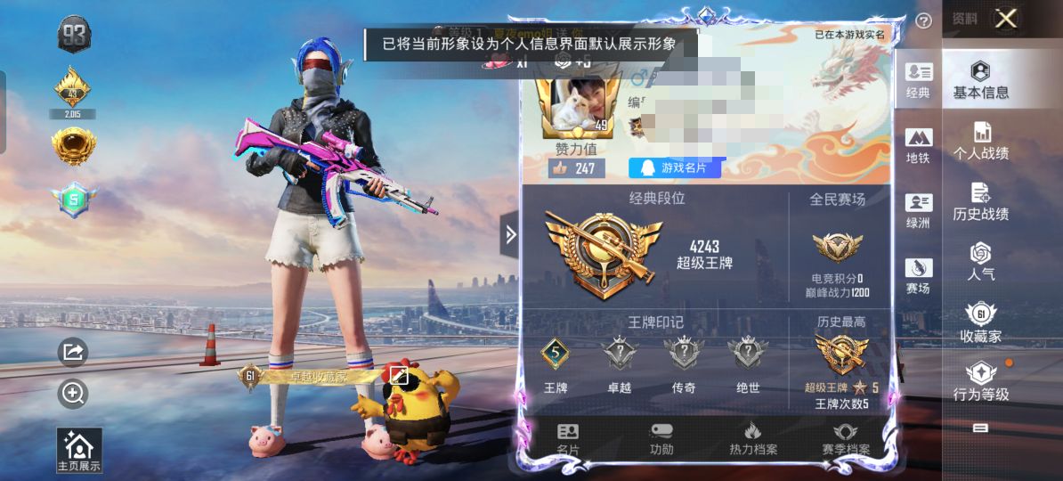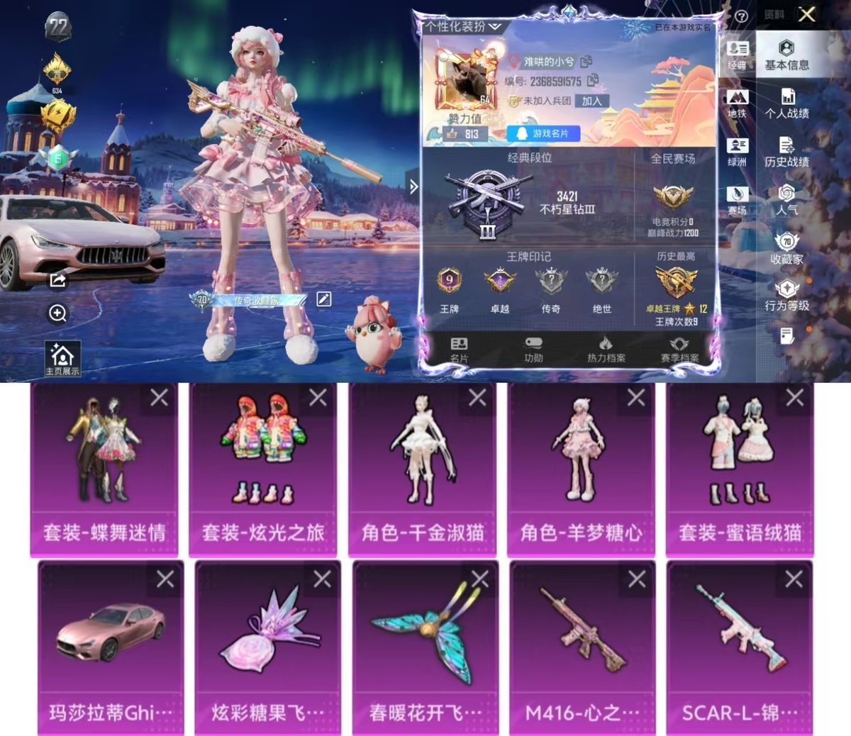 2285113-实名: 可修改 时装数: 830 载具数: 1 呛械数: 227 战备数: 163 热门装扮: 奇异狩猎者蝶舞迷情浪漫波比木曜青龙华贵君王潮萌小黄鸭萌神柯基蔷薇魔法师炫光之旅蜜语绒猫未来领航者千金淑猫羊梦糖心 载具: 玛莎拉蒂ghibli粉 稀有呛皮: m416心之恋语scar-l-锦绣绵绵kar98k-巳巳如意dp-28-豹影疾电