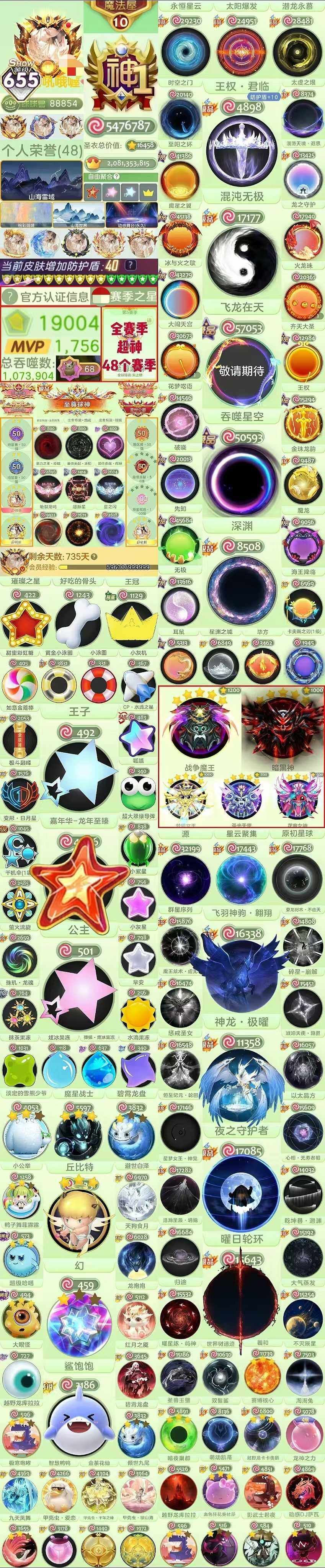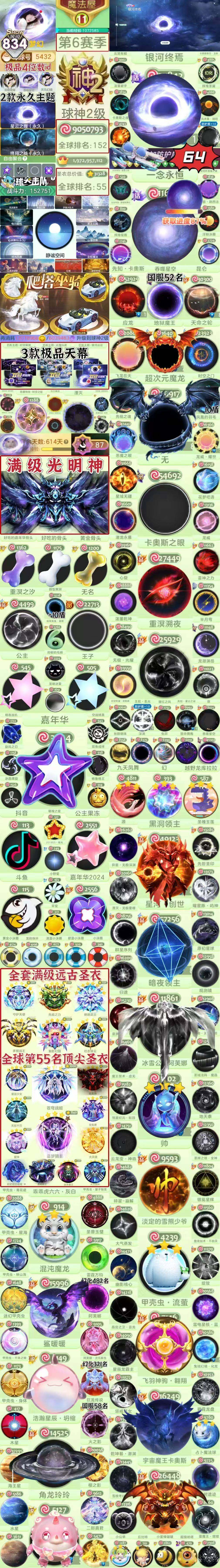 神1 834秀 银河终焉 无 带词组id梦幻 满级光明神 嘉年华 满级阿芙娜 苍穹战姬 全满远古圣衣 顺子🆔5432从第6赛季就开始积累的老号底蕴直接拉满,球神2级的段位搭配全球排名152、国服55名的顶尖战力,还有国服52名的细分榜单成绩,实力与排名双在线。账号手握2款永久主题和3款极品天幕,绝版典藏装饰一应俱全,满级光明神解锁满配特效,全套满级远古圣衣更是打造出视觉与属性的双重巅峰;银河终焉、等顶奢光环孢子,地狱魔王、超次元魔龙等稀有魔灵也尽数收入囊中,再加上战力破万、全衣总价值拉满的数值,以及各类绝版头像框、关键词、残影特效堆满仓库的细节,不管是情怀收藏还是实战冲榜,这个账号都是球球大作战里的究极体存在,堪称错过再无的顶配神号。