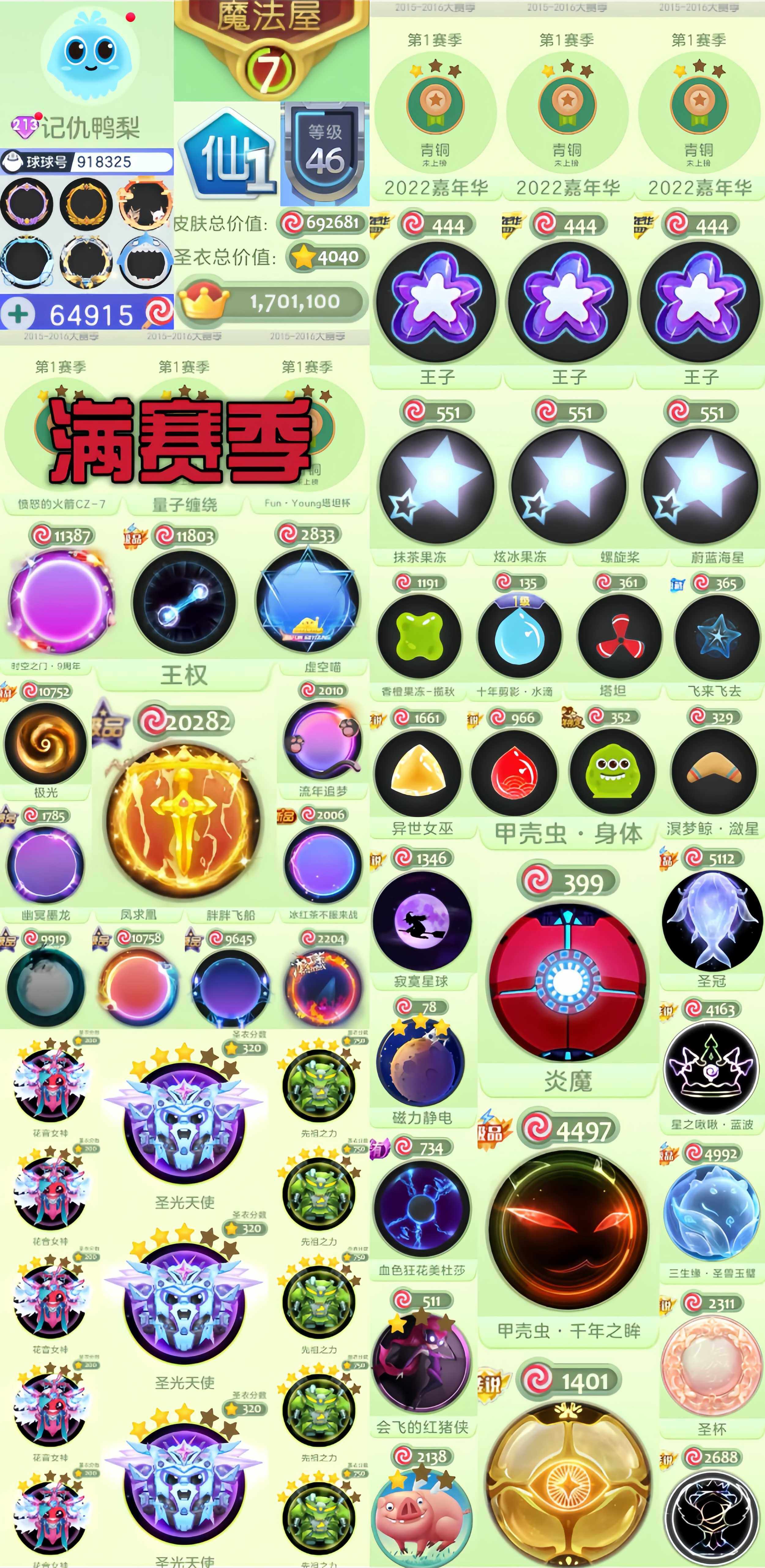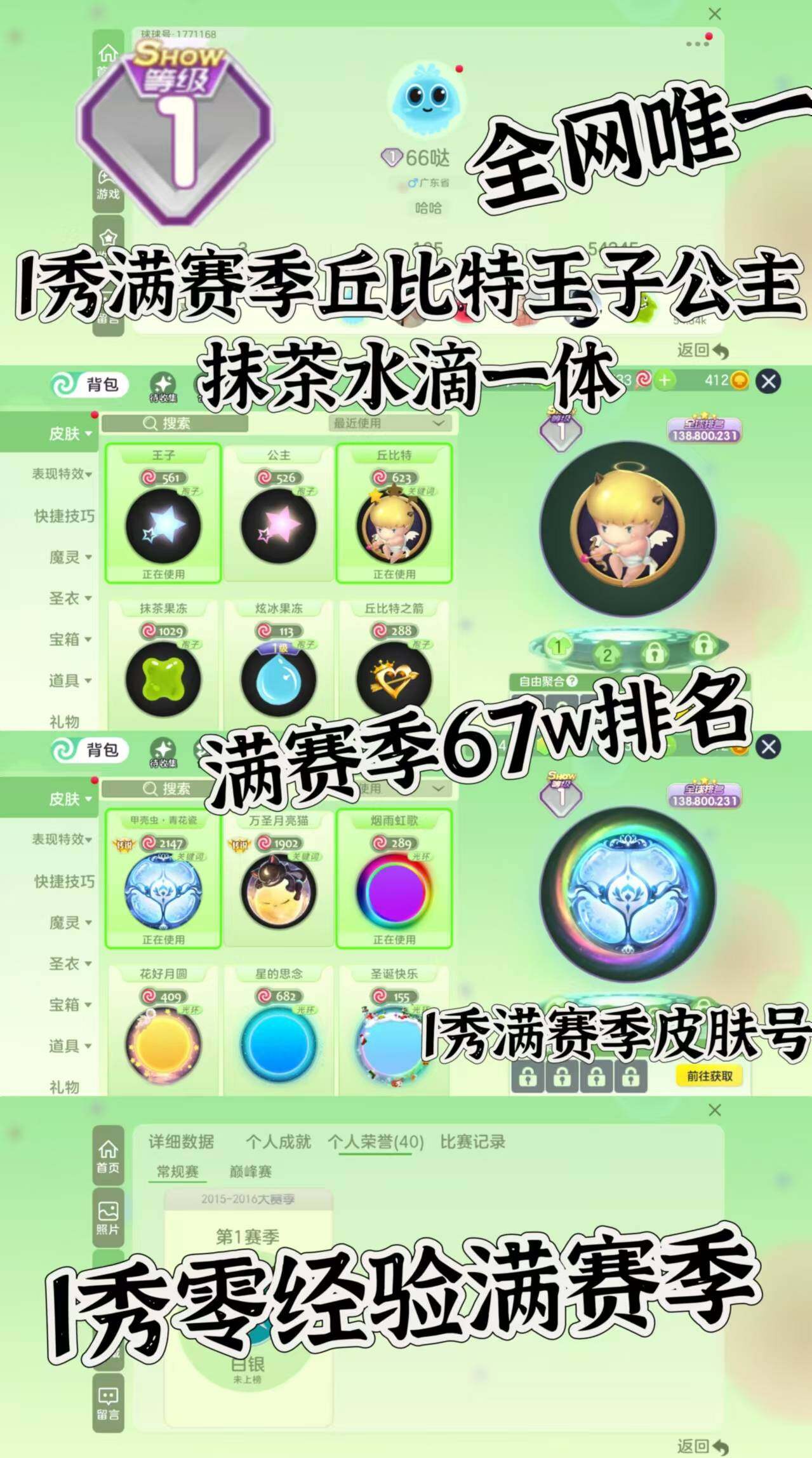 s全网唯一!1秀满赛季丘比特 王子 公主 抹茶 水滴 丘比特之箭一体!青花瓷甲壳虫 满赛季排名67w!编码1771168