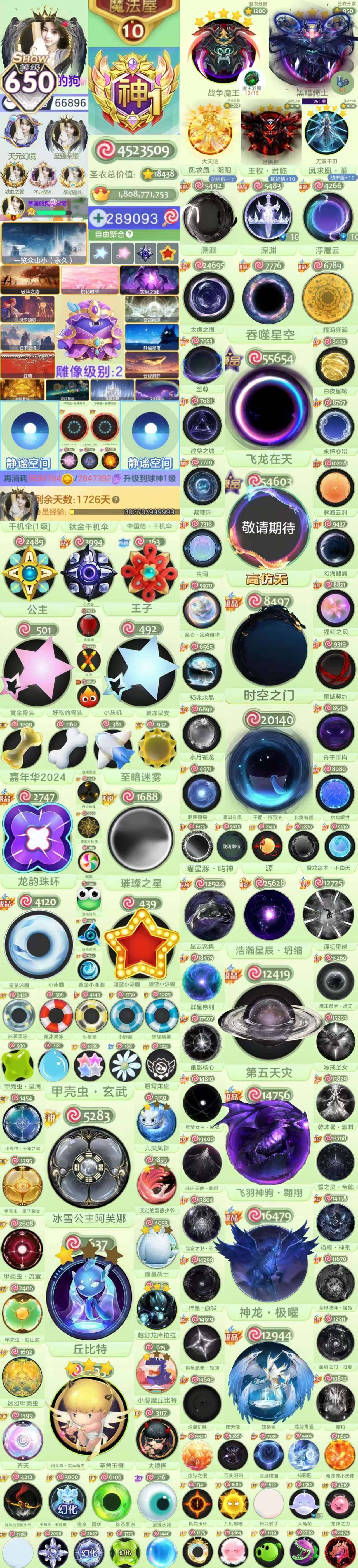 球大作战成品号:等级650,球准神1,魔法屋10级;圣衣价值18438,静谧空间,年卡; 1. 核心光环:吞噬星空、时空之门、王权·君临、深渊、飞龙在天、永恒交错等; 2. 主要配饰:公主、王子光环,黄金小泳圈、湛蓝小泳圈、璀璨之星、千机伞1级、钛金千机伞等; 3. 代表皮肤:第五天灾、神龙·极曜、飞羽神驹·翱翔、混沌魔龙、甲壳虫玄武id66896