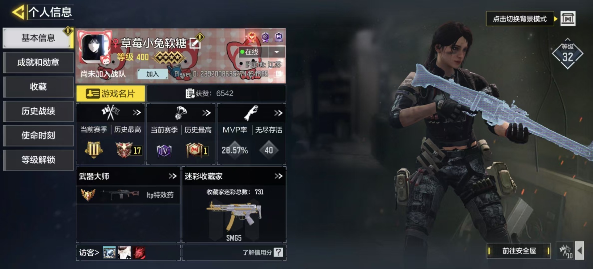400级 7神话 2典藏 22传说 736史诗 段位无 可二次 可修改实名 【典藏呛械】:hg40-灵魂羁绊·典藏sks-粒子震击·典藏 【神话呛械】:smg5-潮海汐月mg42-永别grau 5.56-源核天灾ffar 1-无境空刃m13-黑耀星辰kilo141-暗夜奏鸣曲swi