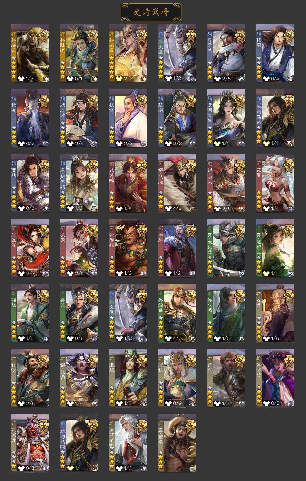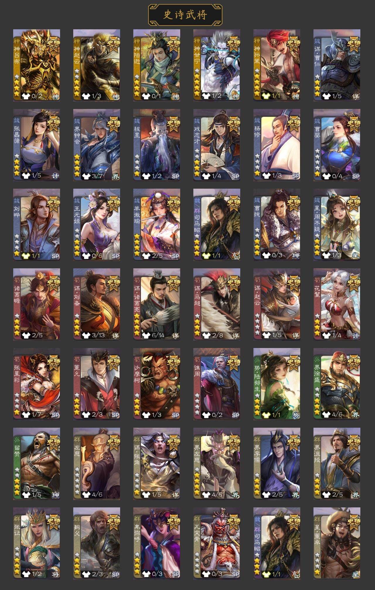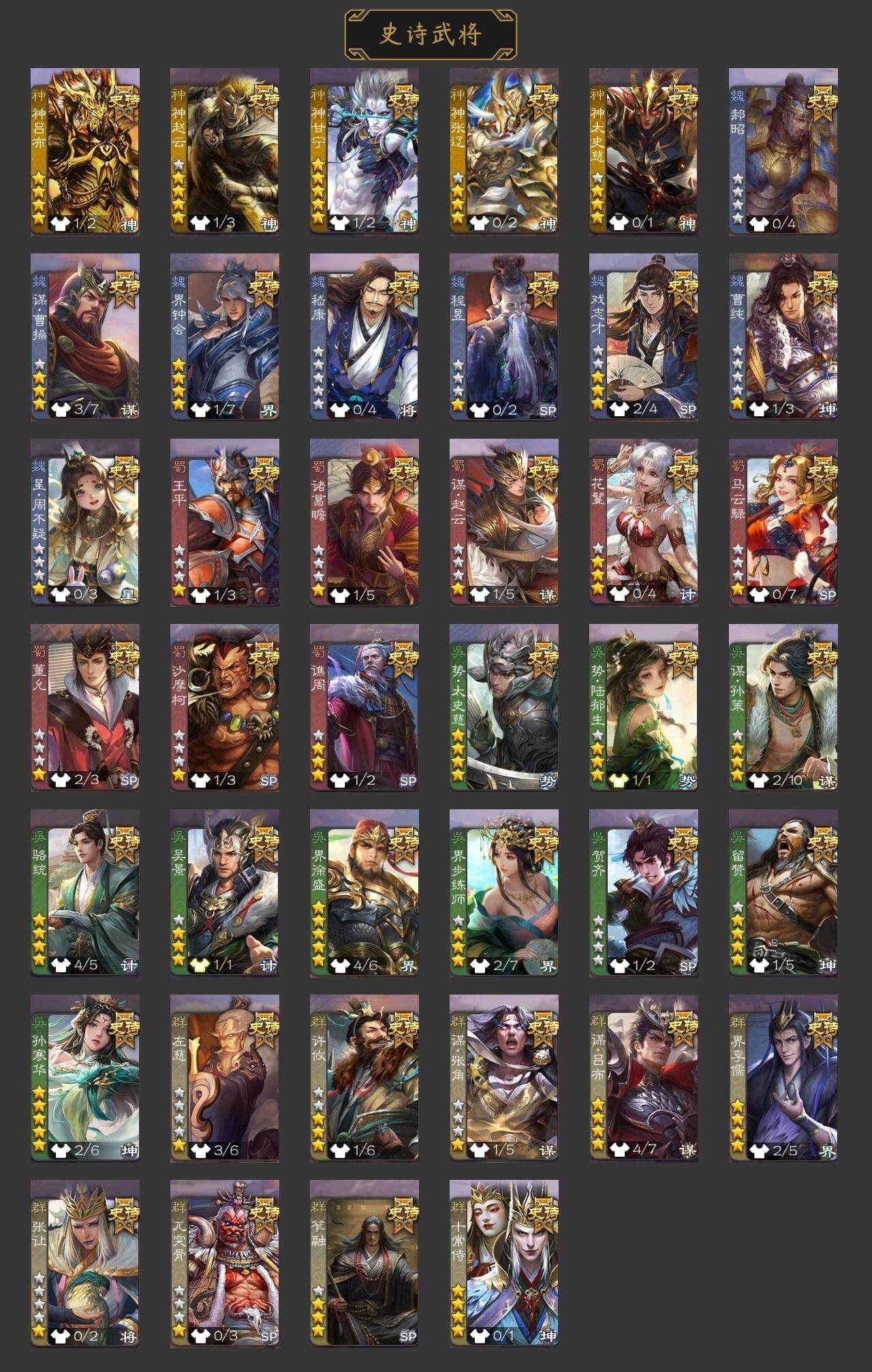 [15177085]【607】官阶:大将军;vip等级:vip10;史诗武将数量:50;动态皮肤数量:32;武将总数:391;史诗宝珠数量:4;将魂数量:5065;神将:9;魏国史诗武将:23;蜀国史诗武将:11;吴国史诗武将:6;群史诗武将:17 神吕布神赵云神司马懿神陆逊神甘宁神张辽神吕蒙神周瑜神诸葛亮曹髦星周不疑王粲文鸯魏-司马昭界钟会界于禁郝昭曹纯戏志才谋曹丕清河公主谋赵云谋马超诸葛瞻赵襄张星彩王平沙摩柯谯周傅佥花鬘董允吴景孙皓留赞界朱然界徐盛贺齐谋黄月英左慈张让星黄忠审配麹义庞德公沮授界左慈界李儒公孙康卑弥呼谋张角李傕阎象许攸友徐庶神张辽-散敌擒孙神司马懿-鉴往知来动态星周不疑-才广志宏动态曹植-龙年中秋动态钟会-潜蛟觊天动态曹丕-气荡山河(动态)甄姬-明珠耀躯(动态)曹丕-龙年中秋动态sp蔡文姬-兔年冬日动态张春华-雪中舞刃动态戏志才-举棋若定动态朱灵-以战破氐动态司马昭-昭威淮南(动态)清河公主-魅影萦心动态花鬘-依心缱绻动态刘备-龙御天下动态卧龙诸葛-龙跃凤鸣动态费祎-安民护祚(动态)马超-虎年冬至动态张飞-据水断桥动态诸葛瞻-绵竹之殇动态界张飞-据水断桥动态张星彩-临军对阵动态周处-义除三害动态陆逊-龙年七夕动态孙权-永开吴祚动态周瑜-兔年七夕动态孙尚香-星流霆击动态界孙尚香-星流霆击动态刘赞-灵魂歌王动态文鸯-势若万钧动态袁绍-声震寰宇动态麹义-扬刀立威动态吕布-傲睨万物动态左慈-役使鬼神动态李儒-鸠杀少帝动态界李儒-鸠杀少帝动态