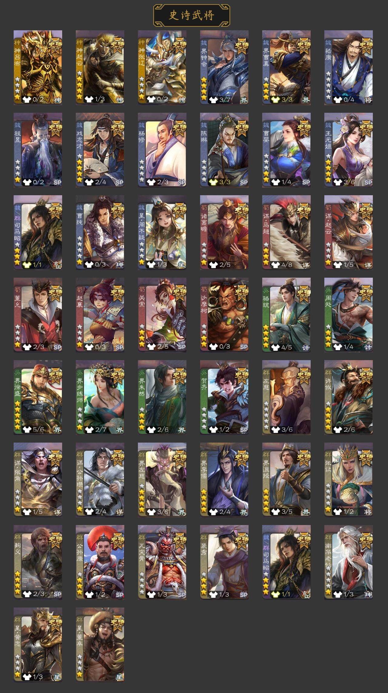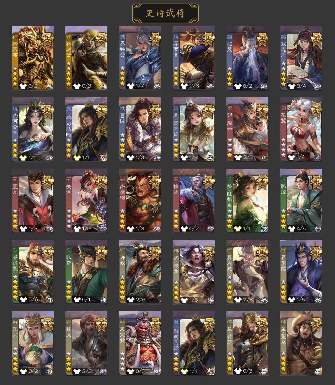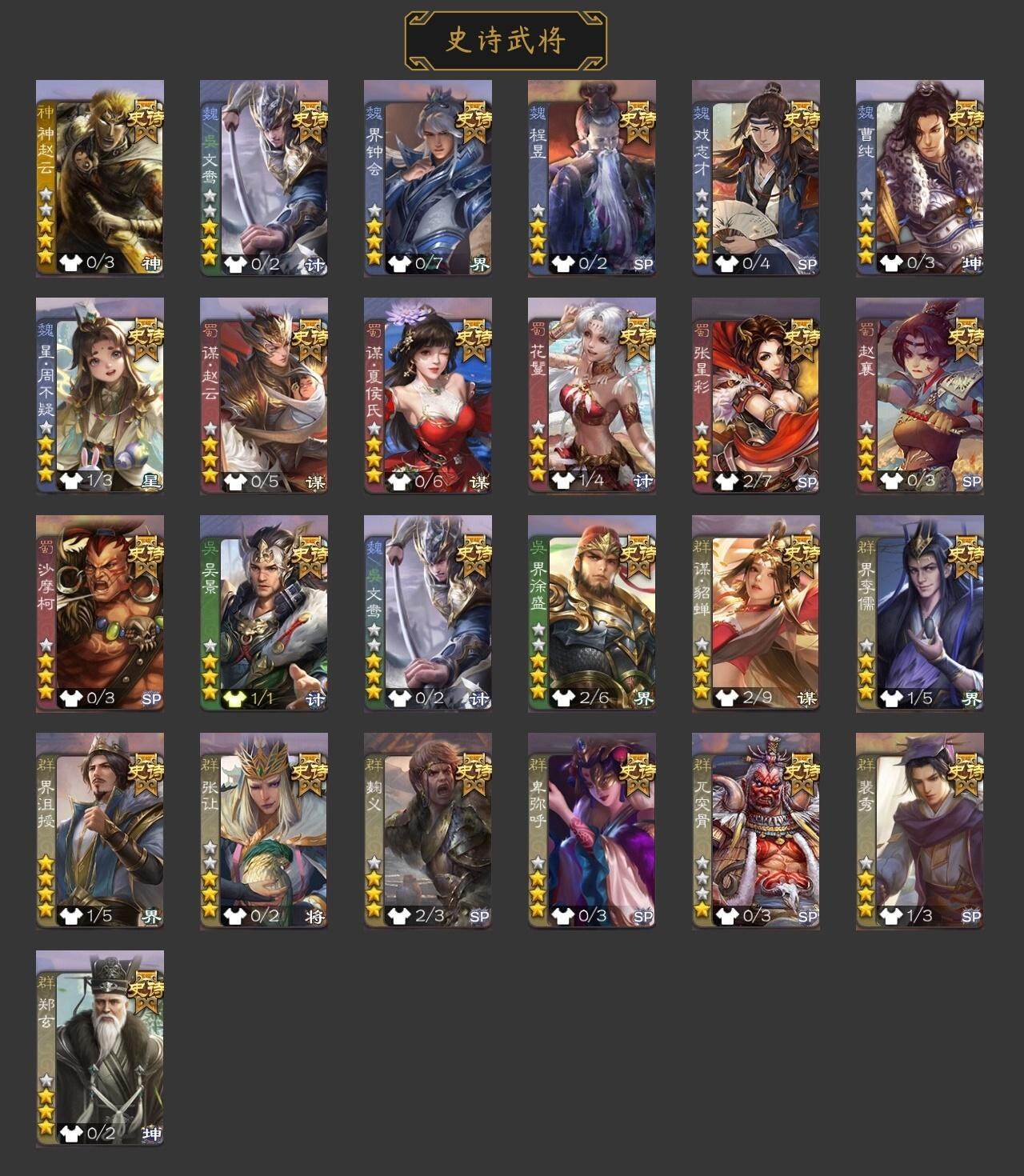[15169212]【627】官阶:大将军;vip等级:vip10;史诗武将数量:43;动态皮肤数量:31;武将总数:381;史诗宝珠数量:0;将魂数量:1240;神将:10;魏国史诗武将:22;蜀国史诗武将:9;吴国史诗武将:5;群史诗武将:14 神吕布神赵云神刘备神甘宁神张辽神关羽神吕蒙神周瑜神诸葛亮神鲁肃王粲杨修司马师界钟会界于禁嵇康陈琳曹纯戏志才关索马云騄谋赵云谋马超诸葛瞻赵襄张星彩王平界黄忠骆统界朱然界徐盛界步练师贺齐左慈张让陶谦司马徽麹义庞德公祢衡沮授界李儒公孙康卑弥呼张绣李傕许攸神刘备-龙兴海内神甘宁-万人辟易动态神吕蒙-兼资文武动态神周瑜-陵光引灵动态神曹操-天下归心神曹操-玄天通冥动态神吕布-监兵噬魅动态神赵云-战龙在野动态钟繇-安民护祚(动态)荀彧-驱虎吞狼动态邓艾-神兵天降动态界邓艾-神兵天降动态张春华-牛年立冬动态钟会-谋谟之勋动态界钟会-谋谟之勋动态戏志才-举棋若定动态杨修-鼠年端午动态曹纯-虎年春节动态王元姬-鼠年冬至动态司马师-牛年中秋动态马超-牛年春节动态诸葛亮-虎年中秋动态魏延-麒麟生角动态界马超-牛年春节动态界魏延-麒麟生角动态马云騄-牛年春节动态赵襄-猪年春节动态关索-鼠年中秋动态李丰-太仓聚粟动态周处-义除三害动态孙权-猪年端午动态大乔-鼠年春分动态大乔-绝世之姿动态孙策-长沙桓王动态小乔-鼠年春分动态界大乔-鼠年春分动态界大乔-绝世之姿动态界孙权-猪年端午动态界小乔-鼠年春分动态界孙策-长沙恒王动态吕布-鼠年七夕动态吕布-傲睨万物动态许攸-盛气凌人动态界吕布-鼠年七夕动态张鲁-虎年冬至动态董白-猪年春节动态祢衡-击鼓骂曹动态