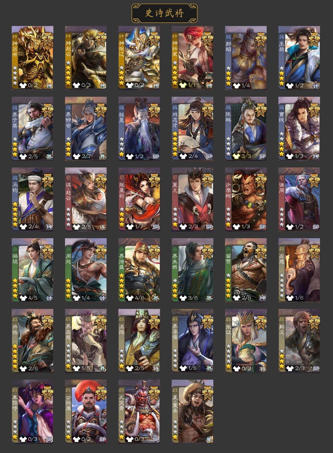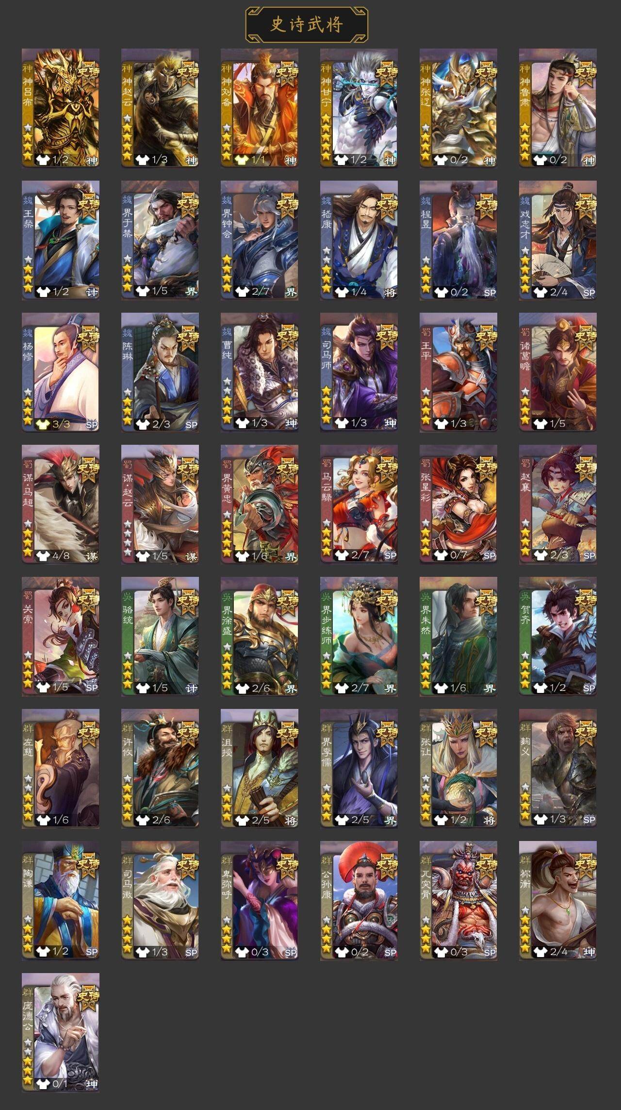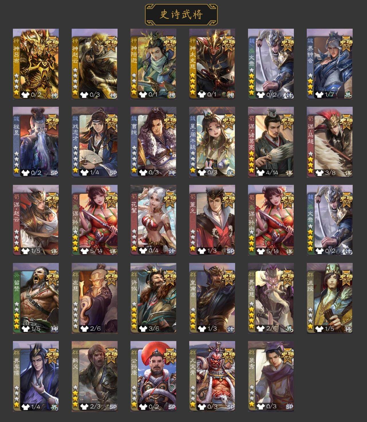 [15169212]【627】官阶:大将军;vip等级:vip10;史诗武将数量:43;动态皮肤数量:31;武将总数:381;史诗宝珠数量:0;将魂数量:1240;神将:10;魏国史诗武将:22;蜀国史诗武将:9;吴国史诗武将:5;群史诗武将:14 神吕布神赵云神刘备神甘宁神张辽神关羽神吕蒙神周瑜神诸葛亮神鲁肃王粲杨修司马师界钟会界于禁嵇康陈琳曹纯戏志才关索马云騄谋赵云谋马超诸葛瞻赵襄张星彩王平界黄忠骆统界朱然界徐盛界步练师贺齐左慈张让陶谦司马徽麹义庞德公祢衡沮授界李儒公孙康卑弥呼张绣李傕许攸神刘备-龙兴海内神甘宁-万人辟易动态神吕蒙-兼资文武动态神周瑜-陵光引灵动态神曹操-天下归心神曹操-玄天通冥动态神吕布-监兵噬魅动态神赵云-战龙在野动态钟繇-安民护祚(动态)荀彧-驱虎吞狼动态邓艾-神兵天降动态界邓艾-神兵天降动态张春华-牛年立冬动态钟会-谋谟之勋动态界钟会-谋谟之勋动态戏志才-举棋若定动态杨修-鼠年端午动态曹纯-虎年春节动态王元姬-鼠年冬至动态司马师-牛年中秋动态马超-牛年春节动态诸葛亮-虎年中秋动态魏延-麒麟生角动态界马超-牛年春节动态界魏延-麒麟生角动态马云騄-牛年春节动态赵襄-猪年春节动态关索-鼠年中秋动态李丰-太仓聚粟动态周处-义除三害动态孙权-猪年端午动态大乔-鼠年春分动态大乔-绝世之姿动态孙策-长沙桓王动态小乔-鼠年春分动态界大乔-鼠年春分动态界大乔-绝世之姿动态界孙权-猪年端午动态界小乔-鼠年春分动态界孙策-长沙恒王动态吕布-鼠年七夕动态吕布-傲睨万物动态许攸-盛气凌人动态界吕布-鼠年七夕动态张鲁-虎年冬至动态董白-猪年春节动态祢衡-击鼓骂曹动态