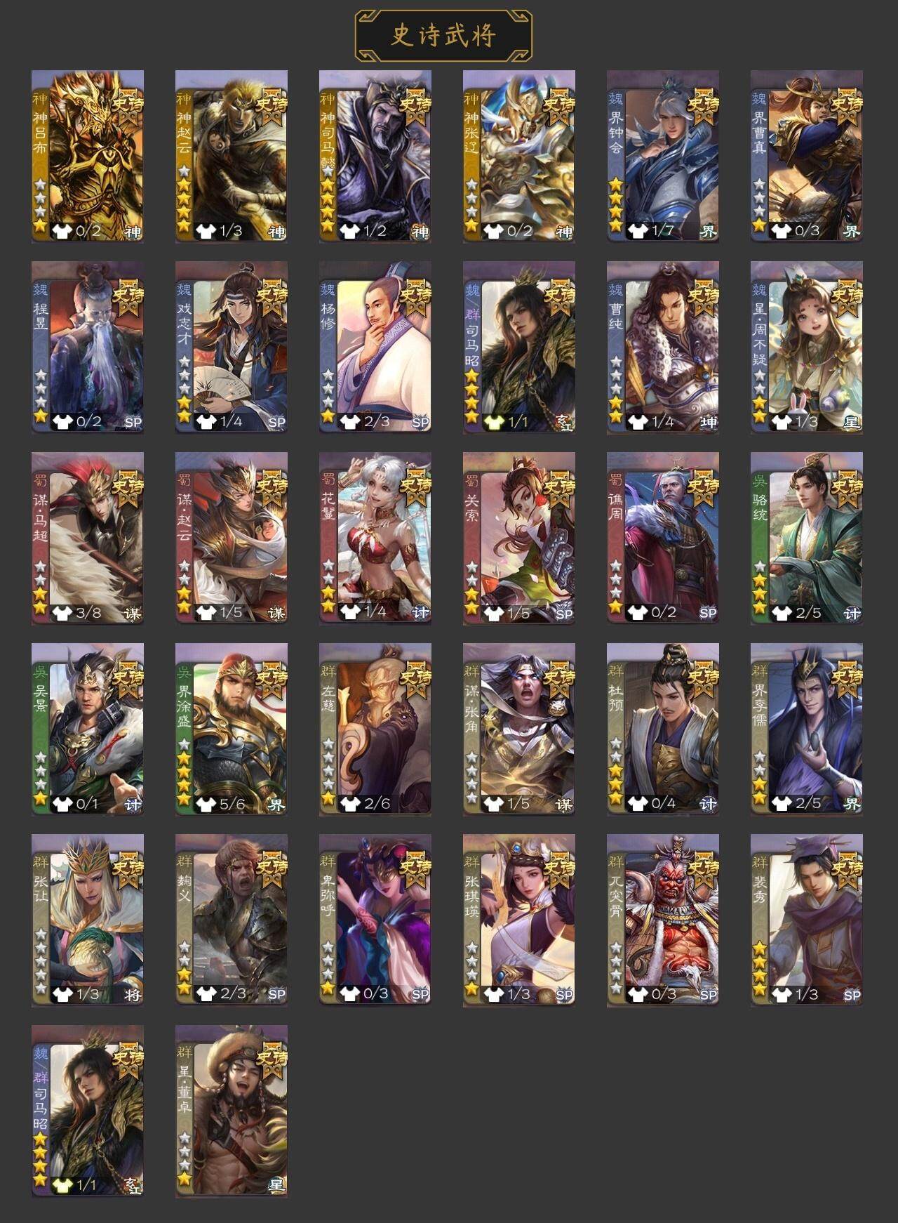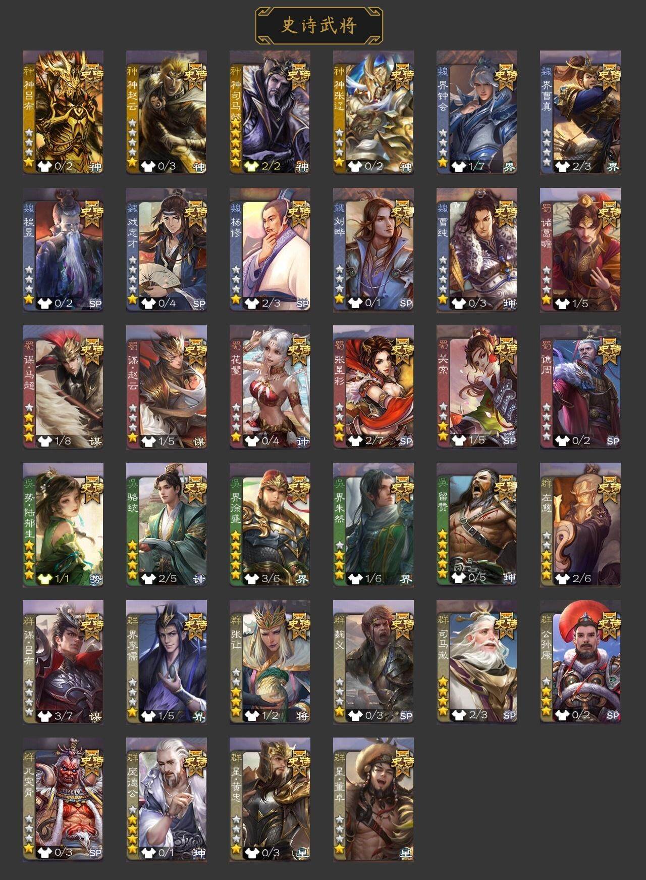 [15169188]【568】官阶:骠骑将军;vip等级:vip6;史诗武将数量:25;动态皮肤数量:9;武将总数:253;史诗宝珠数量:0;将魂数量:1747;神将:5;魏国史诗武将:4;蜀国史诗武将:8;吴国史诗武将:0;群史诗武将:10 神吕布神司马懿神吕蒙神周瑜神诸葛亮文鸯魏-司马昭界钟会郝昭曹纯戏志才马云騄谋赵云谋马超赵襄张星彩沙摩柯谯周花鬘谋黄月英界沮授左慈张让麹义沮授杜预张绣阎象星董卓神司马懿-鉴往知来动态曹植-龙年中秋动态司马昭-昭威淮南(动态)关银屏-兔年春节动态诸葛果-蛇年限定动态周处-义除三害动态麹义-扬刀立威动态杜预-龙吟破竹动态sp赵云-威名尽显动态