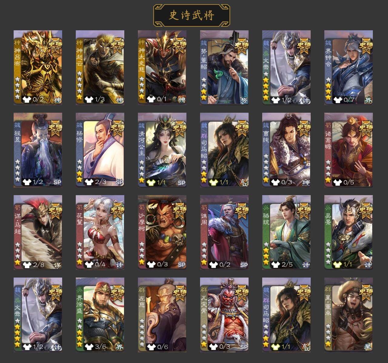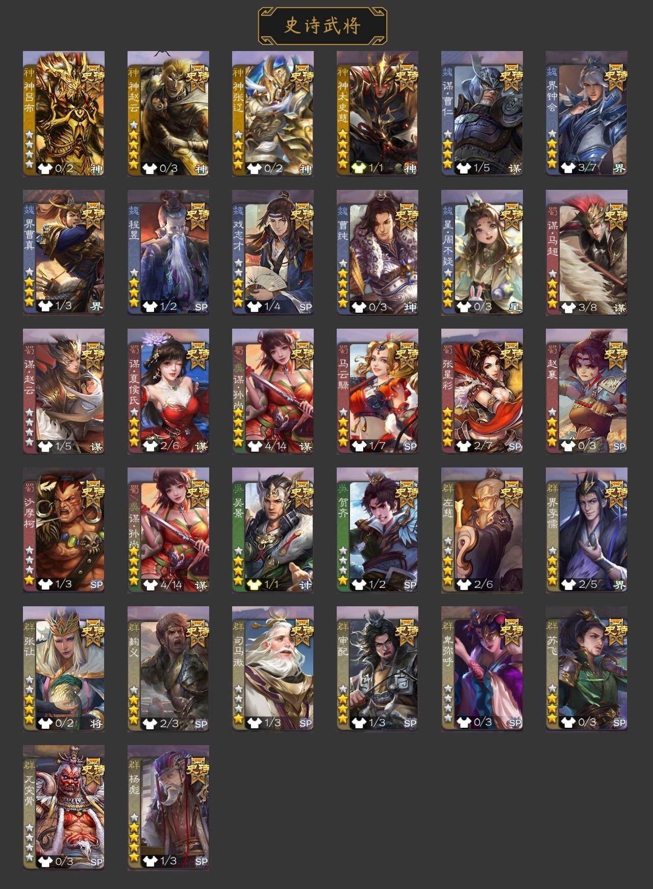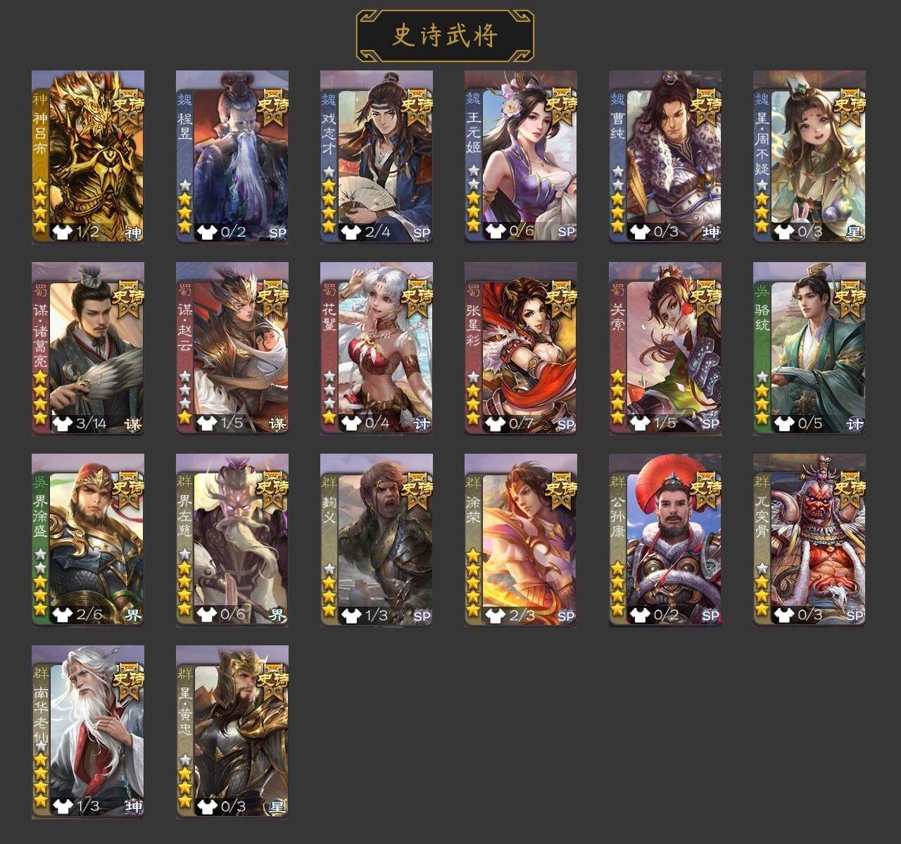 [15168750]【492】官阶:骠骑将军;vip等级:vip6;史诗武将数量:31;动态皮肤数量:19;武将总数:330;史诗宝珠数量:2;将魂数量:16;神将:5;魏国史诗武将:12;蜀国史诗武将:9;吴国史诗武将:2;群史诗武将:9 神吕布神赵云神张辽神太史慈神吕蒙星周不疑谋曹仁界钟会界曹真曹纯戏志才马云騄谋孙尚香谋夏侯氏谋赵云谋马超赵襄张星彩沙摩柯吴景贺齐左慈张让杨彪苏飞司马徽审配麹义界李儒卑弥呼神太史慈-勇撼日月动态曹植-龙年中秋动态许褚-兔年端午动态邓艾-神兵天降动态界邓艾-神兵天降动态钟会-谋谟之勋动态曹真-虎年春节动态界钟会-谋谟之勋动态马超-牛年春节动态诸葛亮-明良千古动态界马超-牛年春节动态界诸葛亮-明良千古动态张星彩-临军对阵动态鲍三娘-虎年七夕动态卧龙诸葛-火烧博望动态周处-义除三害动态孙权-牛年七夕动态界孙权-牛年七夕动态麹义-扬刀立威动态李儒-鸠杀少帝动态界李儒-鸠杀少帝动态杨彪-忧心国事动态皇甫嵩-奋钺振旅动态谋刘赪-冠绝天下动态
