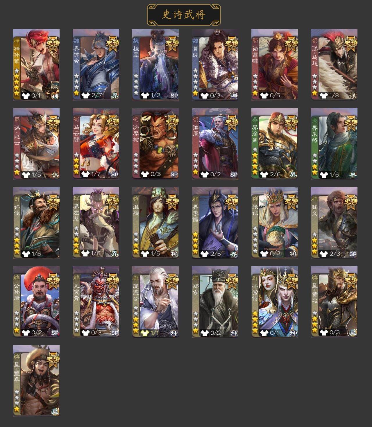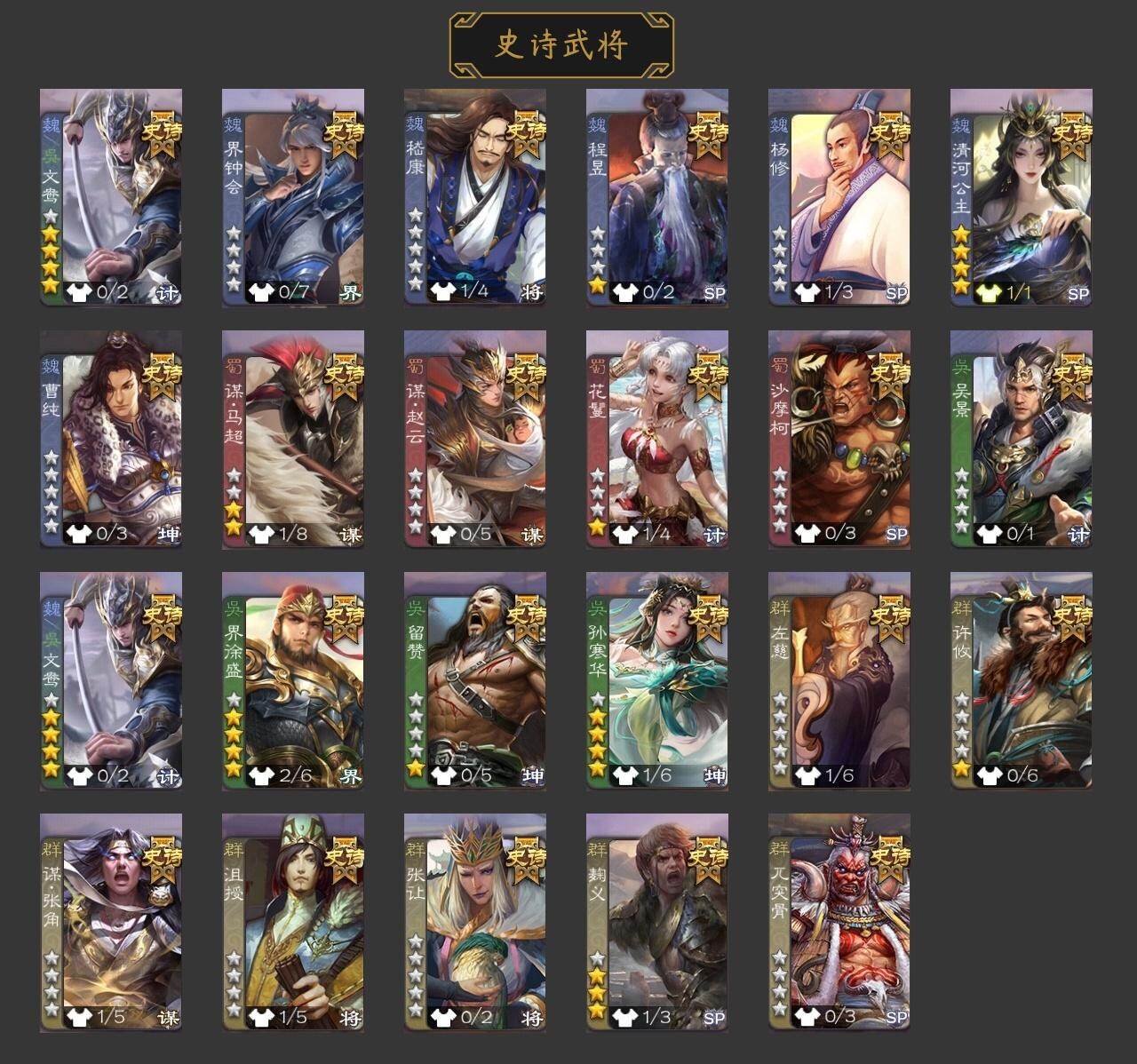[15168677]【397】官阶:大将军;vip等级:vip8;史诗武将数量:32;动态皮肤数量:19;武将总数:347;史诗宝珠数量:6;将魂数量:7715;神将:5;魏国史诗武将:8;蜀国史诗武将:8;吴国史诗武将:6;群史诗武将:10 神赵云神张辽神关羽神周瑜神诸葛亮星周不疑王元姬界钟会界于禁曹纯戏志才谋夏侯氏谋赵云谋马超周群沙摩柯傅佥界黄忠董允吴景留赞界朱然界徐盛界步练师势太史慈裴秀左慈星黄忠麹义沮授界李儒公孙康鲍信李傕许攸曹丕-气荡山河(动态)sp蔡文姬-兔年冬日动态荀彧-驱虎吞狼动态曹纯-虎年春节动态刘备-龙御天下动态卧龙诸葛-龙跃凤鸣动态刘备-明良千古动态马超-牛年春节动态黄月英-明良千古动态界刘备-明良千古动态界马超-牛年春节动态界黄月英-明良千古动态周处-义除三害动态甘宁-劈舟斩浪动态周瑜-兔年七夕动态孙权-吴王六剑动态孙策-长沙桓王动态界孙权-吴王六剑动态界孙策-长沙恒王动态徐盛-破军杀将动态孙茹-烟水悠悠动态刘赞-灵魂歌王动态袁绍-声震寰宇动态张琪瑛-虎年冬至动态庞德公-超脱于世动态