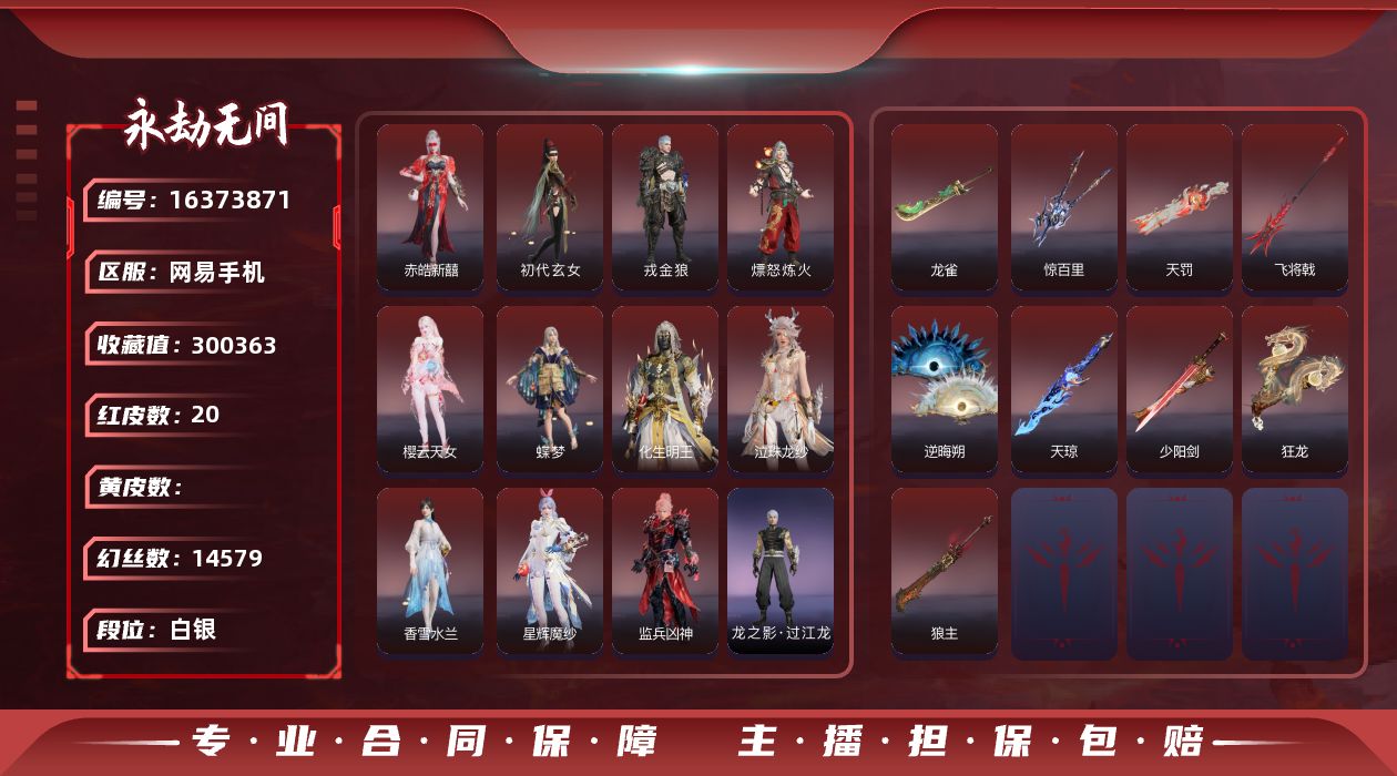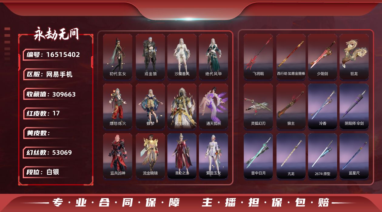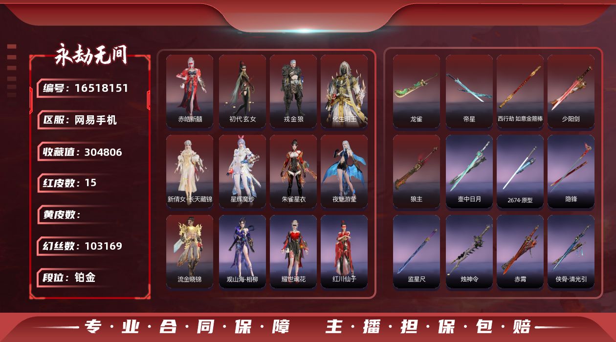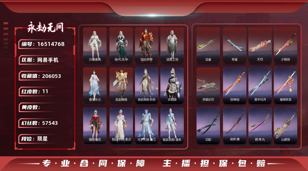 [16518151]0axw15网易手机15个红皮泳装3个【弄潮逐浪(崔三娘),半夏晚风(魏轻),初夏绯莓(沈妙),】奥义特效6个【神君印(岳山),荆魂岳山,初代机(沈妙),神乌造像(天海),楚韵九歌·四海(哈迪),彩佣娃娃(妖刀姬),】下次换绑时间2026/2/29,等待换绑期间可以登入网易大神直接进入游戏不影响游戏体验。网易支付未实名道具货币都是默认已使用.小技能特效4个【剪纸·彩刀(妖刀姬),三娃葫芦(天海),千秋匠心·凶虎(胡为),霜翎哈迪),】岳山杨戬变身器三尖两刃刀全套,武器红皮4个【帝星,西行劫·如意金箍棒,少阳剑,狼主,】其他红皮11个【流金晓锦,龙雀,星辉魔纱,夜魅游莹,赤皓新囍,化生明王,墨离,长天藏锦,朱雀星衣,初代玄女,戎金狼,】观山海·腓腓,杨戬,悟空,唐三,信手斩龙,西行劫·悟净,孽炎祸斗,巨阙,夜华朝,浣烟纱,火罗圣女,观山海·青鸟,千秋匠心·玉叶景,梨园传奇·法海,武道无穷·少林,决战平安京·御神之刃,龙之影·过江龙,常胜袍,司天命,逆水寒·极夜天曦,2674·霜凝雪,藏雨阁主,沐昭,观山海·冬神玄冥,护世四法·持国天王,干将莫邪,观山海·秋神蓐收,黄昏巫主,夜绸袍,2674·千机喵,绮云衫,武道无穷·咏春,楚韵九歌·山鬼,观山海·朱明,西行劫·三尖两刃刀,咯咯,咕咕(连弩),楚韵九歌·四海,葫芦兄弟·蛤蟆头领,封神录·申公豹,观山海·相柳,梨园传奇·柳生,绿野守护·暗沼摩罗,赤雾烟霞,绿野守护·山漠狞影,绿野守护·悠竹萌客,巫师3·杰洛特,九骊之君,决战平安京·恋念私语,