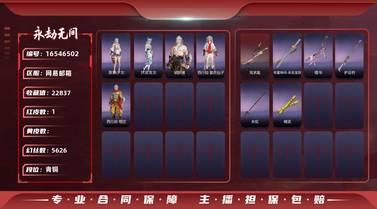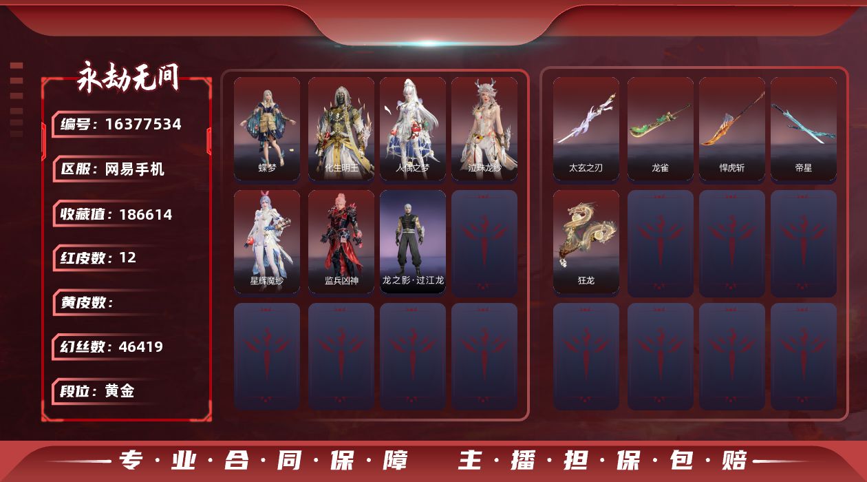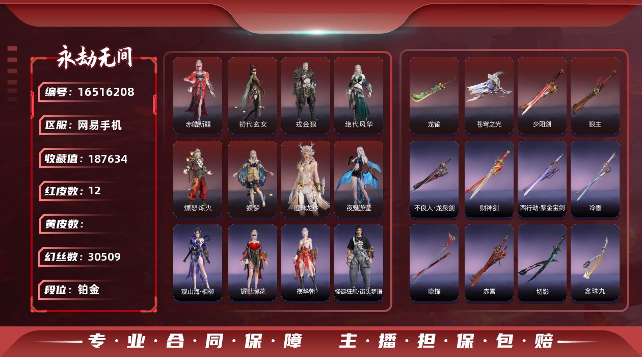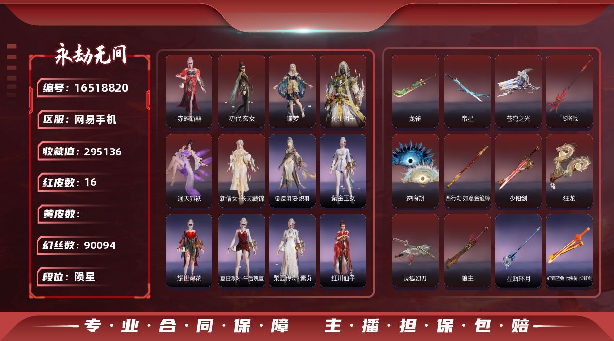 [16518151]0axw15网易手机15个红皮泳装3个【弄潮逐浪(崔三娘),半夏晚风(魏轻),初夏绯莓(沈妙),】奥义特效6个【神君印(岳山),荆魂岳山,初代机(沈妙),神乌造像(天海),楚韵九歌·四海(哈迪),彩佣娃娃(妖刀姬),】下次换绑时间2026/2/29,等待换绑期间可以登入网易大神直接进入游戏不影响游戏体验。网易支付未实名道具货币都是默认已使用.小技能特效4个【剪纸·彩刀(妖刀姬),三娃葫芦(天海),千秋匠心·凶虎(胡为),霜翎哈迪),】岳山杨戬变身器三尖两刃刀全套,武器红皮4个【帝星,西行劫·如意金箍棒,少阳剑,狼主,】其他红皮11个【流金晓锦,龙雀,星辉魔纱,夜魅游莹,赤皓新囍,化生明王,墨离,长天藏锦,朱雀星衣,初代玄女,戎金狼,】观山海·腓腓,杨戬,悟空,唐三,信手斩龙,西行劫·悟净,孽炎祸斗,巨阙,夜华朝,浣烟纱,火罗圣女,观山海·青鸟,千秋匠心·玉叶景,梨园传奇·法海,武道无穷·少林,决战平安京·御神之刃,龙之影·过江龙,常胜袍,司天命,逆水寒·极夜天曦,2674·霜凝雪,藏雨阁主,沐昭,观山海·冬神玄冥,护世四法·持国天王,干将莫邪,观山海·秋神蓐收,黄昏巫主,夜绸袍,2674·千机喵,绮云衫,武道无穷·咏春,楚韵九歌·山鬼,观山海·朱明,西行劫·三尖两刃刀,咯咯,咕咕(连弩),楚韵九歌·四海,葫芦兄弟·蛤蟆头领,封神录·申公豹,观山海·相柳,梨园传奇·柳生,绿野守护·暗沼摩罗,赤雾烟霞,绿野守护·山漠狞影,绿野守护·悠竹萌客,巫师3·杰洛特,九骊之君,决战平安京·恋念私语,