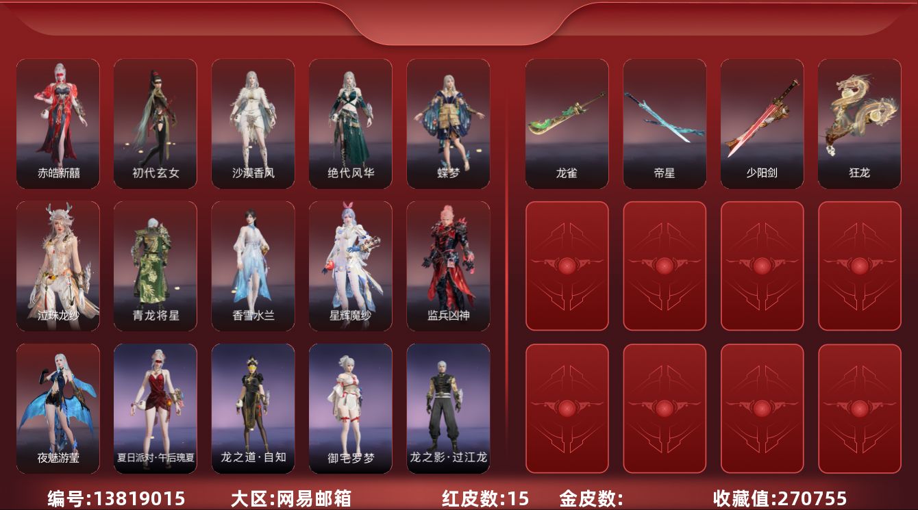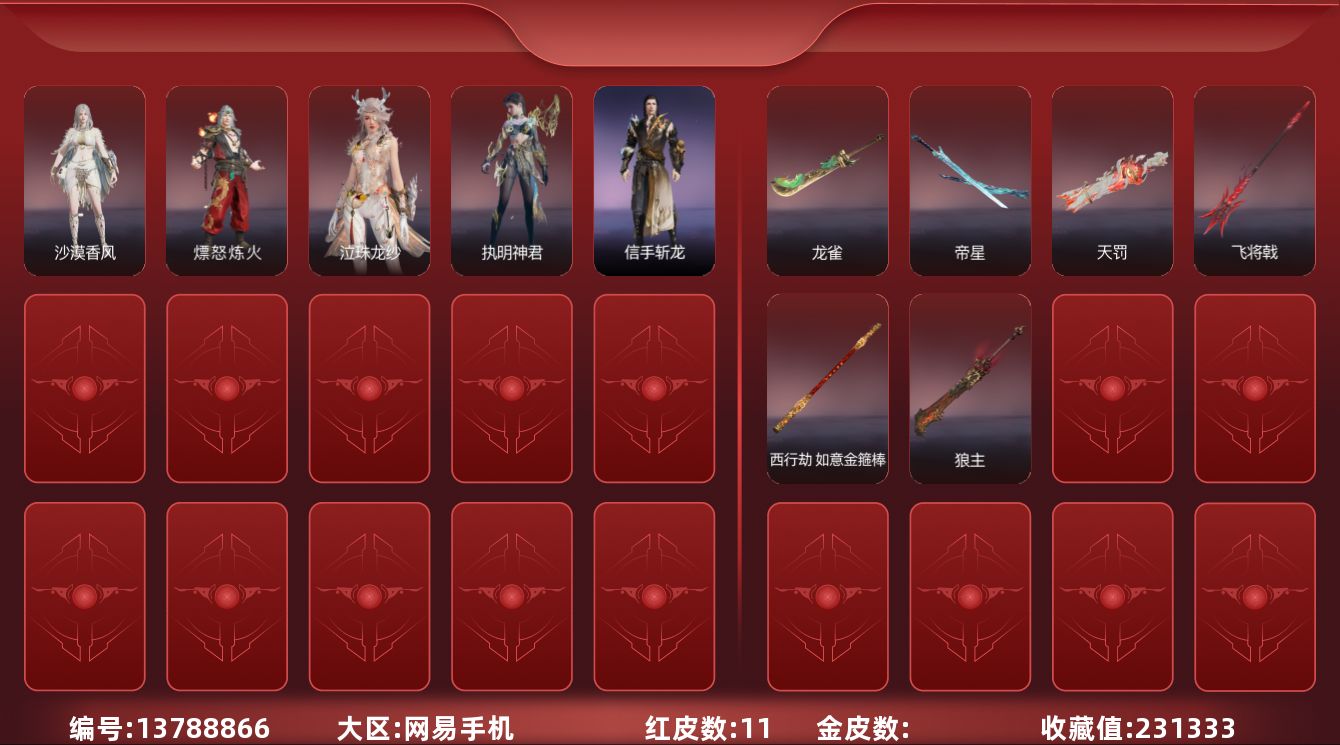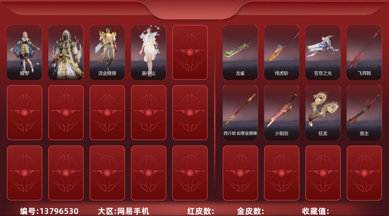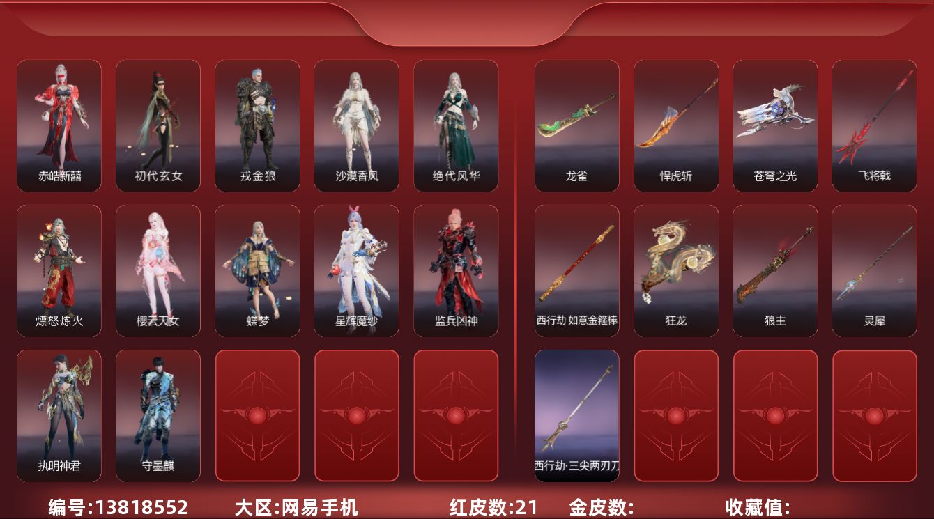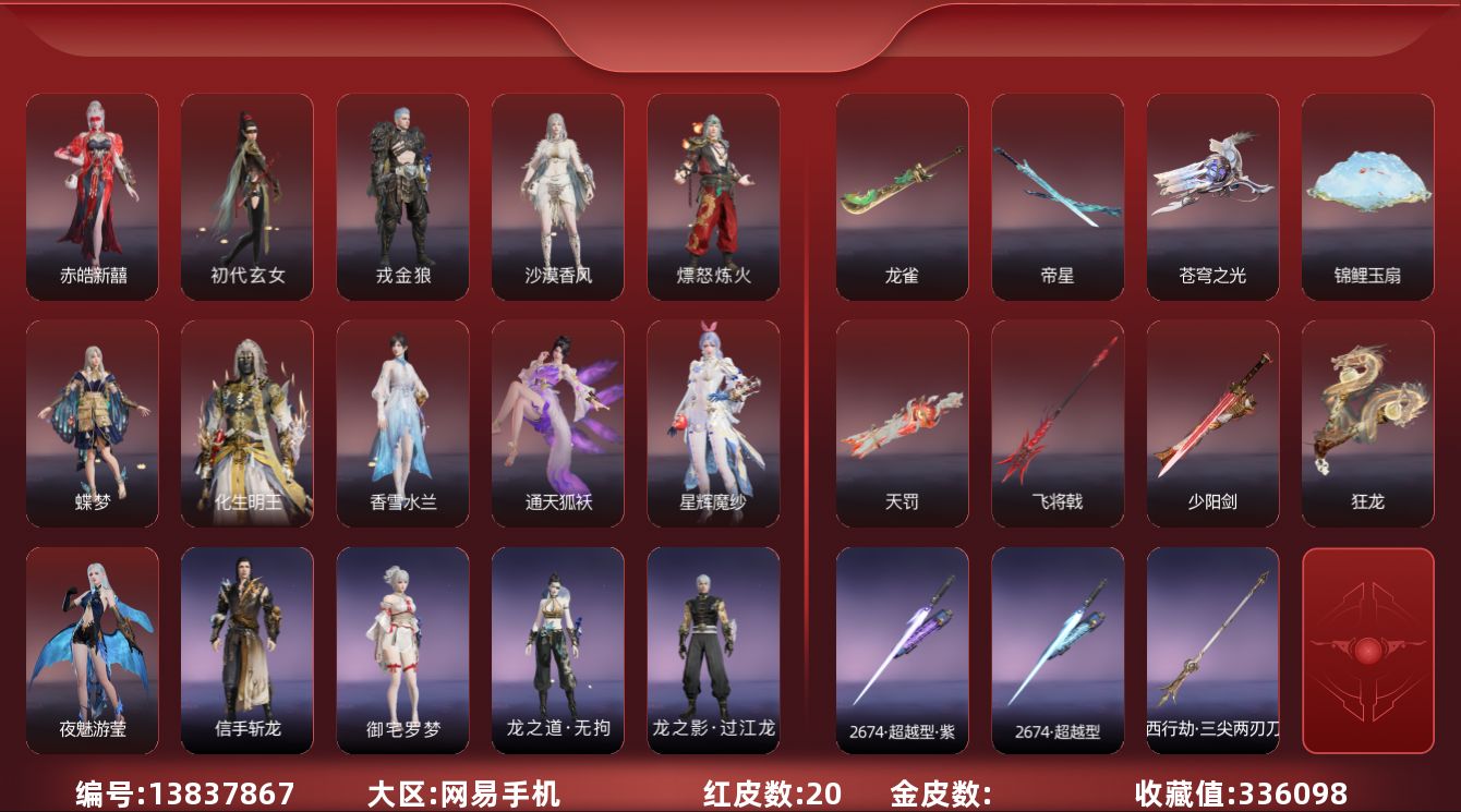 精品小号可刀-6红163金-红皮:-蝶梦-胡桃皮肤-凌霄之羽-无尘皮肤-狼主-阔刀皮肤-狂龙-双节棍皮肤-赤皓新囍-宁红夜皮肤-麒麟魄-拳刃皮肤tb1096宁红夜金皮:-碧水青天红川仙子-特木尔金皮:-沙狼之怒斗罗大陆唐三-迦南金皮:-千秋匠心玉叶景-季沧海金皮:-巨阙-胡桃金皮:-清雅少女贵胄少女春桃笑-天海金皮:-梨园传奇法海-崔三娘金皮:-蛰龙吟赤雾烟霞阿娜希塔-岳山金皮:-弘毅袍开辟鸿蒙金戈止-无尘金皮:-封神录申公豹梨园传奇柳生-玉玲珑金皮:-封神录妲己-顾清寒金皮:-封神录龙吉公主-季莹莹金皮:-干将莫邪-魏轻金皮:-夏日派对半夏晚风-刘炼金皮:-封神录姜子牙-长剑金皮:-含光承影亢龙-太刀金皮:-数珠丸-阔刀金皮:-雷王锯龙蟠破天青石猊-斩马刀金皮:-劫涛潮麒麟牙-长呛金皮:-建木长虹藤魂灵木角-棍金皮:-倒马棍冰辉-匕首金皮:-华夏神兵马首刀仙舞2674战栗-扇金皮:-耀夜流华-双节棍金皮:-精武镇魔杵嘶风槐棘咯咯-双刀金皮:-破重云怨憎蛋仔派对咸鱼古墓丽影登山镐-双戟金皮:-旁通隐天渊-万刃轮金皮:-穷奇-拳刃金皮:-无相印-弓箭金皮:-逆逢豹胎易筋弓乌木弓-远程金皮:-龙啸-火炮-心魔-五眼铳-竹霹雳-火炮-造景-火炮-萤火-鸟铳-钻山-火炮-咕咕-连弩-凝冰魄-五眼统-戏祥云-鸟铳饰品金皮:-业火残红笛-宁红夜右腰-雾隐繁花-宁红夜面部-狼首腰扣-特木尔前腰-福虎帽-胡桃头部-凯旋盔-岳山头部-浮元子-胡桃头部-西行劫神君印-岳山变身器-癸卯-宁红夜左前腰-烈阳羽-玉玲珑左前腰-沐芳花篮-玉玲珑左前腰-逆水寒无烬白-魏轻面部-碎釜-季沧海右后腰-窥鲸镜-哈迪右前腰-避彩-魏轻面部-楚韵九歌灵皇-哈迪面部-楚韵九歌洞庭波-崔三娘右后腰-熔金峰-刘炼右前腰-几何钥-哈迪右前腰-粽香远-胡桃头部-安歌帽-崔三娘头部-封神录捆龙索-顾清寒右腰-封神录霞彩-顾清寒面部-梦棠-玉玲珑头部-封神录倾城-玉玲珑头部-封神录封神榜-刘炼左前腰-盗墓笔记防风帽-张起灵头部-夜露帽-张起灵头部-盗墓笔记青铜神树-张起灵右后腰-