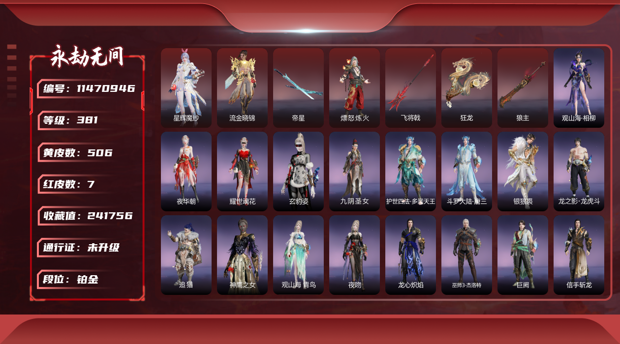 [11436384]0adrp9网易手机9个红皮泳装4个【椰风夕照(季沧海),长夏清澜(殷紫萍),盛夏白阳(季莹莹),赤夏悠漾(玉玲珑),】奥义特效6个【神君印(岳山),百战·枷锁(魏轻),噬骨哈迪),镇冥司刘炼),雪霜姿顾清寒),夜蔷薇(季莹莹),】网易年超限,等待换绑期间可以登入网易大神直接进入游戏不影响游戏体验。网易支付未实名道具货币都是默认已使用.小技能特效3个【千秋匠心·凶虎(胡为),霜翎哈迪),拳皇·勾玉胡为),】岳山杨戬变身器三尖两刃刀全套,武器红皮4个【帝星,飞将戟,少阳剑,苍穹之光,】其他红皮5个【星辉魔纱,泣珠龙纱,蝶梦,凌霄之羽,绝代风华,】春桃笑,观山海·腓腓,杨戬,悟空,春日序曲·赤羽,唐三,庖丁·食神,信手斩龙,孽炎祸斗,百战·破荆者,观山海·夏神祝融,逆水寒·染烟,护世四法·增长天王,龙之道·自知,浣烟纱,夜吻,春桃笑,阴阳师·灼舞桃节,龙之影·过江龙,龙之道·无拘,逆水寒·极夜天曦,花之倾奇,击浪,英雄袍,街头狂欢·不败擂主,千秋匠心·杜虎符,西行劫·三尖两刃刀,2674·争斗洪流,咯咯,咕咕(连弩),葫芦兄弟·蛤蟆头领,封神录·申公豹,封神录·龙吉公主,封神录·姜子牙,观山海·相柳,铸神·天渊御水,观山海·獬豸,观山海·精卫,铸神·天禄瑞光,盗墓笔记·黑金古刀,盗墓笔记·越野帽衫,古冢行,封神录·敖丙,封神录·哪吒,绿野守护·暗沼摩罗,赤雾烟霞,羽影,绿野守护·山漠狞影,绿野守护·悠竹萌客,拳皇·不知火舞,巫师3·杰洛特,九骊之君,决战平安京·恋念私语