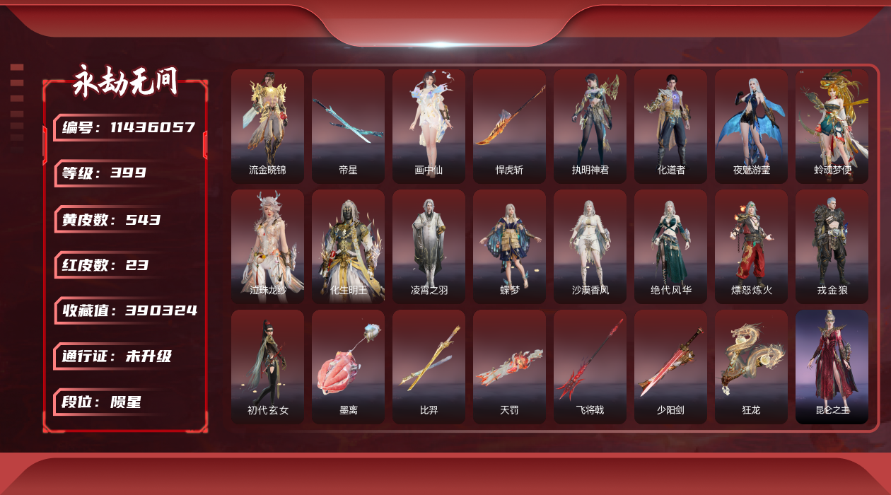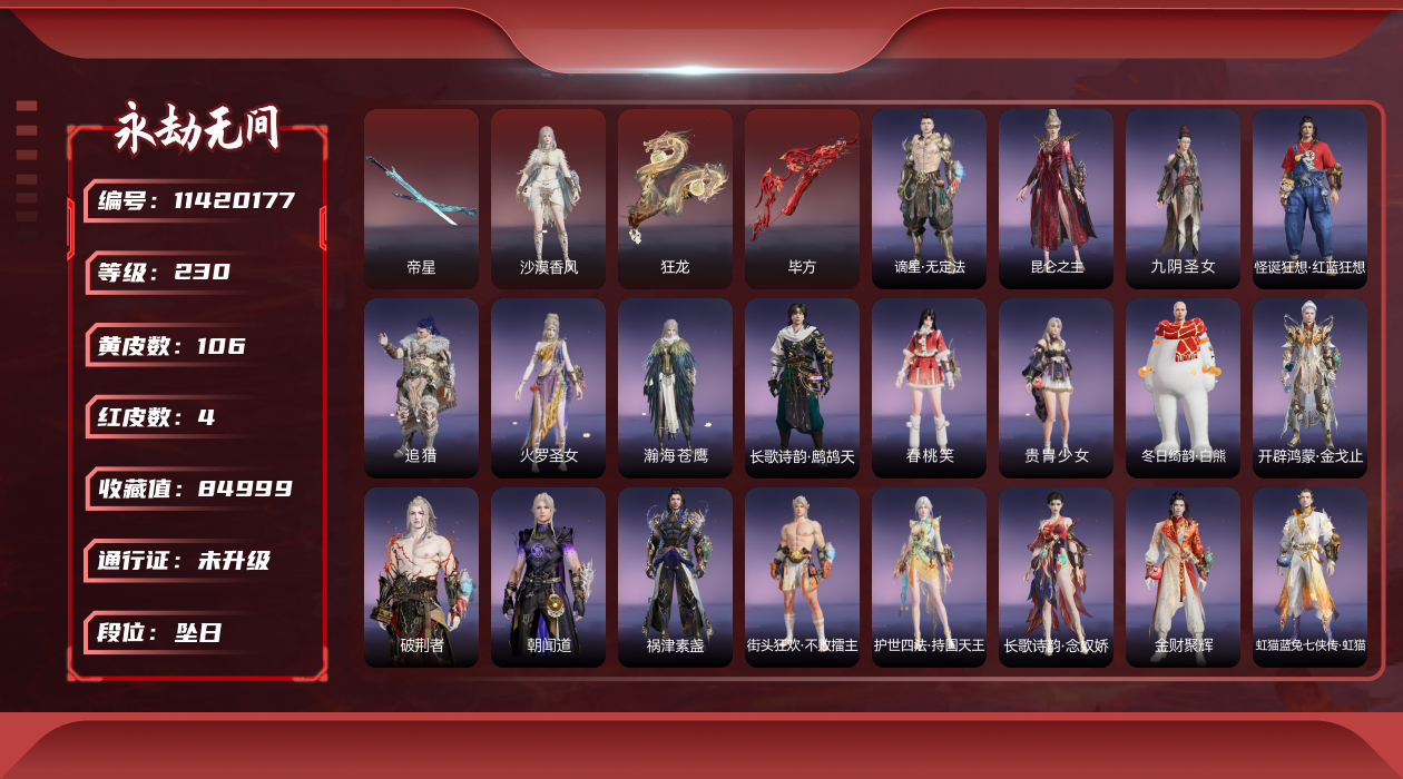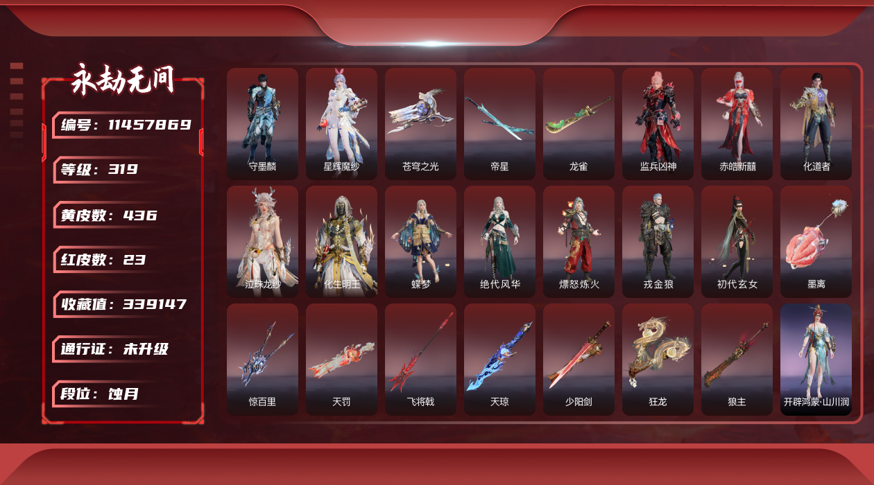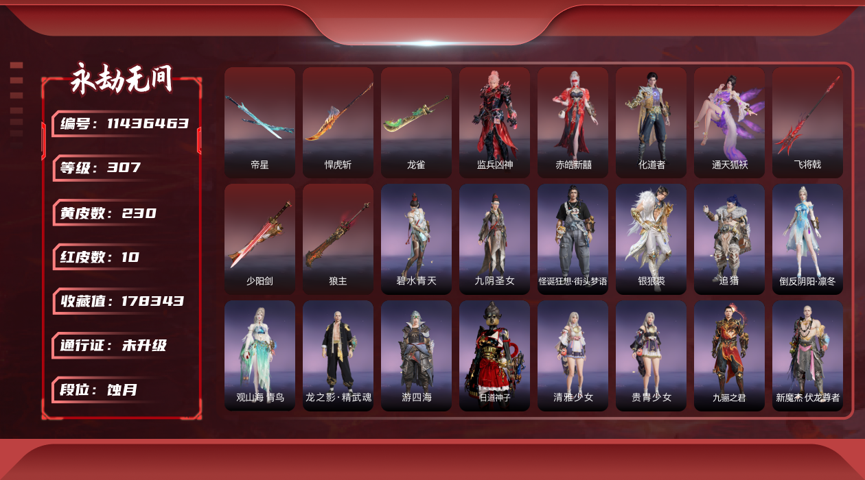 在榜国服第三-天人在榜63-谪星长剑不跟号出哈dcy33578红皮数:-62-金皮数量:-1677-幻丝数:-12486-等级:-627-版本:-标准版-谪星红皮:-谪星炽魂-谪星金皮:-谪星沧澜绡-红皮:-墨离-飞索皮肤-初代玄女-宁红叶皮肤-戎金狼-特木尔皮肤-绝代风华-迦南皮肤-沙漠香风-迦南皮肤-熛怒炼火-季沧海皮肤-蝶梦-胡桃皮肤-海之奇-崔三娘皮肤-青龙将星-岳山皮肤-凌霄之羽-无尘皮肤-香雪水兰-顾清寒皮肤-冰魄-长剑皮肤-灵狐幻刃-太刀皮肤-狼主-阔刀皮肤-灵犀-长呛皮肤-毕方-弓箭皮肤-暮光胴丸-武田信忠皮肤-凤求凰-双刀皮肤-长天藏锦-殷紫萍皮肤-烈阳-阔刀皮肤-少阳剑-长剑皮肤-狂龙-双节棍皮肤-化生明王-天海皮肤-泣珠龙纱-崔三娘皮肤-朱雀星衣-沈妙皮肤-涯角-呛皮肤-蛉魂梦使-妖刀姬皮肤-2674九阴-太刀皮肤-夜魅游莹-季莹莹皮肤-西行劫如意金箍棒-棍皮肤-通天狐袄-玉玲珑皮肤-天琼-匕首皮肤-逆晦朔-扇皮肤-化道者-哈迪皮肤-赤皓新囍-宁红夜皮肤-飞将戟-斩马刀皮肤-天罚-火炮皮肤-监兵凶神-胡为皮肤-比羿-横刀皮肤-执明神君-魏轻皮肤-樱云天女-胡桃皮肤-惊百里-双戟皮肤-2674终极型-长剑皮肤-2674终极型紫-长剑皮肤-2674终极型红-长剑皮肤-守墨麒-张起灵皮肤-麒麟魄-拳刃皮肤-初樱绮梦-胡桃发型-逐光者-席拉皮肤-锦鲤玉扇-扇皮肤-星辉魔纱-沈妙皮肤-流金晓锦-刘炼皮肤-苍穹之光-五眼铳皮肤-帝星-横刀皮肤-画中仙-蓝梦皮肤-悍虎斩-斩马刀皮肤-狱炎烬甲-季沧海皮肤-赤帝炎轮-飞刀皮肤-龙雀-阔刀皮肤宁红夜金皮:-雪山天女碧水青天昆仑圣女九阴圣女龙之道自知红川仙子魔杰傲昆仑紫金玉女梨园传奇素贞夏日派对午后瑰夏玄豹姿2674嘉斯威珀西行劫蜘蛛精耀世魂花自动人形2b夜华朝观山海相柳拳皇夏尔美开辟鸿蒙山川润-特木尔金皮:-沙狼之怒狂狼之主苍狼之主狂猎追猎龙之影龙虎斗魔杰啸天狼噬月天狼银狼裘斗罗大陆唐三护世四法多闻天王铸神冥天魂使沙暴苍狼铸神谭栩杰-迦南金皮:-金羽圣鹰月轮魅影璨银魔枭瀚海苍鹰花无痕蜃楼魅影龙之道求真浣烟纱轩辕剑拓跋玉儿惊云