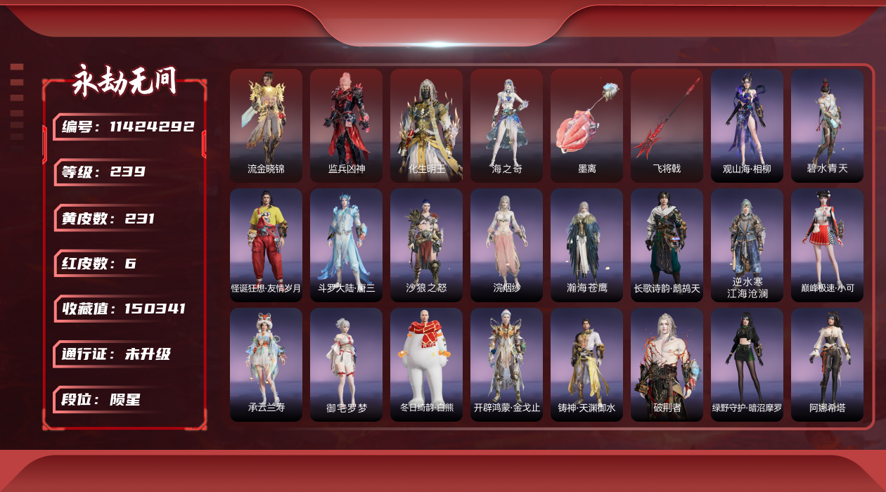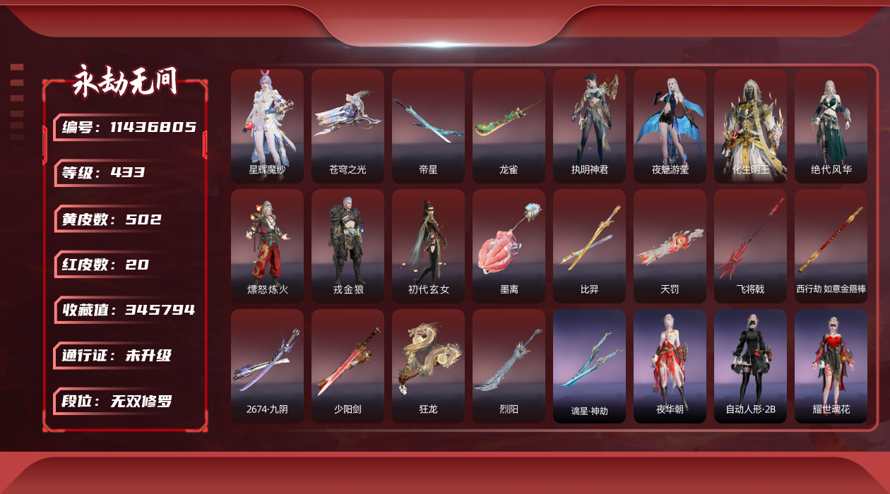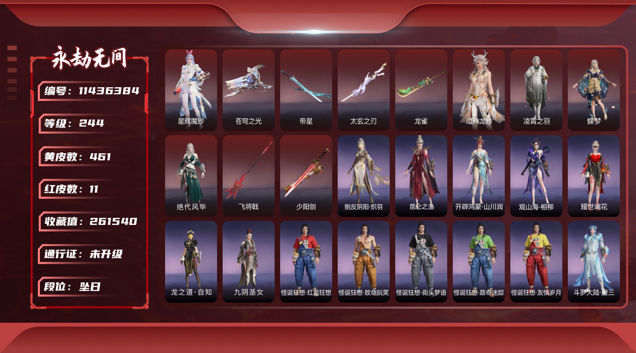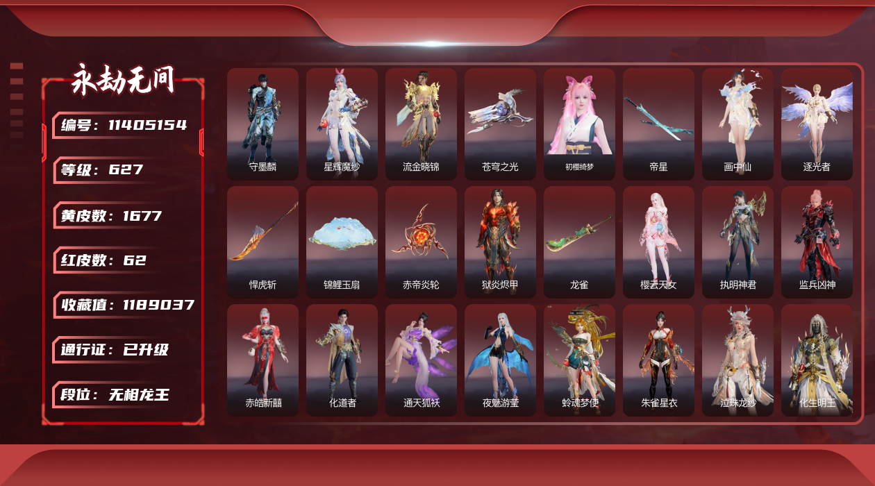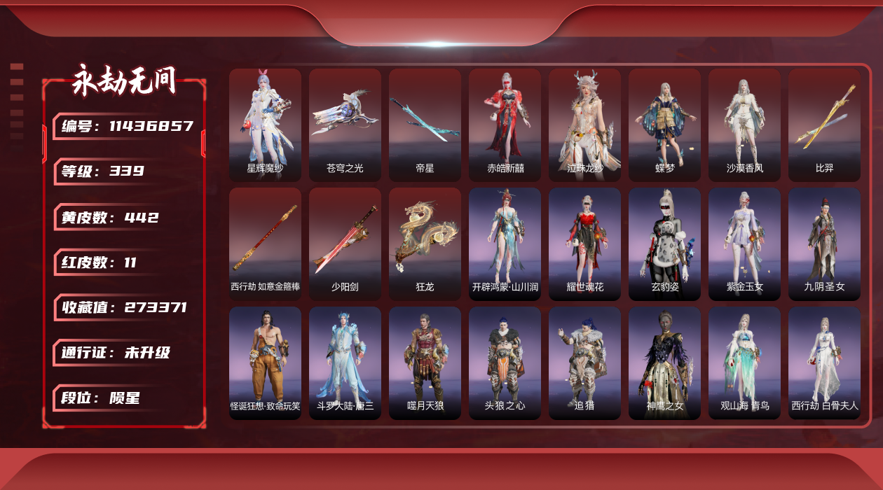 在榜国服第三-天人在榜63-谪星长剑不跟号出哈dcy33578红皮数:-62-金皮数量:-1677-幻丝数:-12486-等级:-627-版本:-标准版-谪星红皮:-谪星炽魂-谪星金皮:-谪星沧澜绡-红皮:-墨离-飞索皮肤-初代玄女-宁红叶皮肤-戎金狼-特木尔皮肤-绝代风华-迦南皮肤-沙漠香风-迦南皮肤-熛怒炼火-季沧海皮肤-蝶梦-胡桃皮肤-海之奇-崔三娘皮肤-青龙将星-岳山皮肤-凌霄之羽-无尘皮肤-香雪水兰-顾清寒皮肤-冰魄-长剑皮肤-灵狐幻刃-太刀皮肤-狼主-阔刀皮肤-灵犀-长呛皮肤-毕方-弓箭皮肤-暮光胴丸-武田信忠皮肤-凤求凰-双刀皮肤-长天藏锦-殷紫萍皮肤-烈阳-阔刀皮肤-少阳剑-长剑皮肤-狂龙-双节棍皮肤-化生明王-天海皮肤-泣珠龙纱-崔三娘皮肤-朱雀星衣-沈妙皮肤-涯角-呛皮肤-蛉魂梦使-妖刀姬皮肤-2674九阴-太刀皮肤-夜魅游莹-季莹莹皮肤-西行劫如意金箍棒-棍皮肤-通天狐袄-玉玲珑皮肤-天琼-匕首皮肤-逆晦朔-扇皮肤-化道者-哈迪皮肤-赤皓新囍-宁红夜皮肤-飞将戟-斩马刀皮肤-天罚-火炮皮肤-监兵凶神-胡为皮肤-比羿-横刀皮肤-执明神君-魏轻皮肤-樱云天女-胡桃皮肤-惊百里-双戟皮肤-2674终极型-长剑皮肤-2674终极型紫-长剑皮肤-2674终极型红-长剑皮肤-守墨麒-张起灵皮肤-麒麟魄-拳刃皮肤-初樱绮梦-胡桃发型-逐光者-席拉皮肤-锦鲤玉扇-扇皮肤-星辉魔纱-沈妙皮肤-流金晓锦-刘炼皮肤-苍穹之光-五眼铳皮肤-帝星-横刀皮肤-画中仙-蓝梦皮肤-悍虎斩-斩马刀皮肤-狱炎烬甲-季沧海皮肤-赤帝炎轮-飞刀皮肤-龙雀-阔刀皮肤宁红夜金皮:-雪山天女碧水青天昆仑圣女九阴圣女龙之道自知红川仙子魔杰傲昆仑紫金玉女梨园传奇素贞夏日派对午后瑰夏玄豹姿2674嘉斯威珀西行劫蜘蛛精耀世魂花自动人形2b夜华朝观山海相柳拳皇夏尔美开辟鸿蒙山川润-特木尔金皮:-沙狼之怒狂狼之主苍狼之主狂猎追猎龙之影龙虎斗魔杰啸天狼噬月天狼银狼裘斗罗大陆唐三护世四法多闻天王铸神冥天魂使沙暴苍狼铸神谭栩杰-迦南金皮:-金羽圣鹰月轮魅影璨银魔枭瀚海苍鹰花无痕蜃楼魅影龙之道求真浣烟纱轩辕剑拓跋玉儿惊云